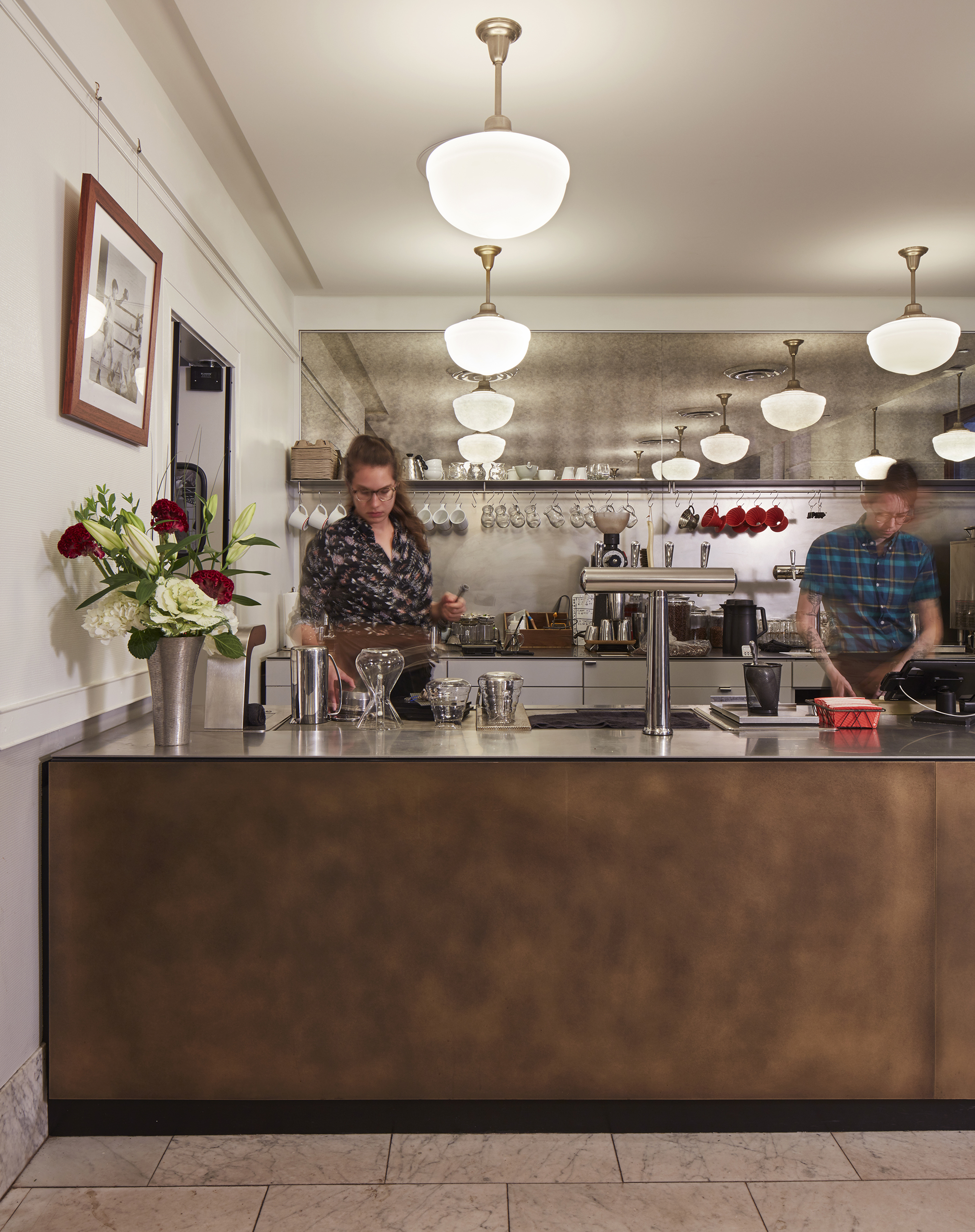 Inspired by materials found in the historic building, new contemporary surfaces and detailing update and refresh the space while remaining sensitive to the existing white marble and dark stained window frames. Clad in bronze to complement existing café hardware, the service bar is held off the floor and away from the wall, expressed as a free-standing contemporary intervention that lets the traditional walls remain as they are. New high-performing stainless-steel countertops are designed with flush drain trays and microgrills for an improved, entirely integrated working surface. A completely clear glass pastry case floats above the bar, and extends to become a sneeze guard for the espresso area. Behind the bar, a brushed stainless backsplash and a frameless textured mirror help brighten and add visual depth to the space. The stainless steel and mirrored back wall recall the materials in the lobby of the Monadnock that enclose the elevator shafts.