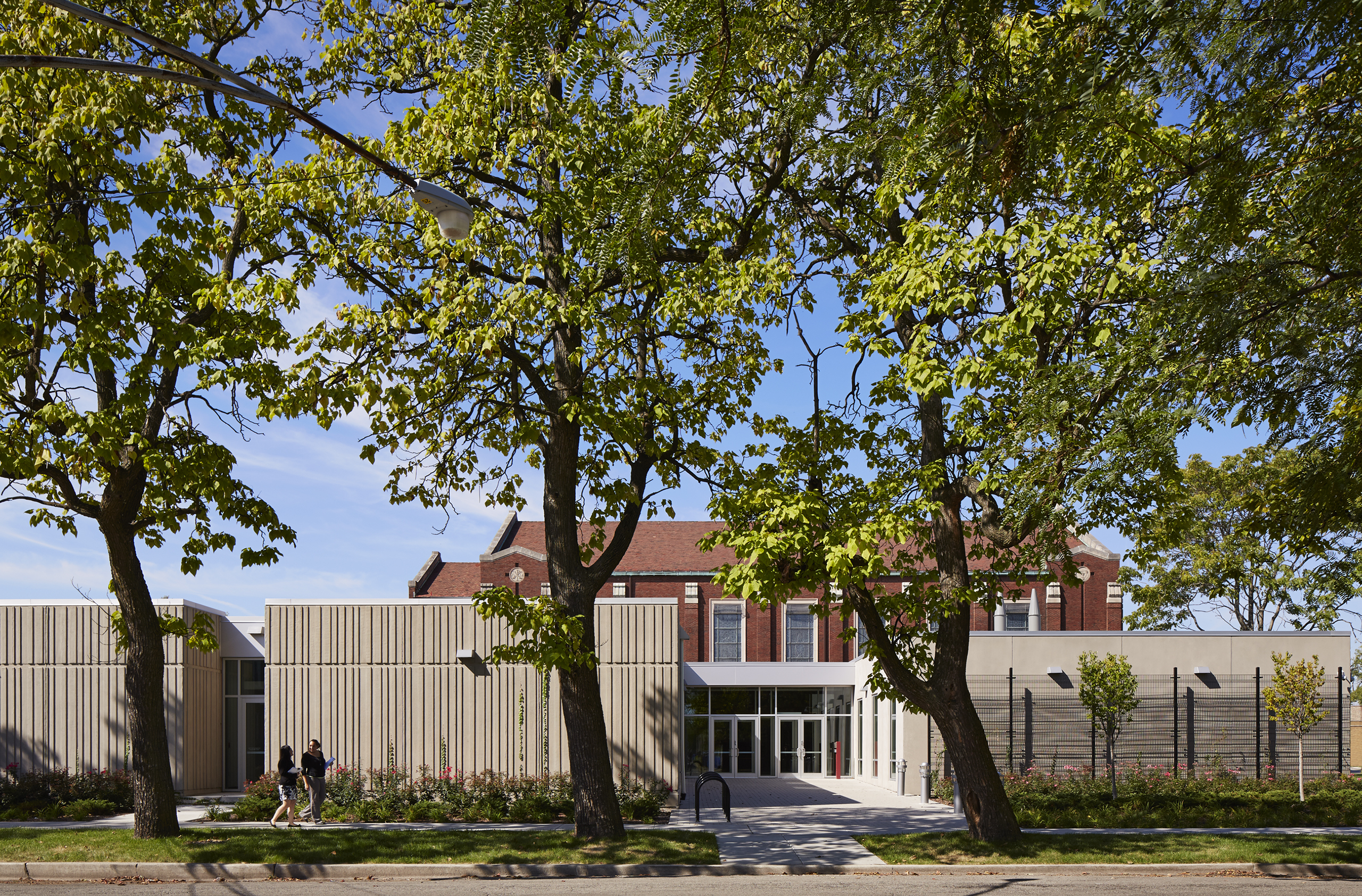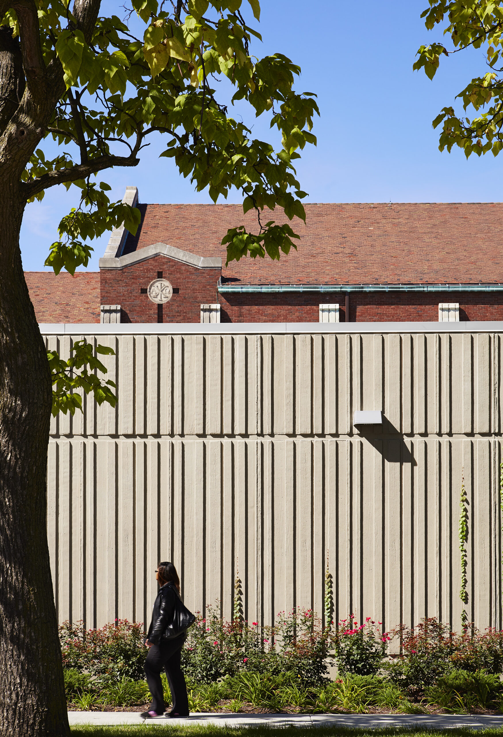 A single-story addition, punctuated by three street-facing courtyards, quadruples the size of the former school building, redeveloping a site formerly pockmarked by broken pavement and abandoned foundations.
