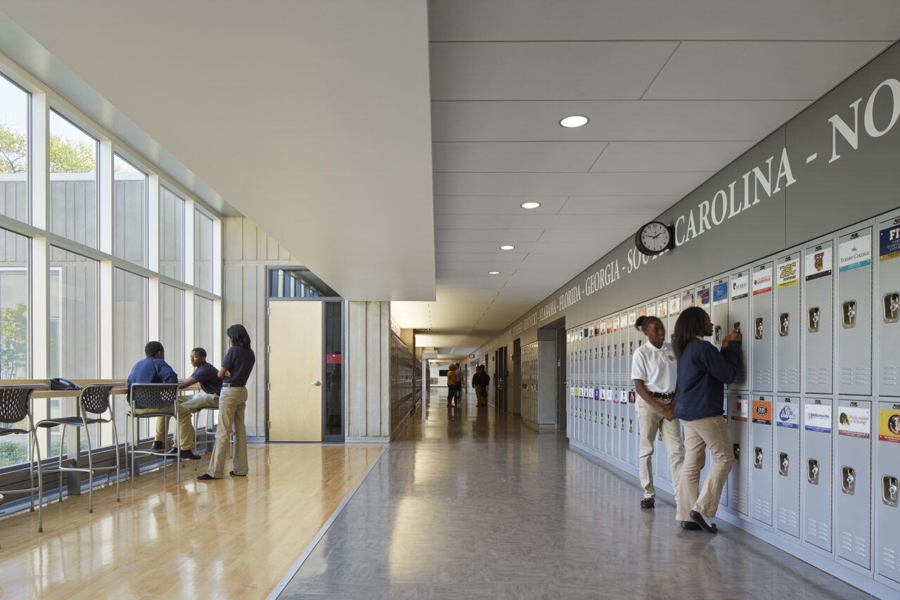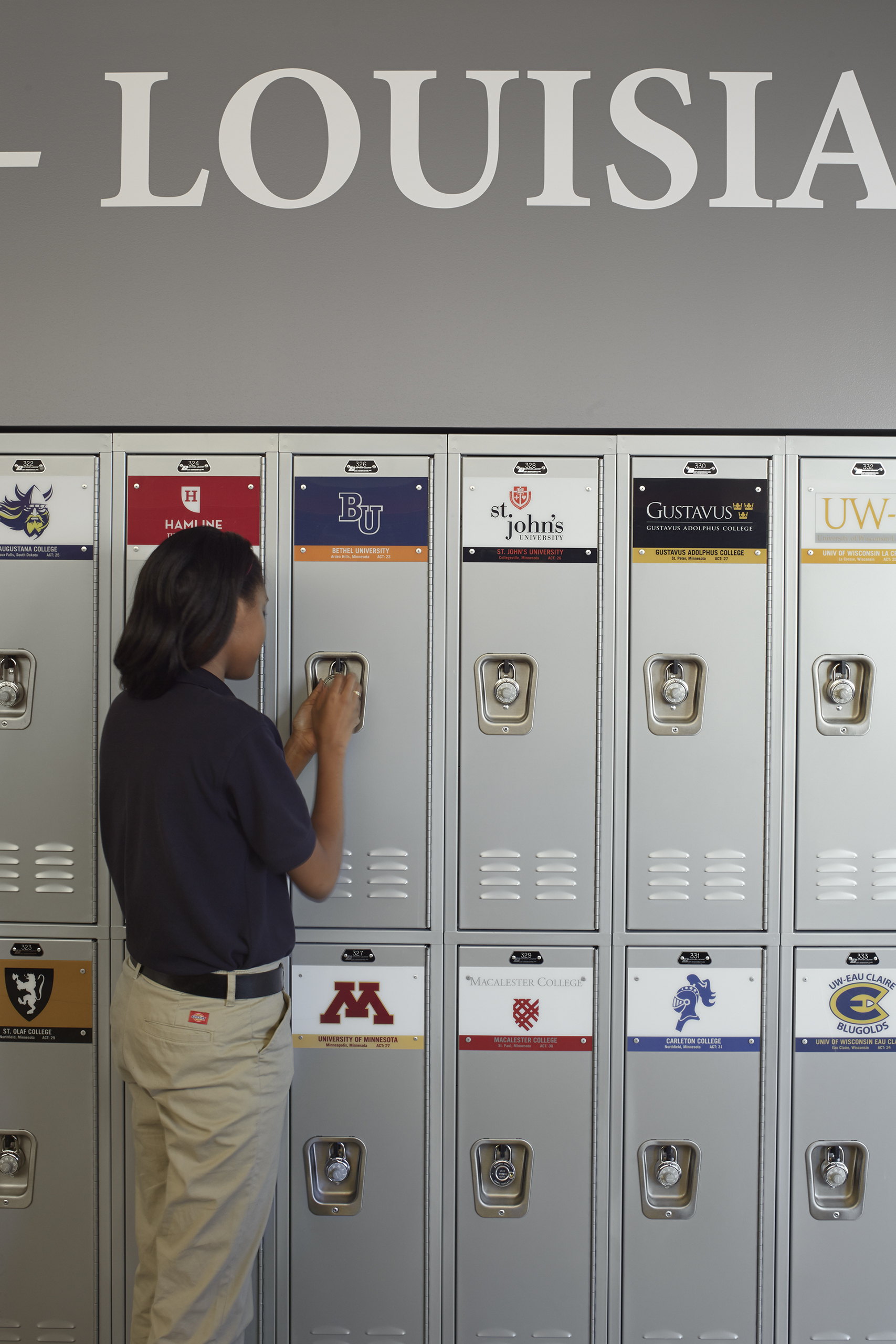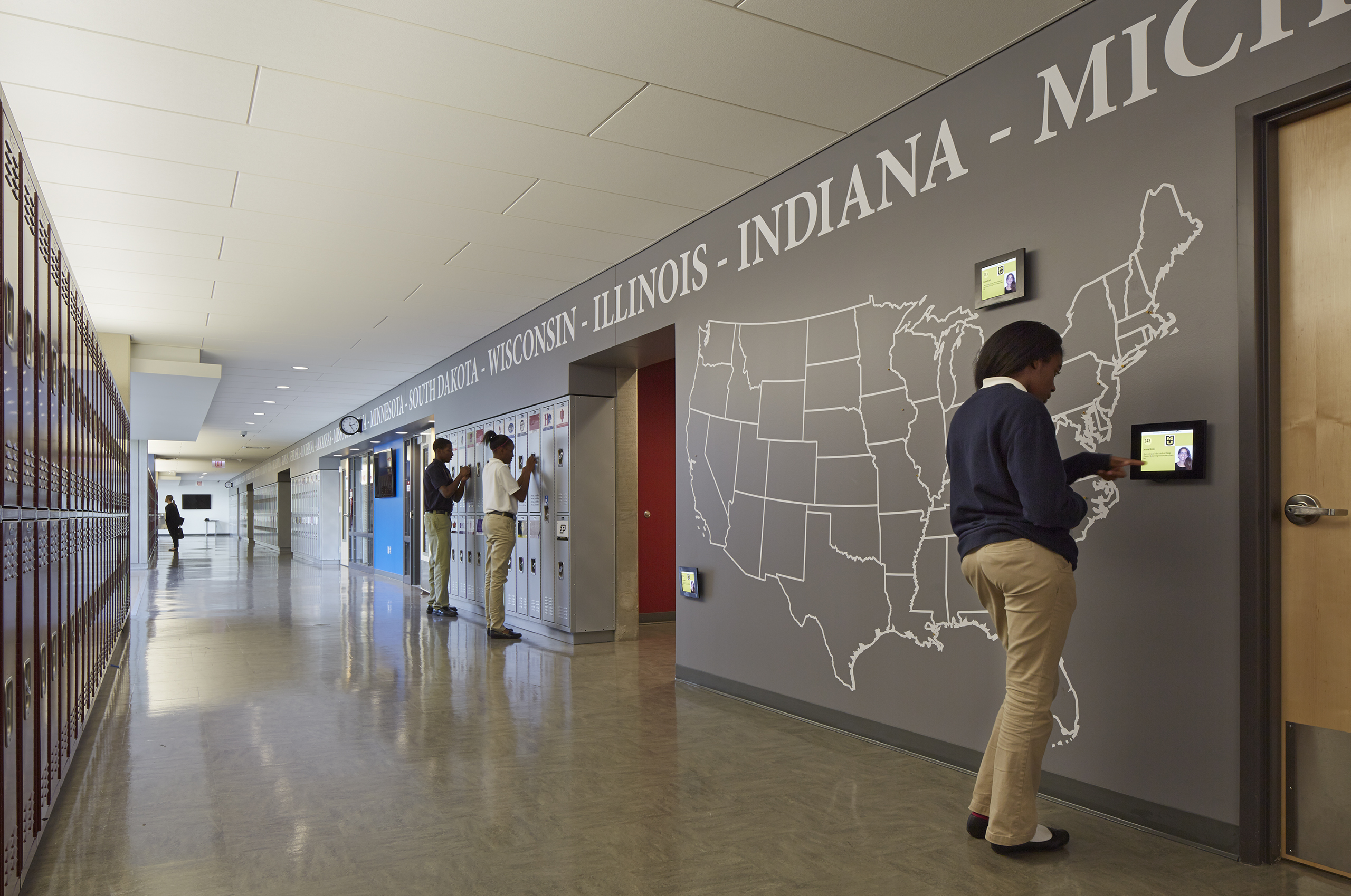 A 370-foot long hallway which straddles the courtyards, serves as a “college corridor”, where 435 college logos, geographically organized from end to end, emblazon hallway lockers surrounding a central alumni map.