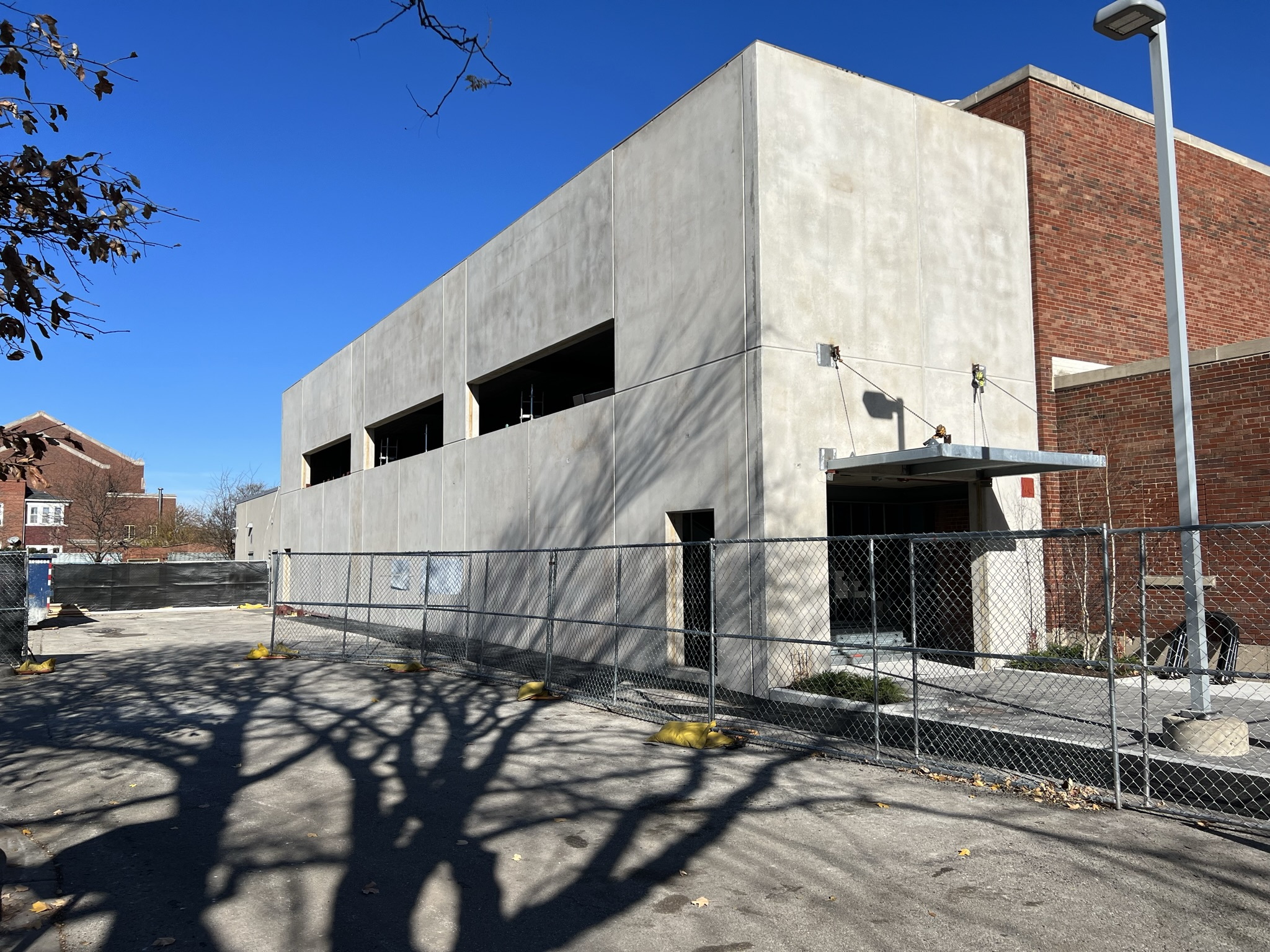 The precast subcontractor who built the 2013 walls for Hansberry College Prep, poured matching walls for the spectator seating addition.