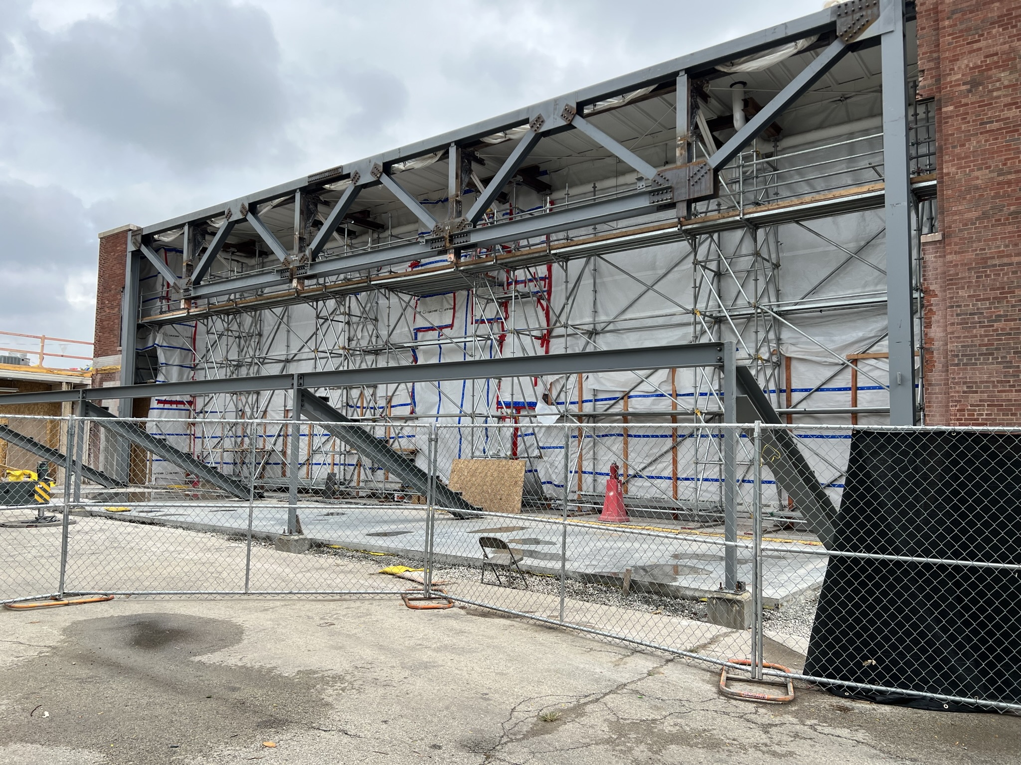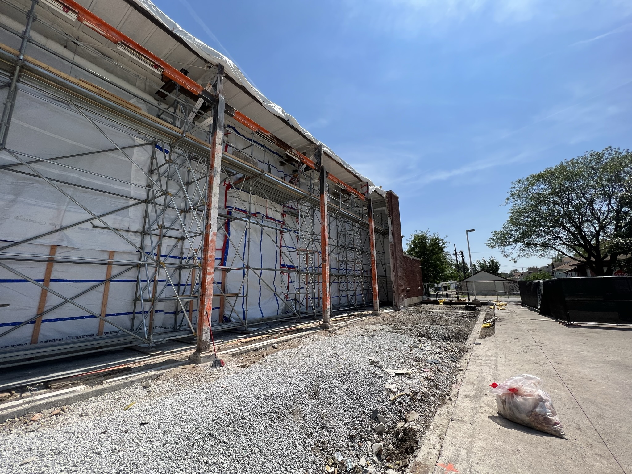 After crews deconstructed the 1954 brick wall, the columns holding up Hansberry College Prep’s roof were exposed. The foundation for the exterior walls, poured a decade before, are visible on the right side of the photo.