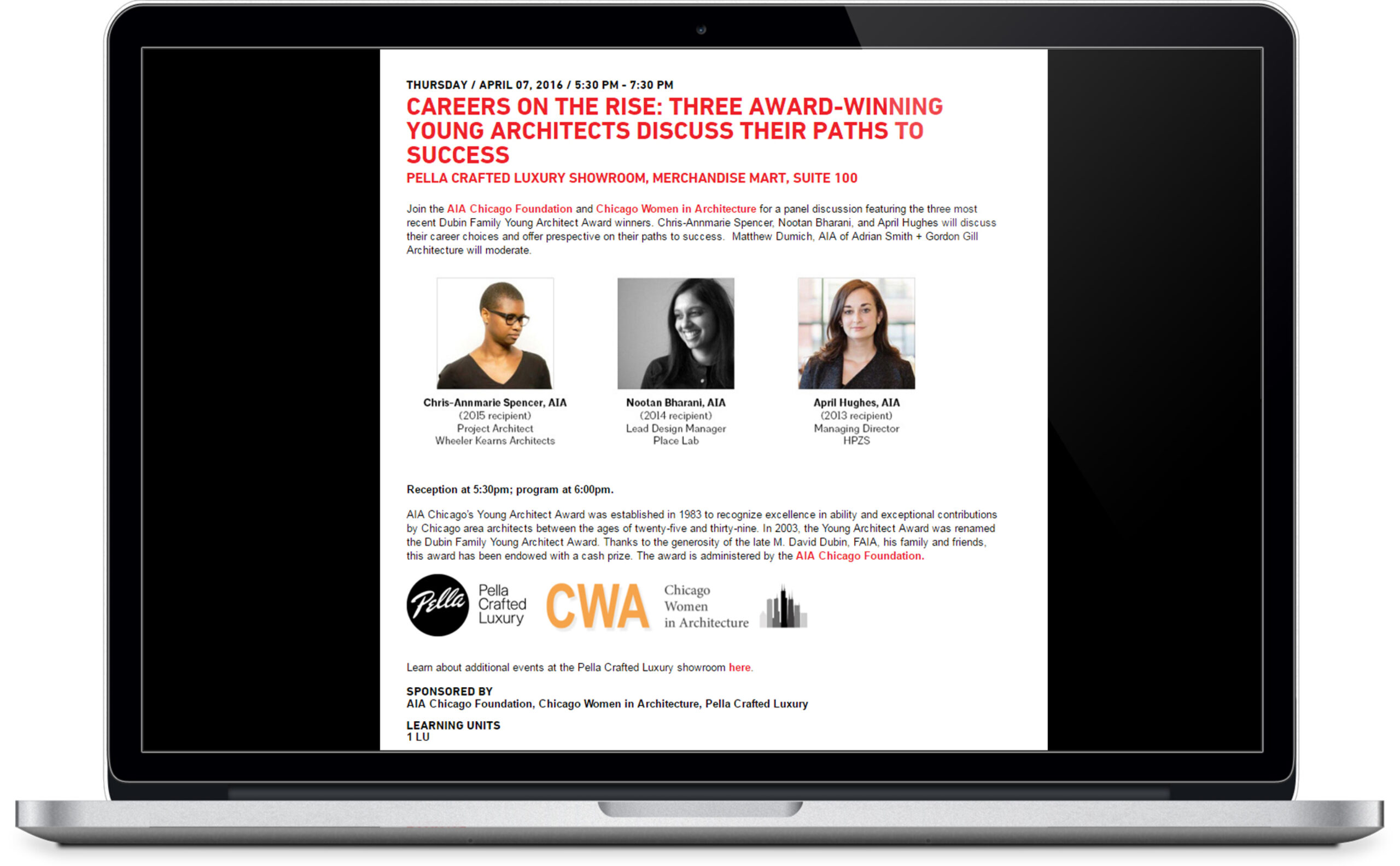 “Careers on the Rise: Three Award-Winning Young Architects discuss their Paths to Success” – The AIA Chicago Foundation and Chicago Women in Architecture hosted a panel discussion featuring the three most recent Dubin Family Young Architect Award winners. Moderated by Matthew Dumich, AIA of Adrian Smith + Gordon Gill Architecture, Chris-Annmarie Spencer, Nootan Bharani, and April Hughes discussed their career choices and perspectives on their paths to success.