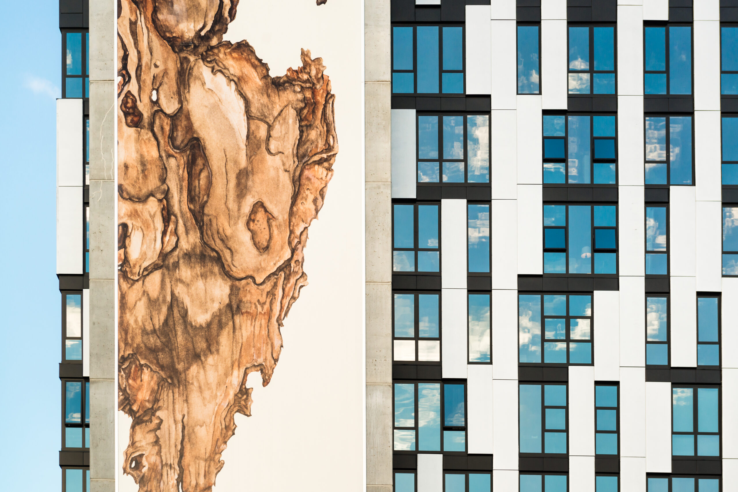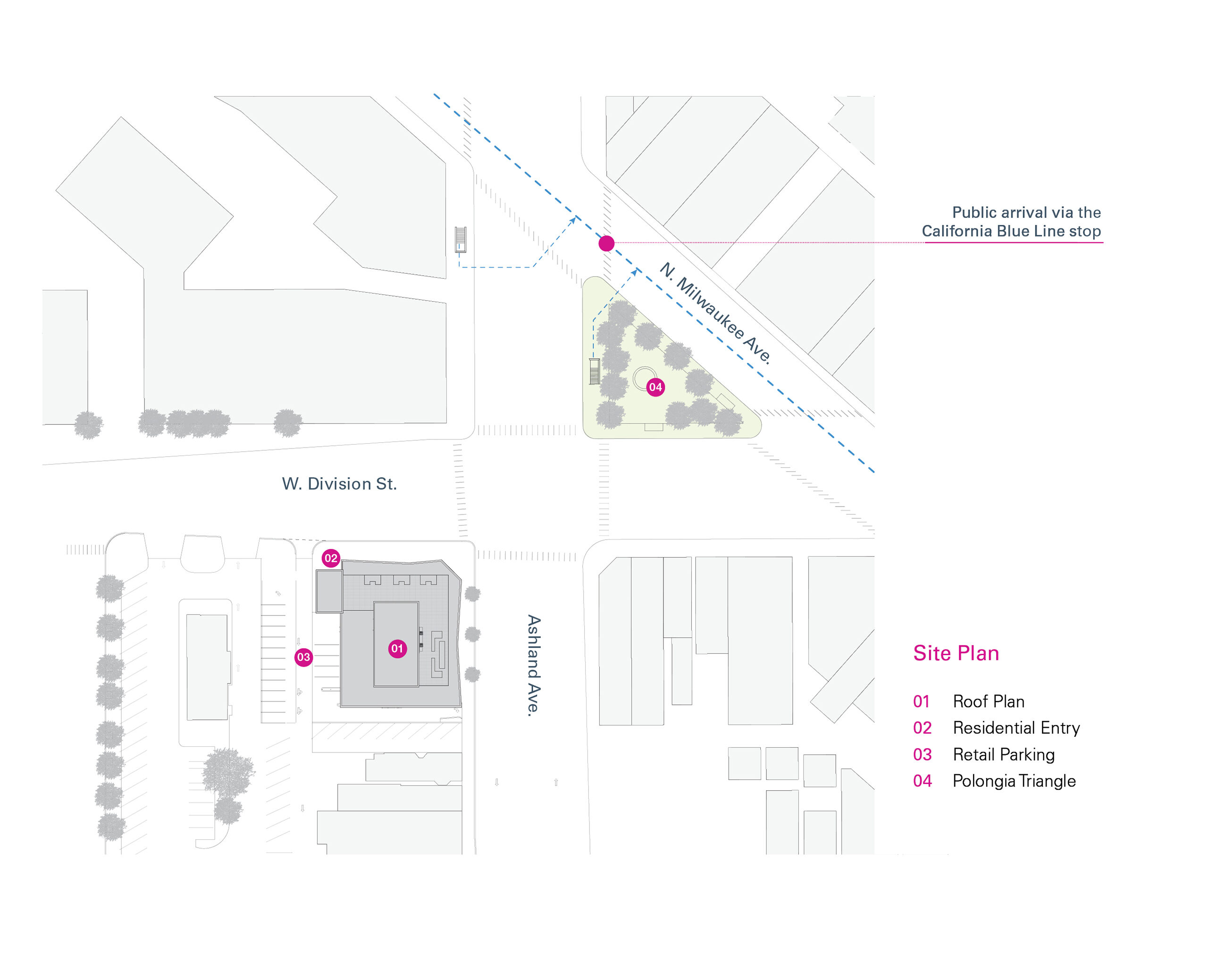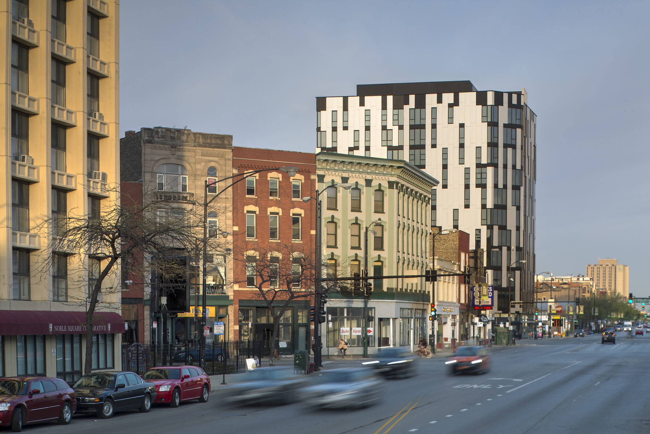 As part of the commitment of the arts to this neighborhood, the project incorporates a 92’ tall art installation on the west facade, curated by the design team to initiate a dialogue between the architecture, the art and its community. Together, the building and the installation further the development of a vibrant cultural corridor along Division and Milwaukee.
