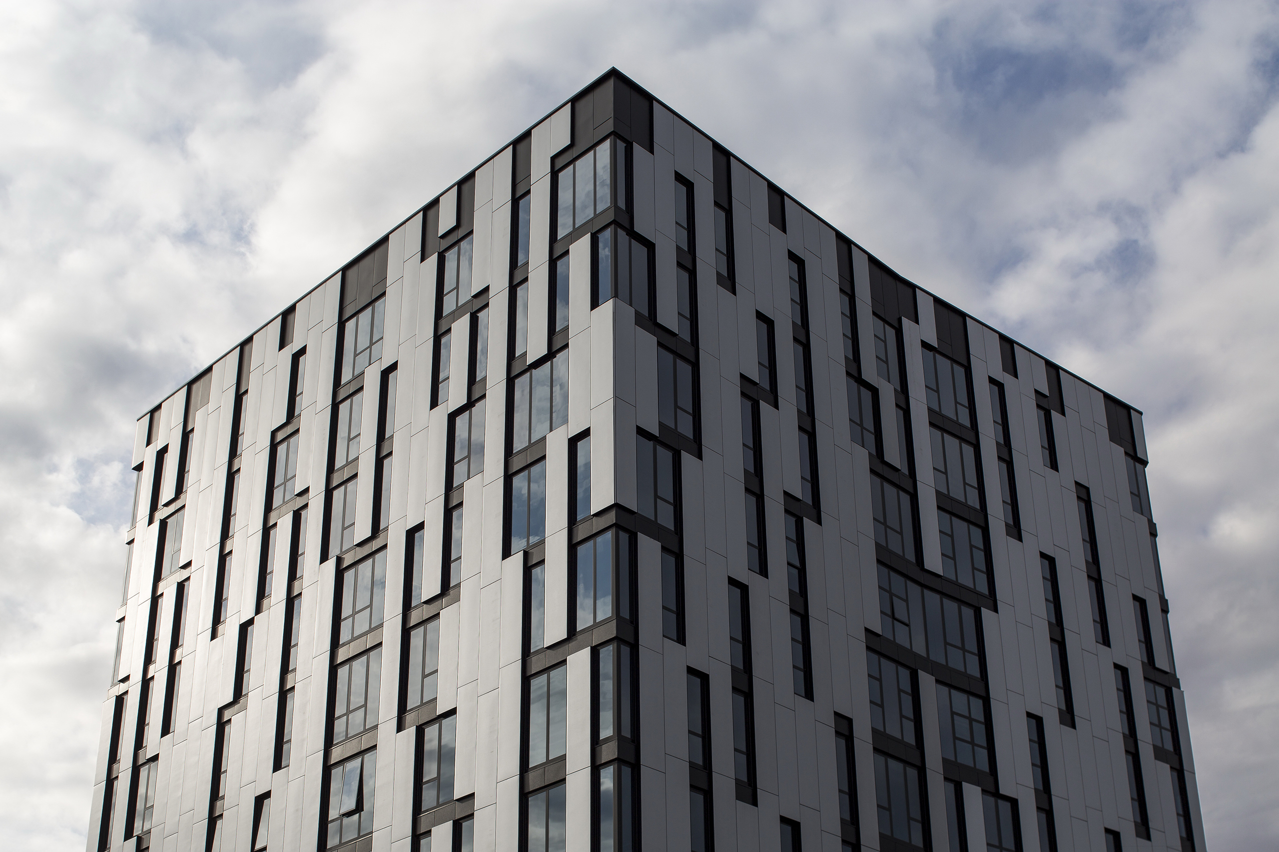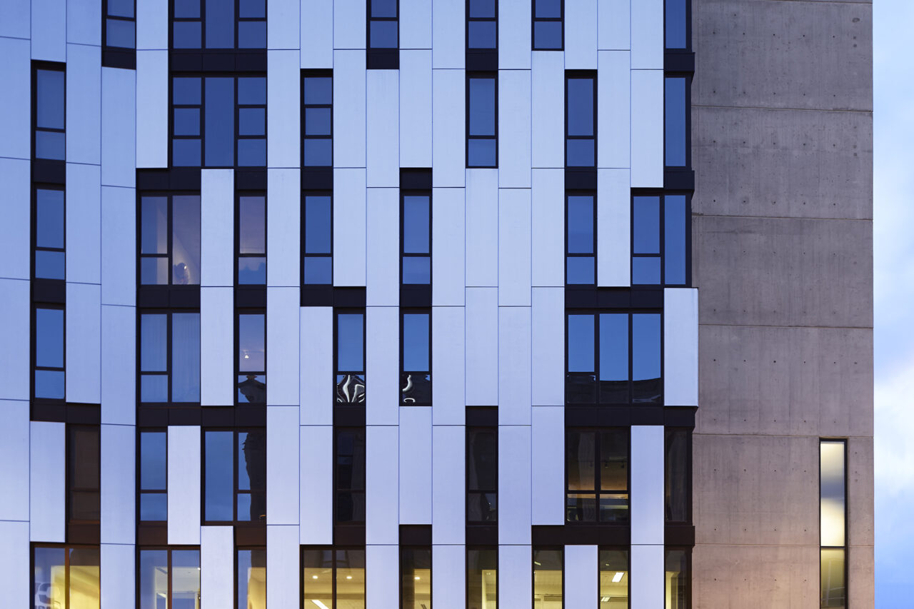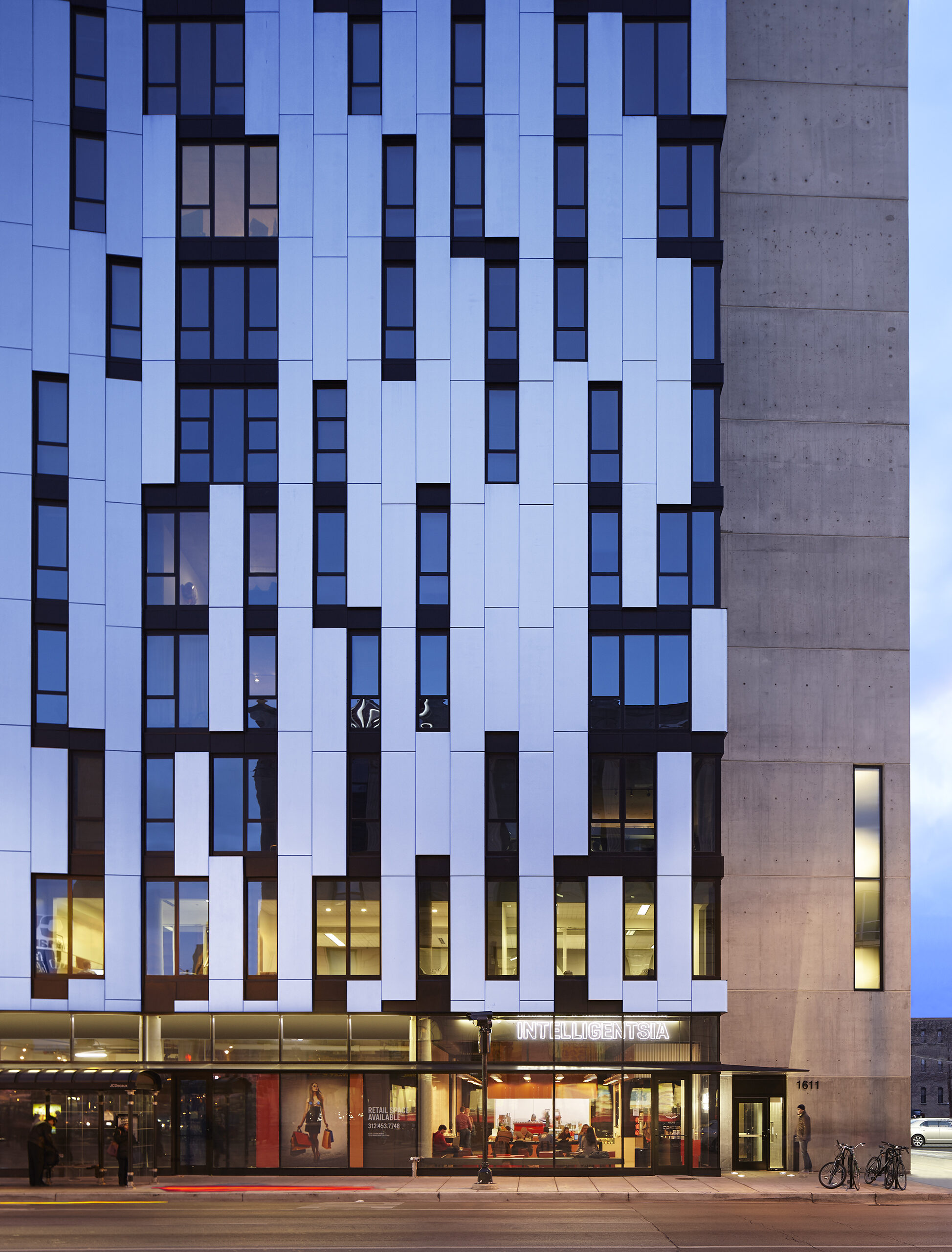 From great distances, the sleek, multi-faceted building creates a stunning, two-dimensional graphic navigating landmark. Upon approach, the building’s folded façades, comprised of staggered, non-repeating panels of metal and glass reveal depth and texture while capturing light and reflecting the energy that characterizes the intersection and individuality within the community.