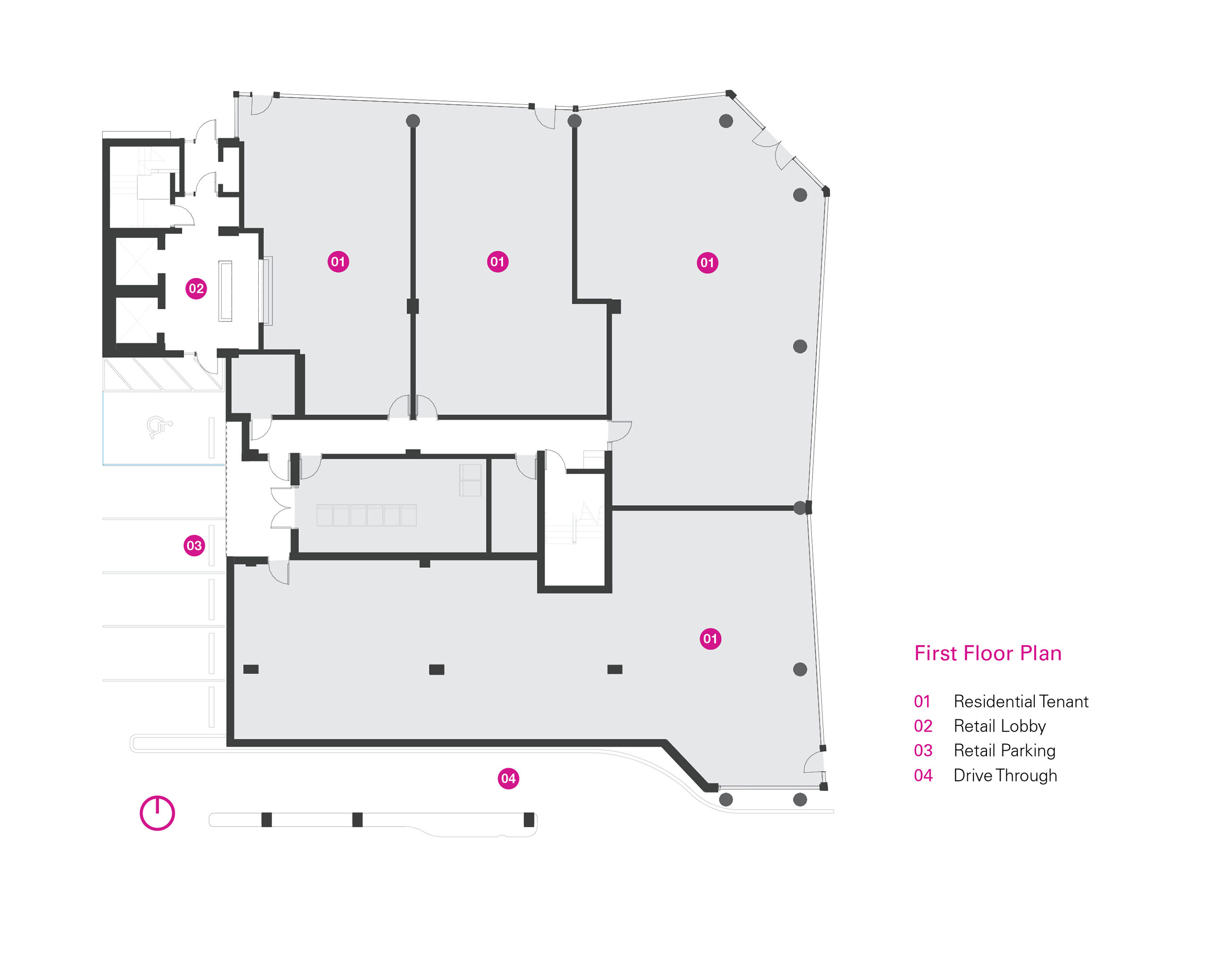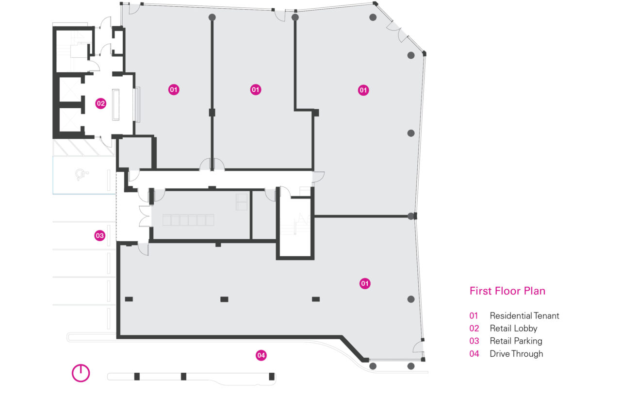 The parking reduction eliminated the parking ‘podium’ so commonly seen throughout Chicago. Instead, the inflecting facades create a broader sidewalk, enhancing the pedestrian experience, while a continuous canopy provides scale to the tall storefront and building above.