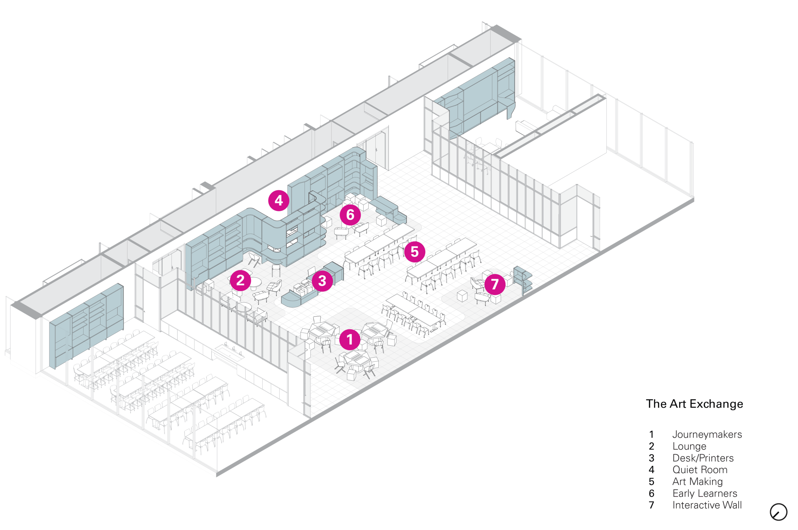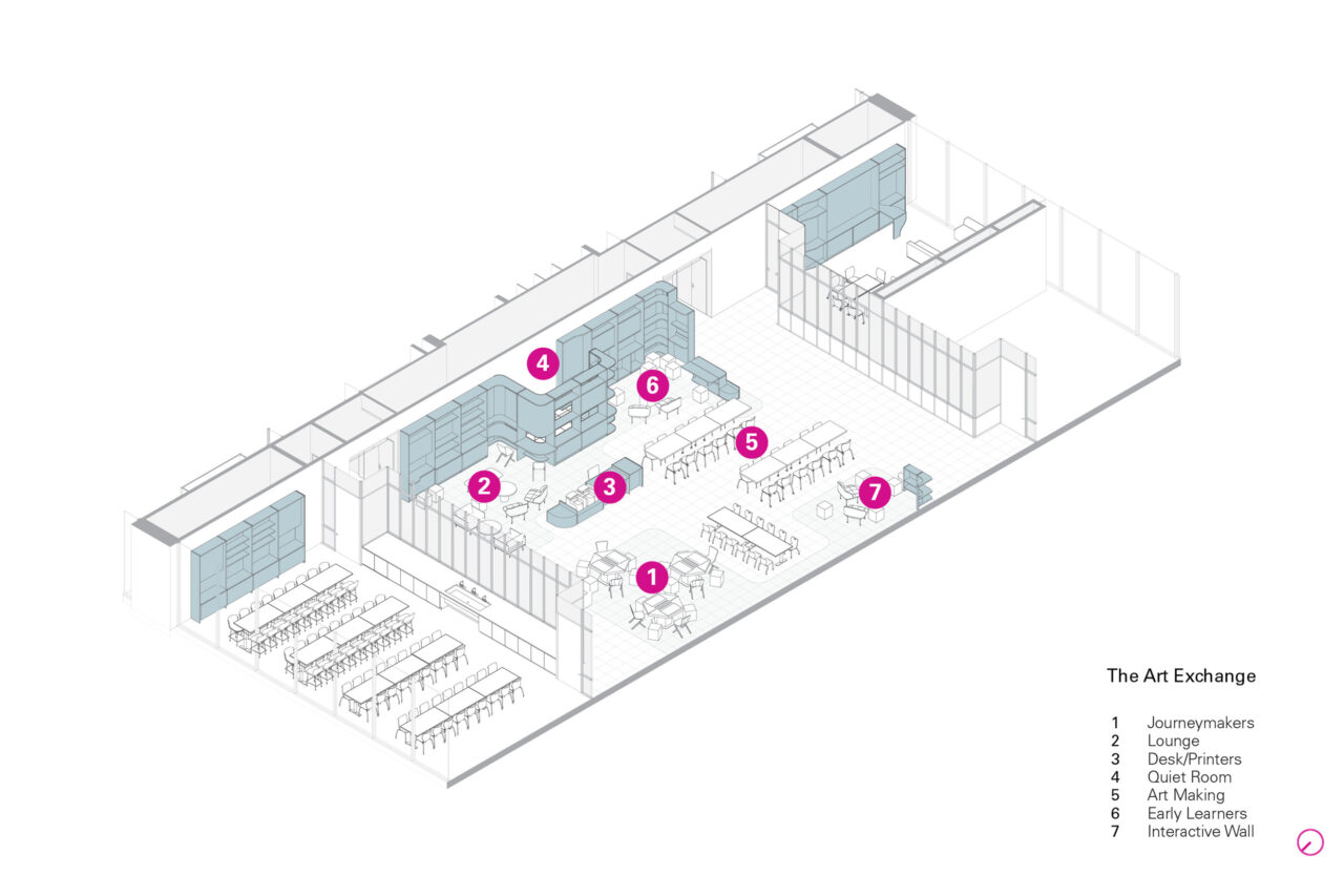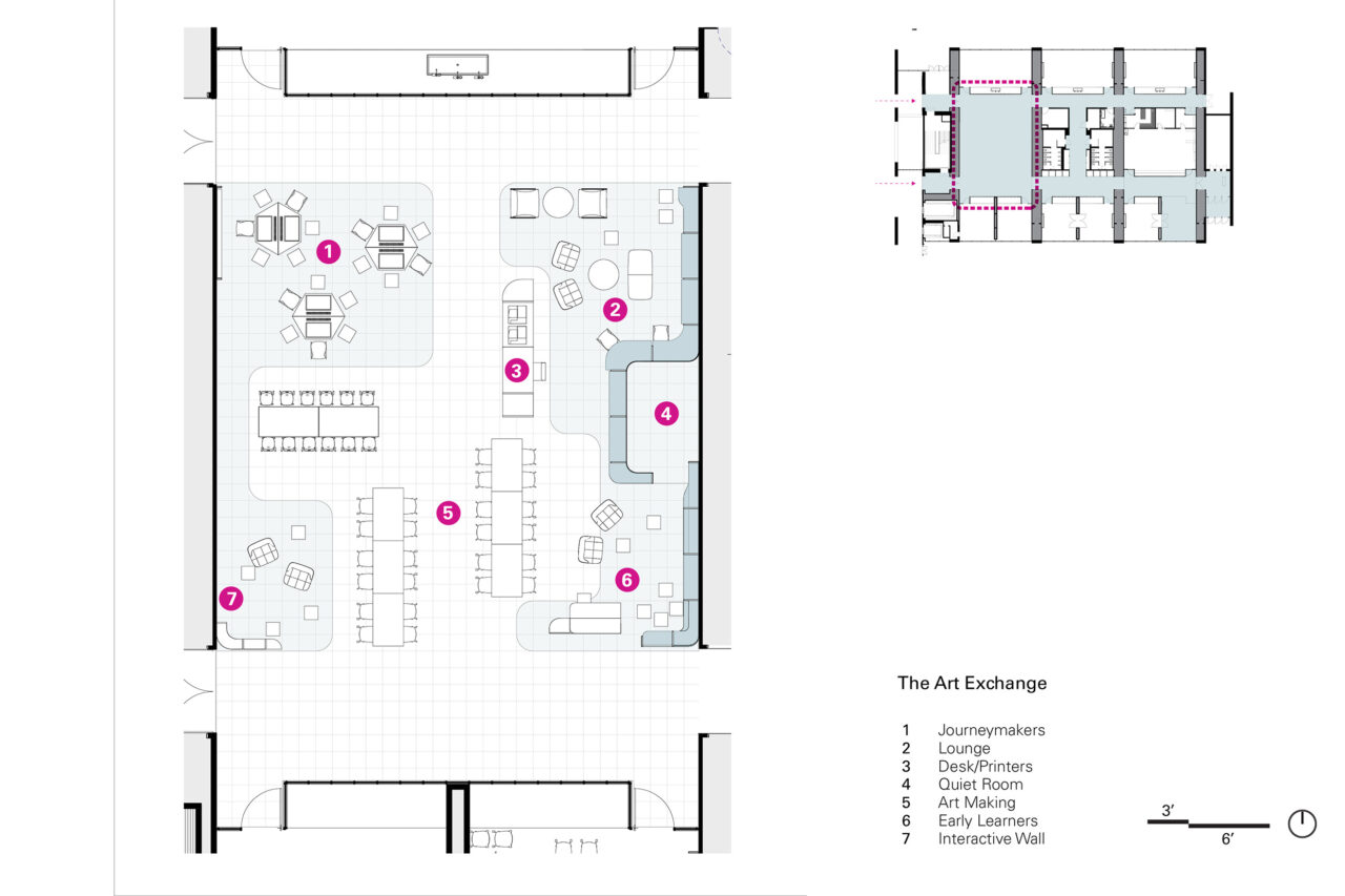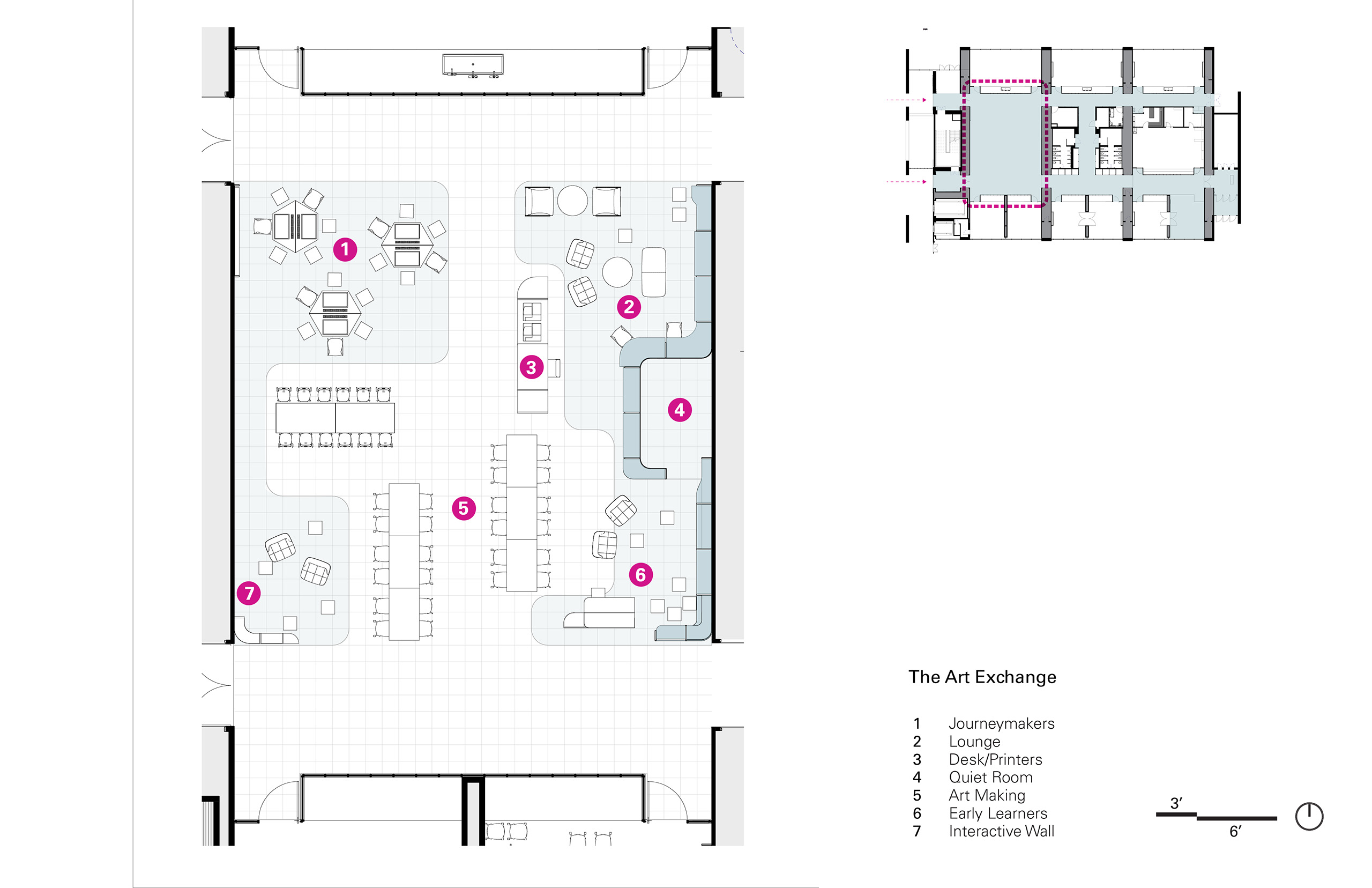 Situated behind the main desk for the museum, glass doors on opposing sides open into to the space. Formerly, these entrances led into long, double-loaded corridors and visitors were unable to intuit the offerings of the RLC. The design team worked to open a new space–the David Vitale Art Exchange–into which visitors are immediately greeted.