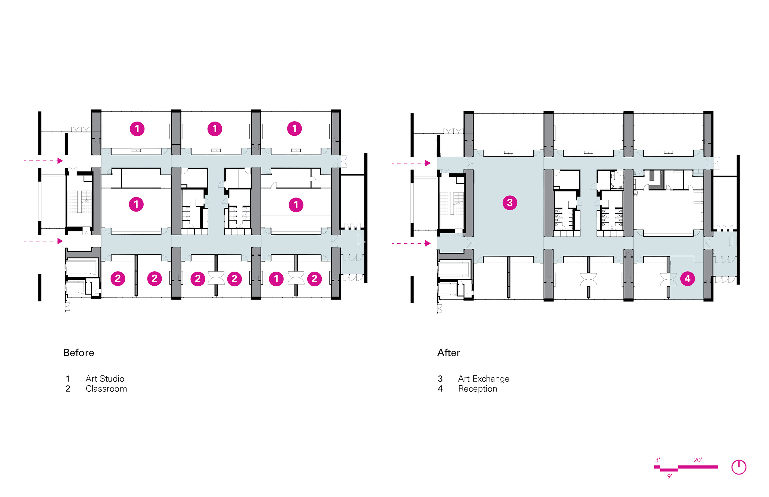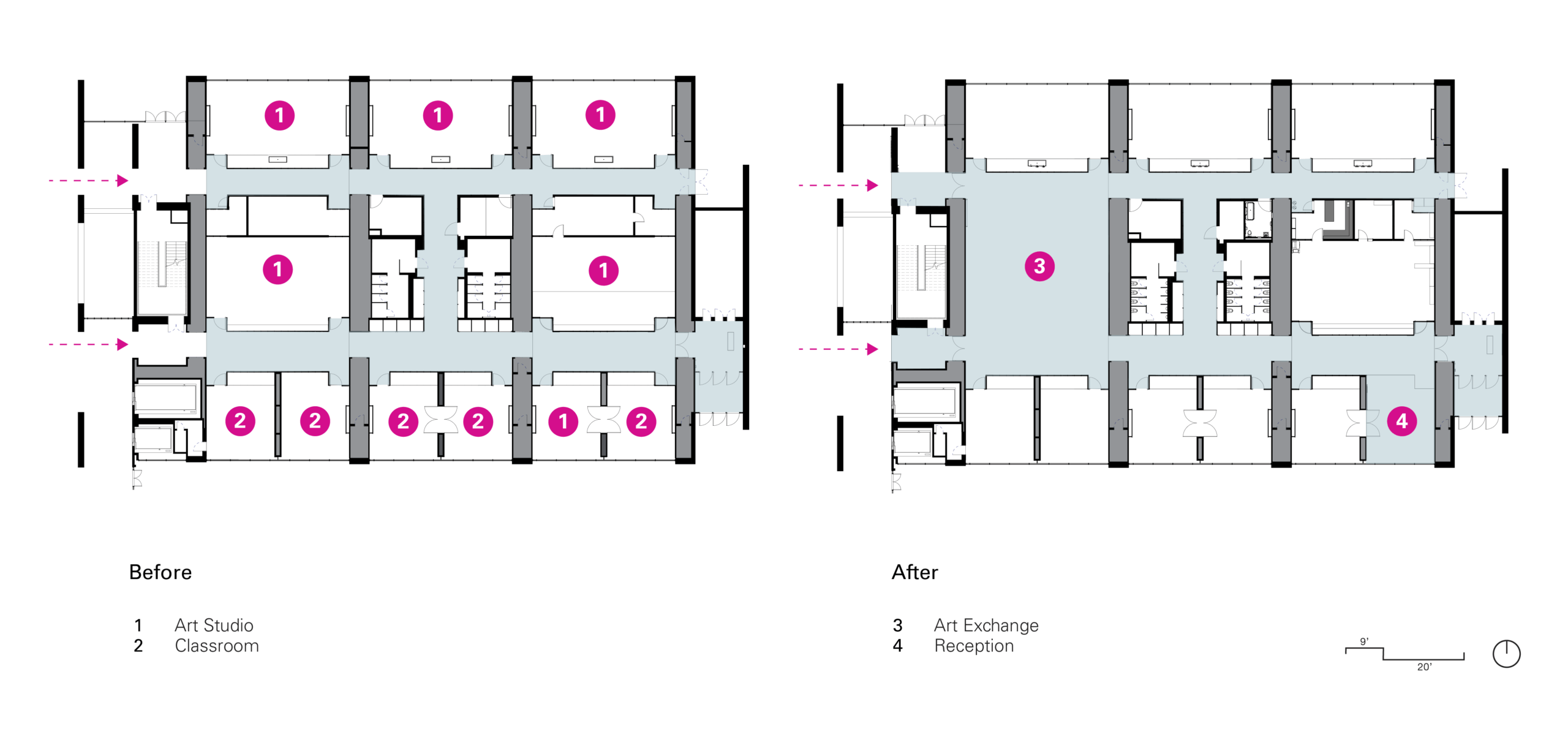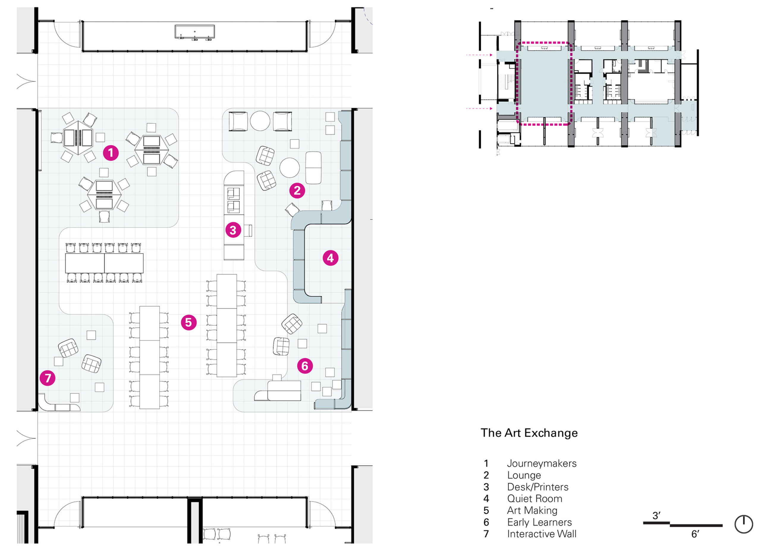 Situated behind the main desk for the museum, glass doors on opposing sides open into to the space. Formerly, these entrances led into long, double-loaded corridors and visitors were unable to intuit the offerings of the RLC. The design team worked to open a new space–the David Vitale Art Exchange–into which visitors are immediately greeted.