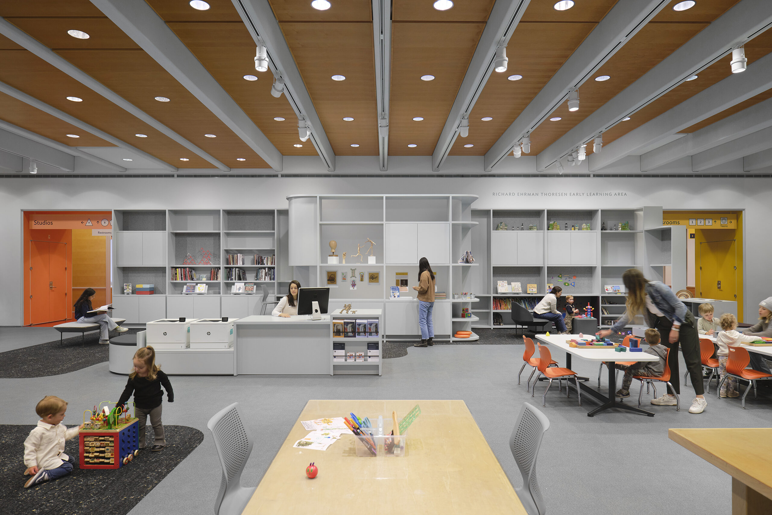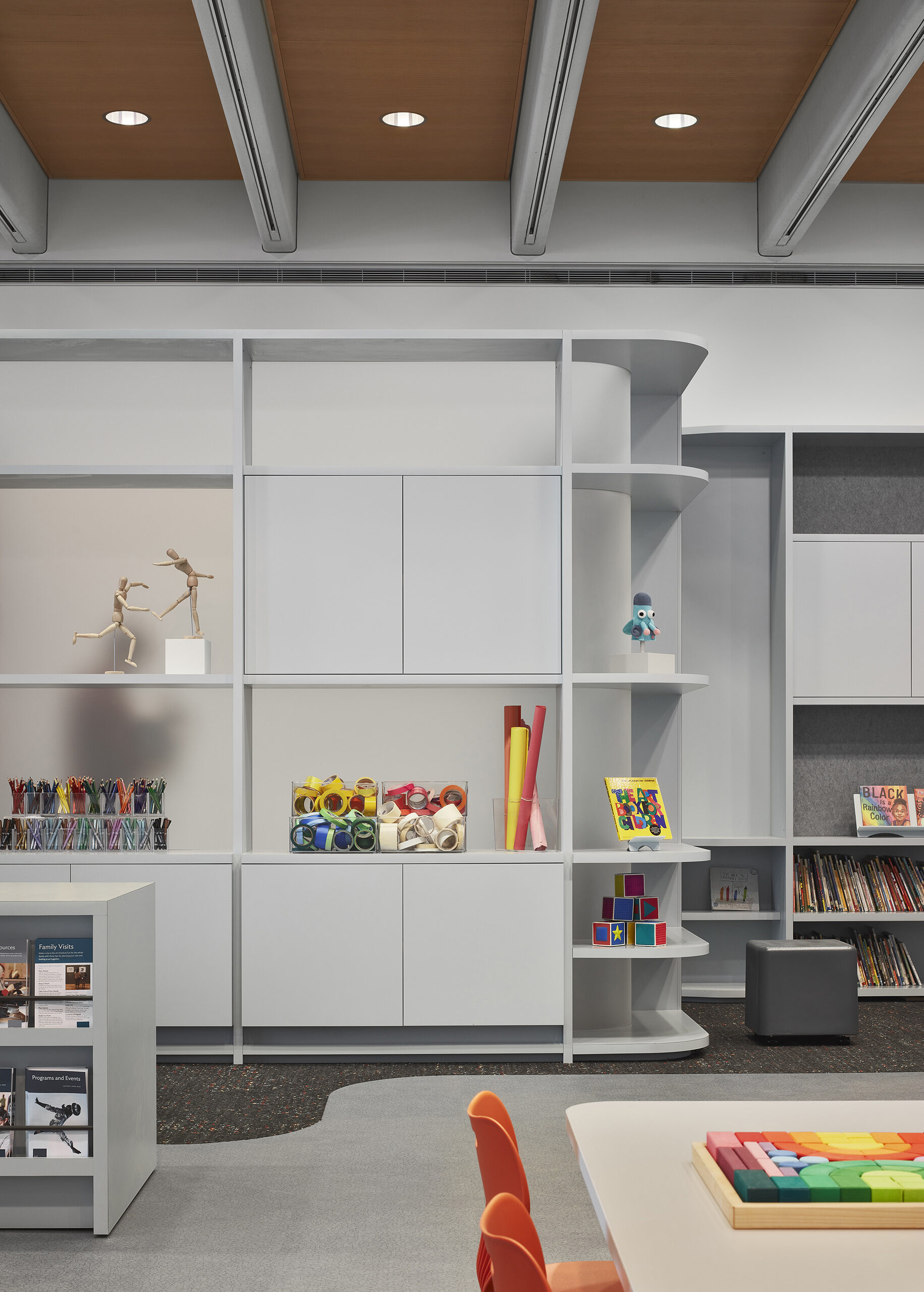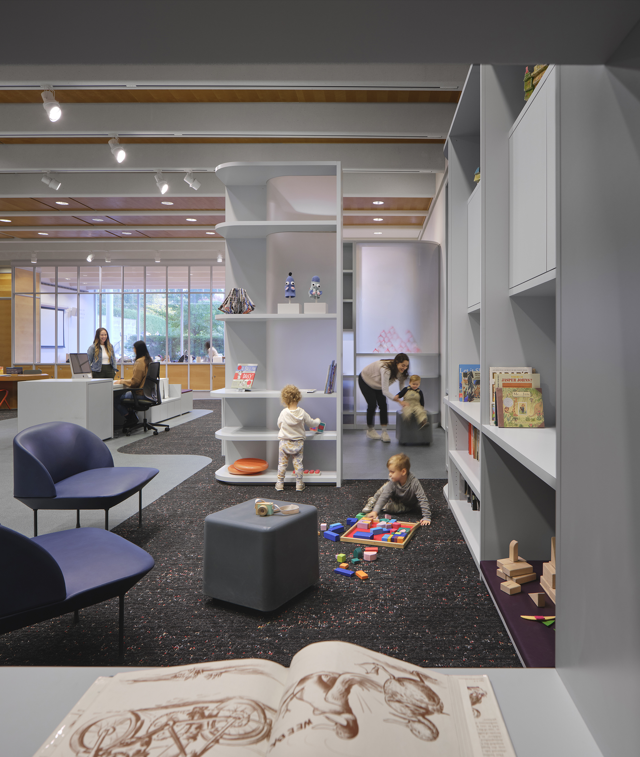 Designed on the structural module of the Modern Wing, new millwork components incorporate subtle curves that soften the open space while indicating different zones within the larger room—shifting from toy storage and nooks for children into a library with books and reference materials for adults.