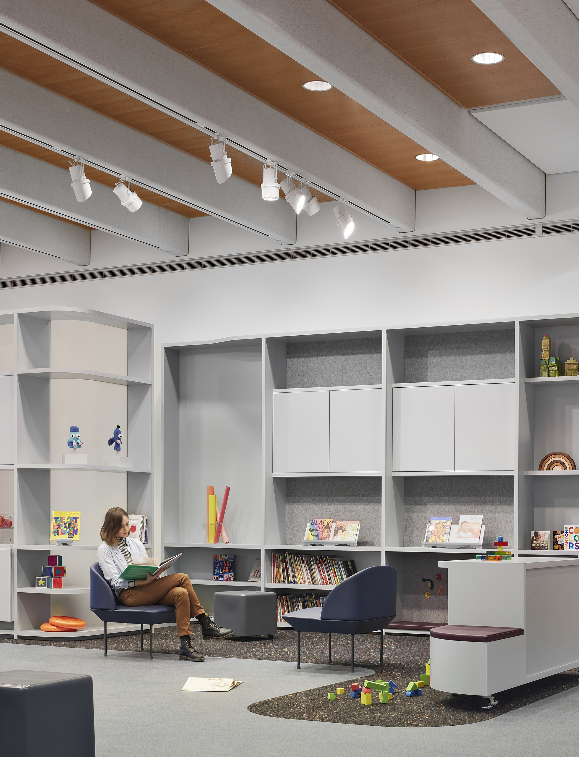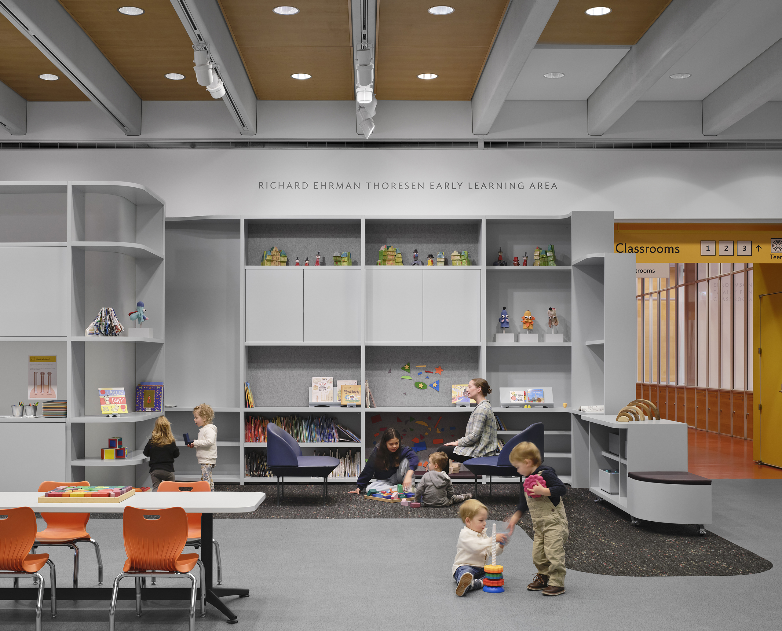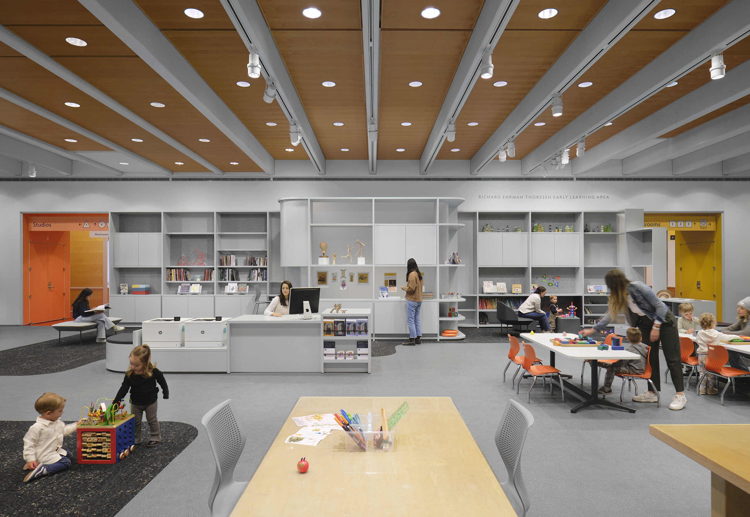 Designed on the structural module of the Modern Wing, new millwork components incorporate subtle curves that soften the open space while indicating different zones within the larger room—shifting from toy storage and nooks for children into a library with books and reference materials for adults.