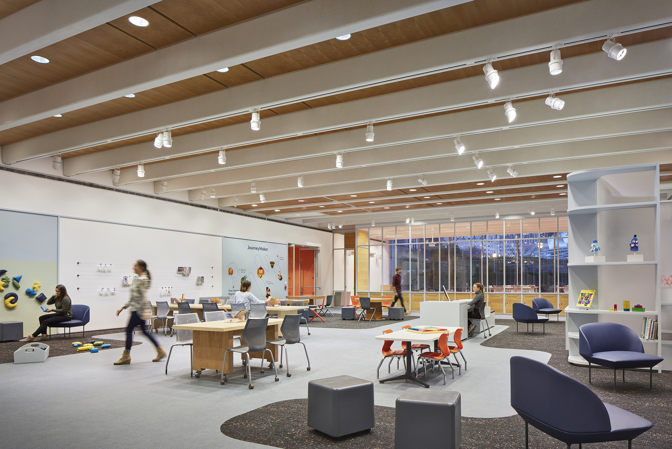 Colorful flooring patterns and furniture define areas for sitting, gathering, and creating. The millwork interventions extend into the adjacent teen room and art studio. A soft blue paint unifies the spaces and complements the existing material palette. The millwork communicates both beauty and function, and seamlessly connects all the spaces, functions, and rooms together. These millwork interventions also include absorptive acoustic panels in key areas to meditate reverberation and allow multiple uses to happen simultaneously.