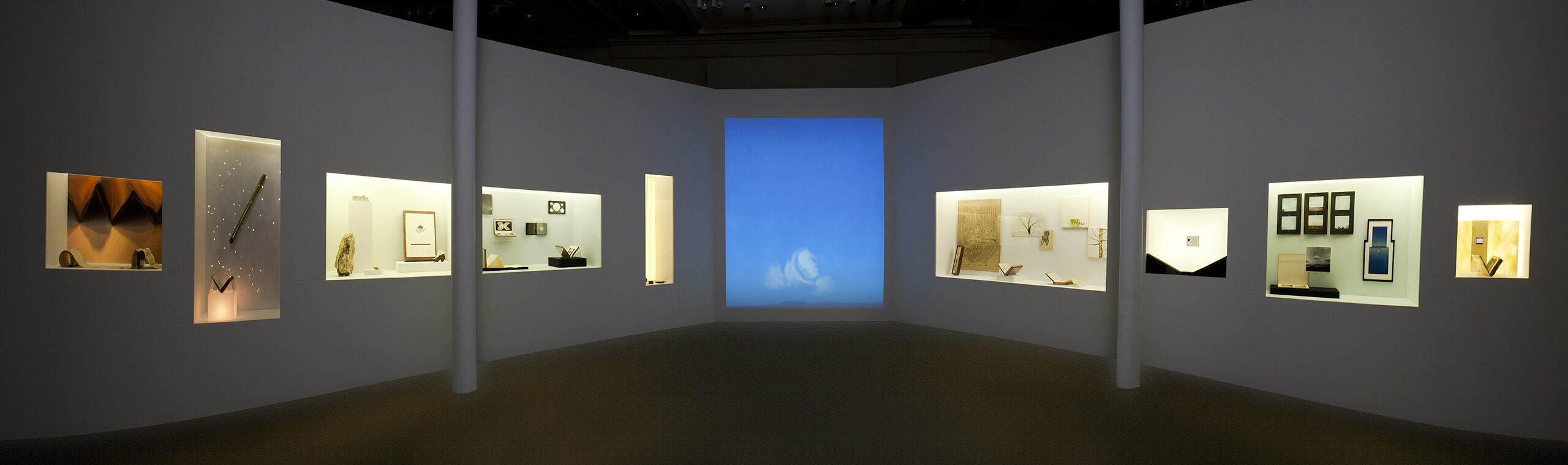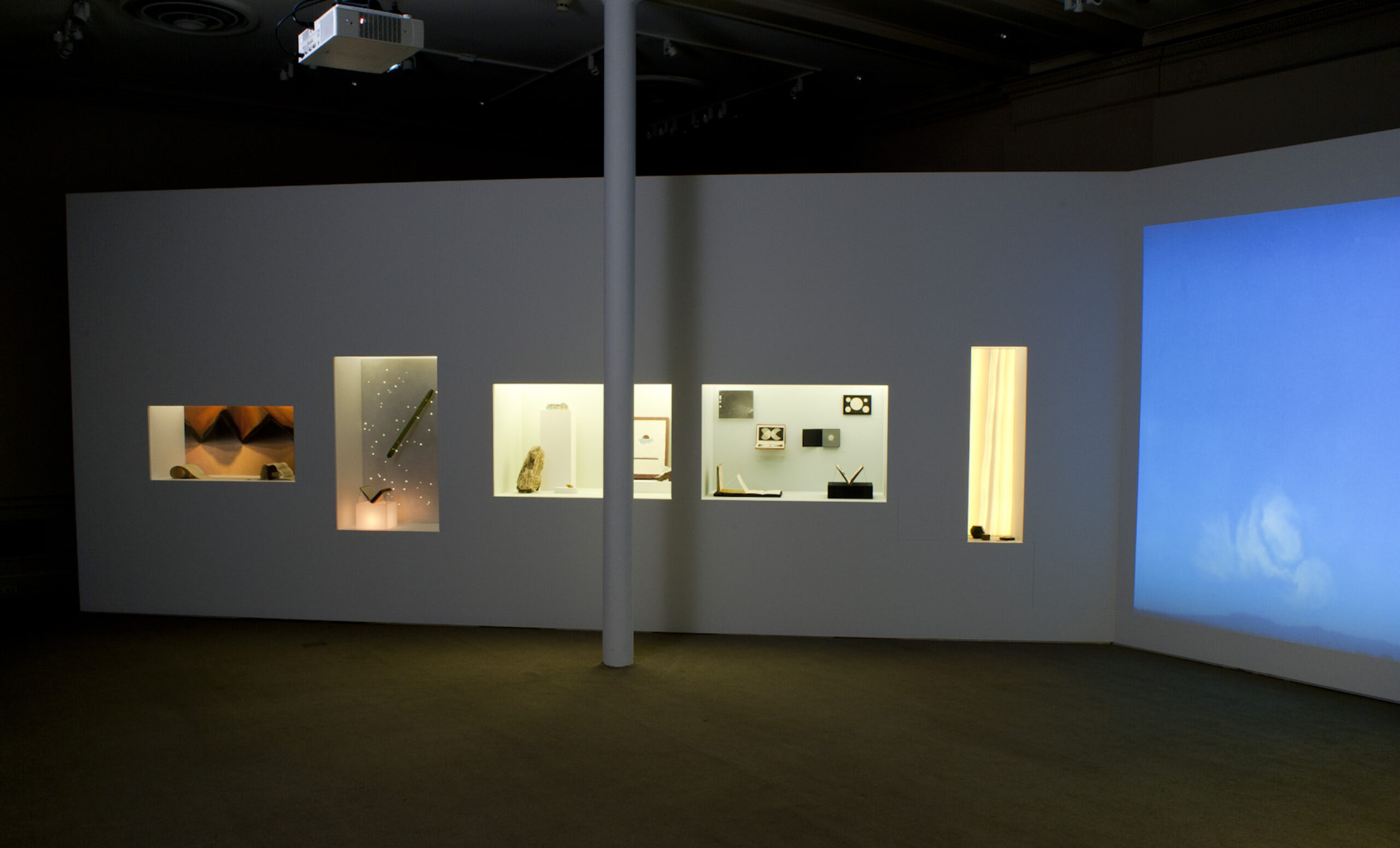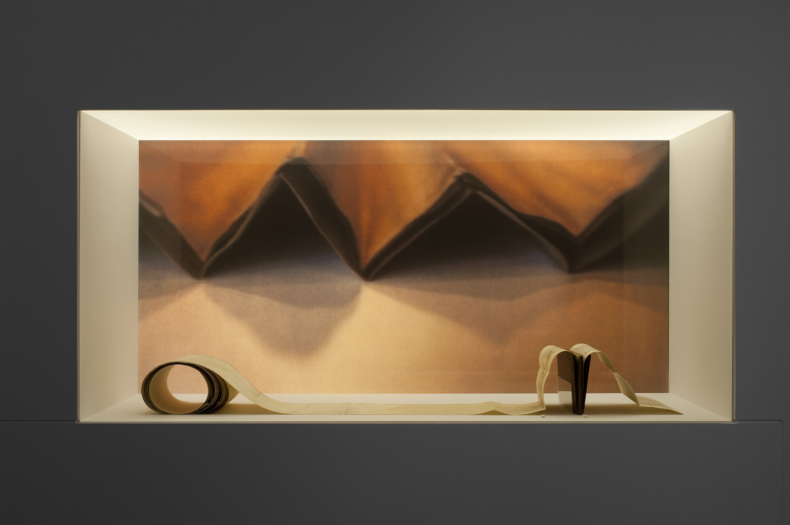 WKA collaborated with the artist, Antonia Contro, on the design and construction of the installation of her show Tempus Fugit (Time Flies) at the American Philosophical Society, founded by Benjamin Franklin. Ms. Contro selected pieces of the Society’s collection of books and artifacts pairing them with personal interactive responses. The APS’s primary, highly articulated, gallery was painted a flat grey and lit as minimally as code allowed. The analogy of an opened book was used, with a 10 foot high folded plane floating free from the walls/ceilings of the space. A discreet timeline was inscribed into the painted MDF skin via CNC routing, onto/above a series of recessed illuminated cases were placed. A projected video loop anchors the exhibition.