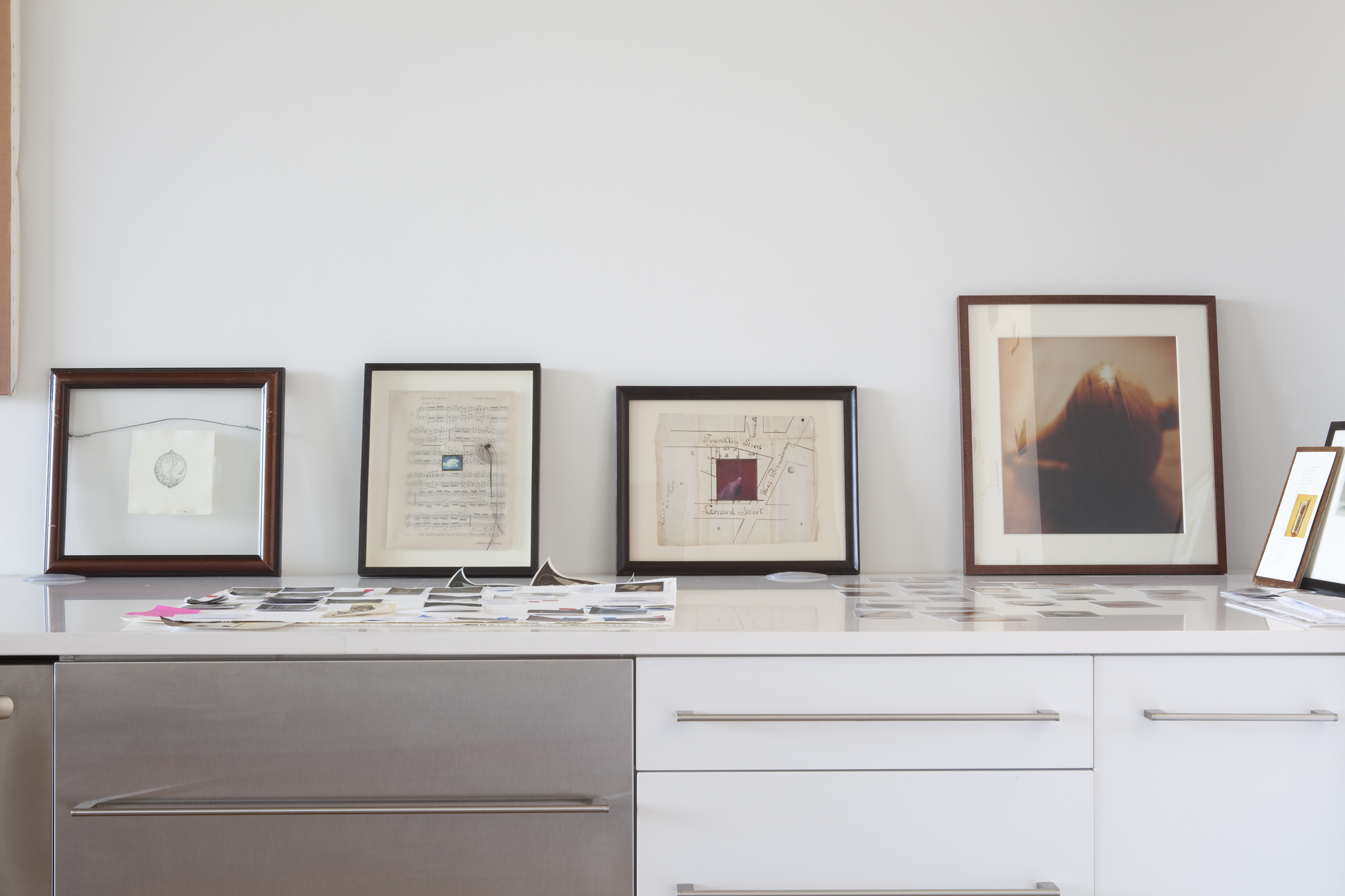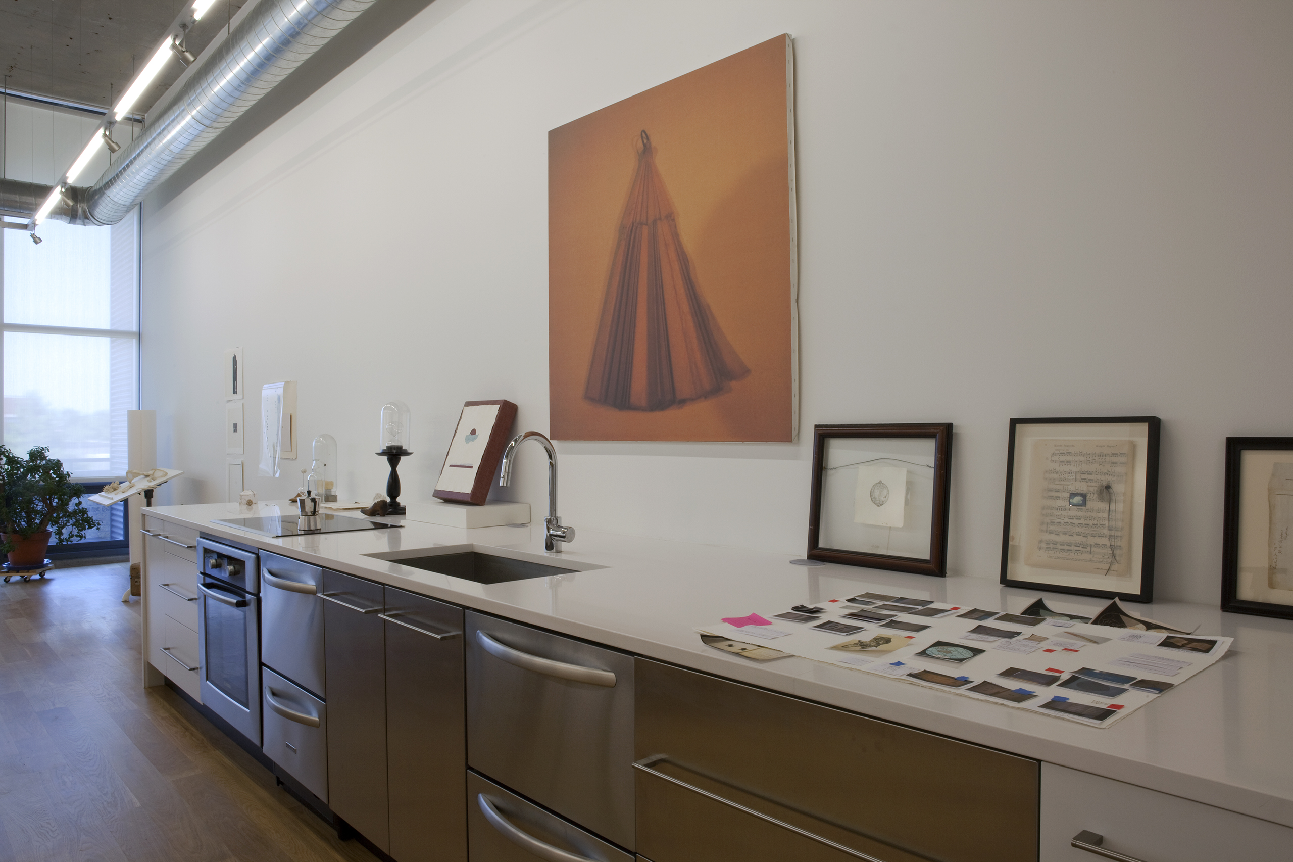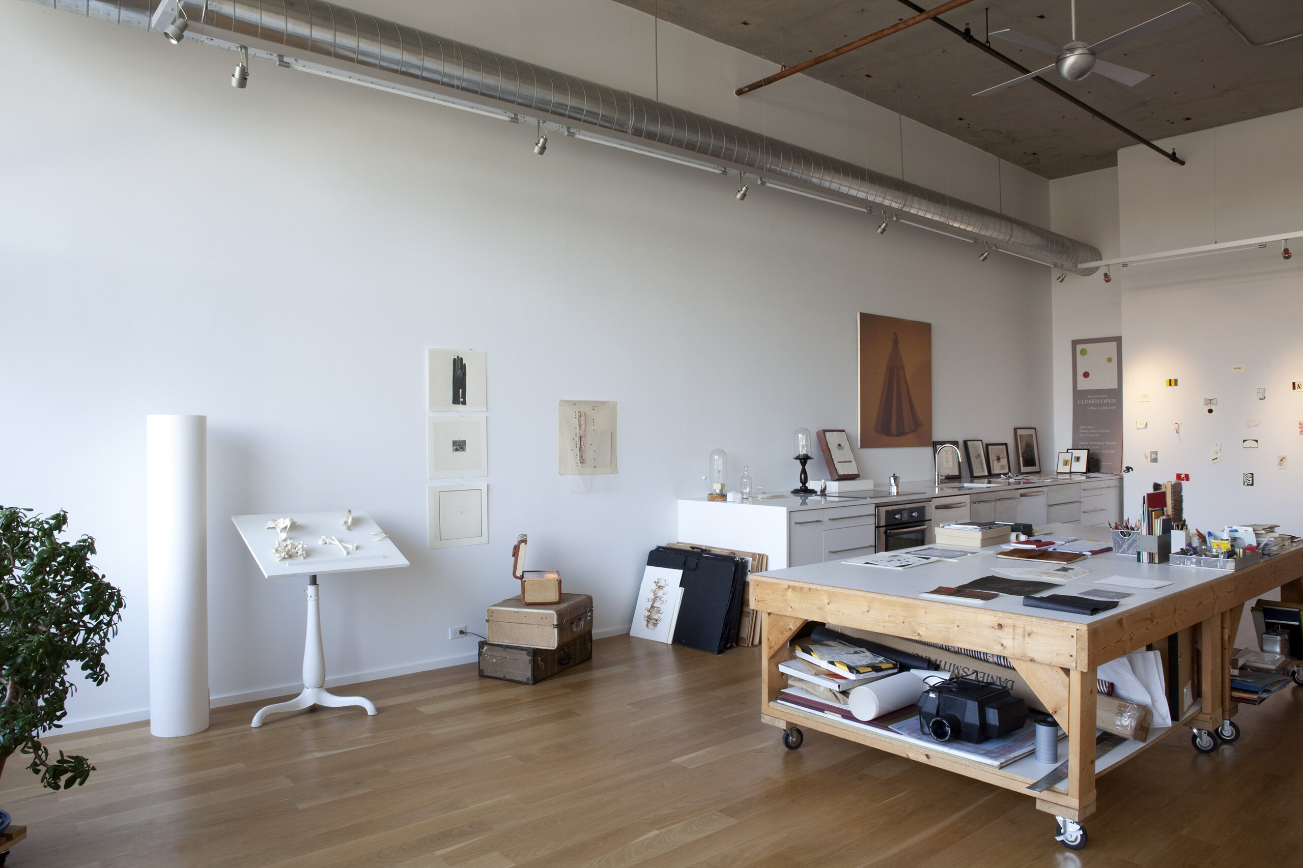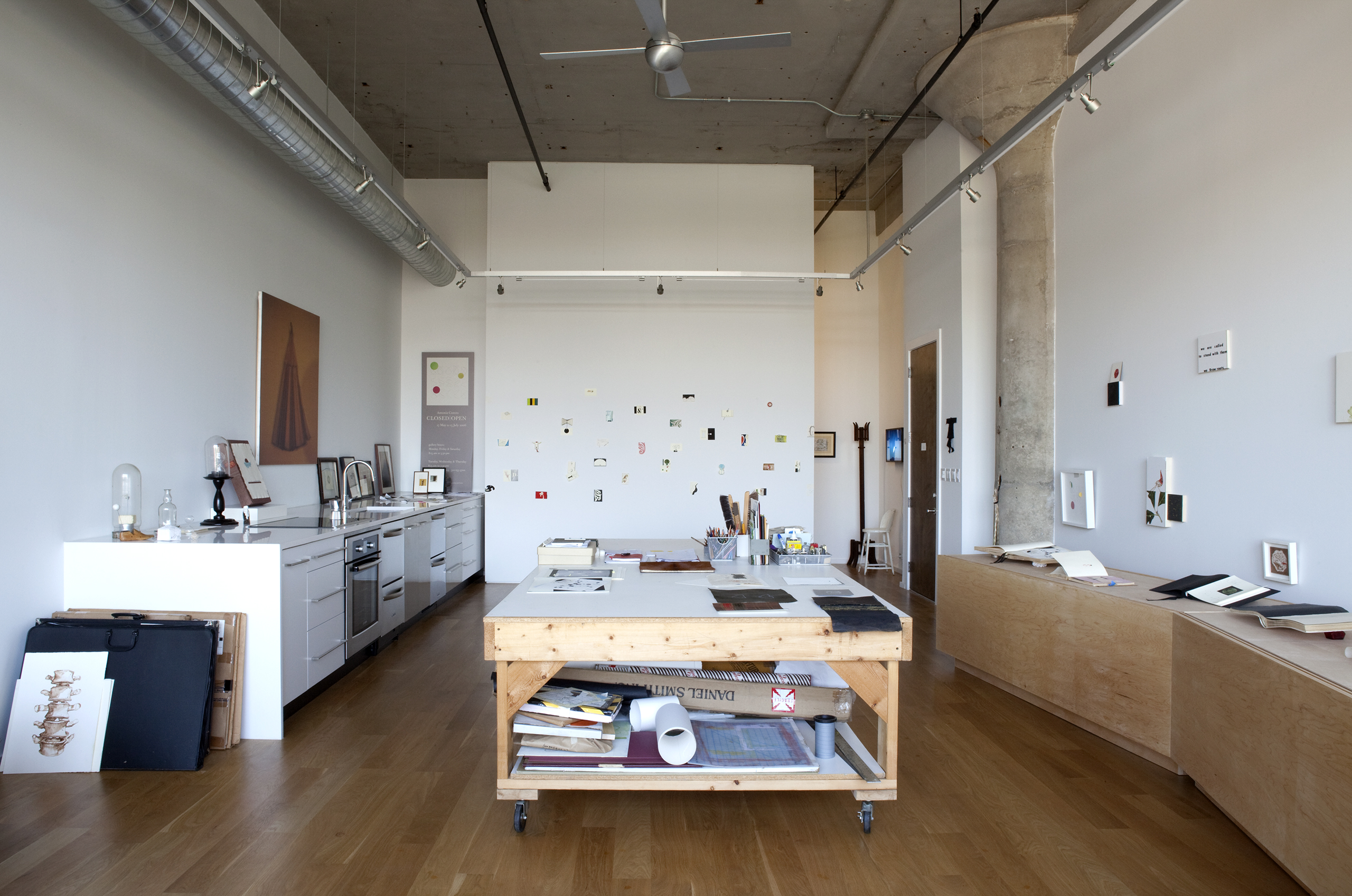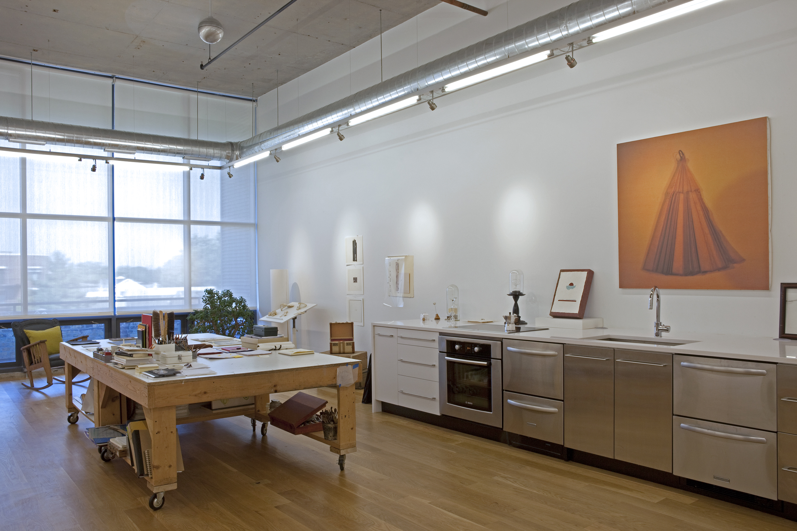 An artist/friend purchased a partially built-out residential unit in an existing loft conversion to serve as her professional studio. Partitions were removed to provide a single rectangular room, the space was further clarified with a rectangle of lighting and visually anchored by a tall, centered rectangular wall. Cooking provisions are subsumed into a deep three foot work/object display counter.