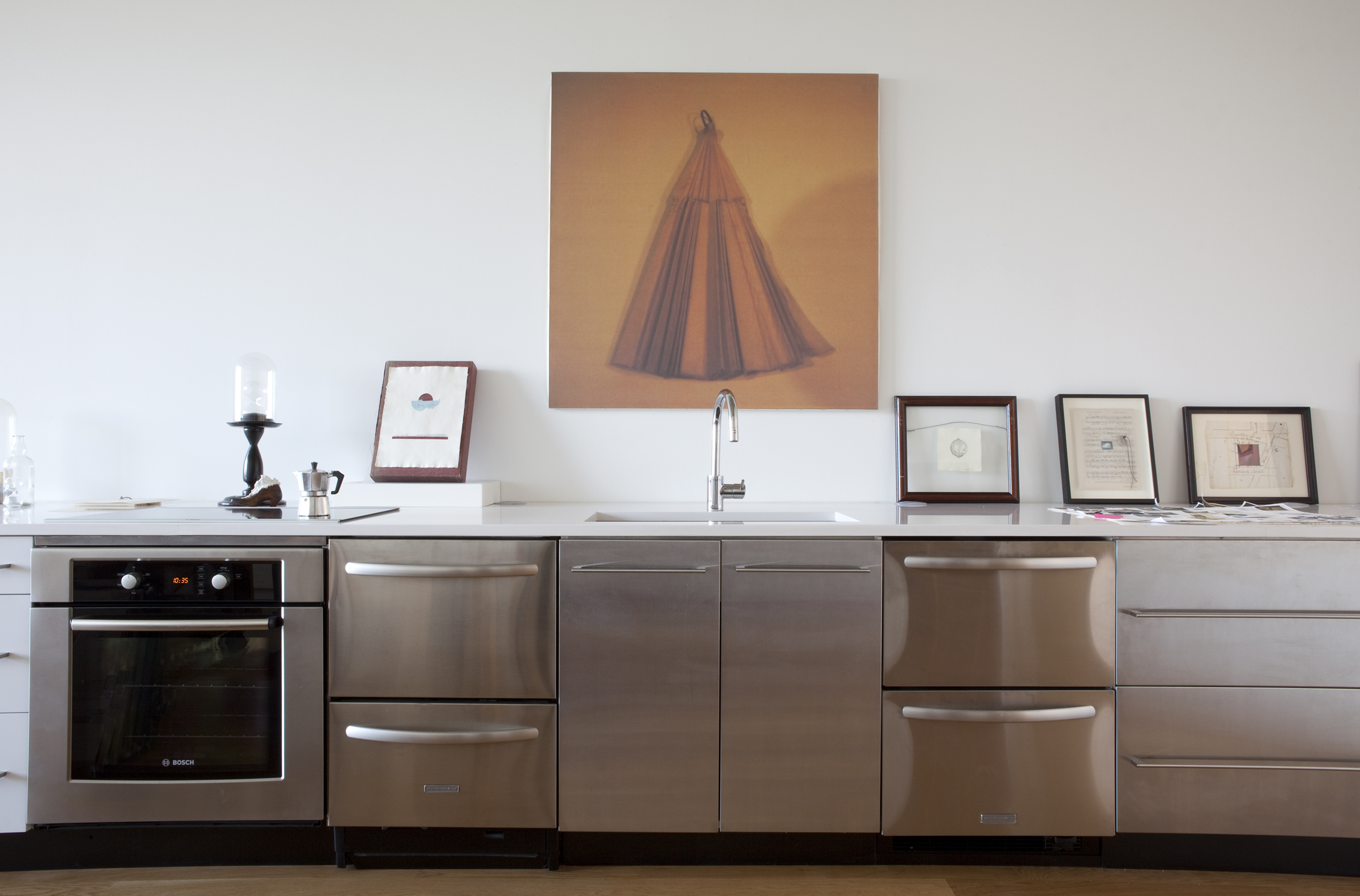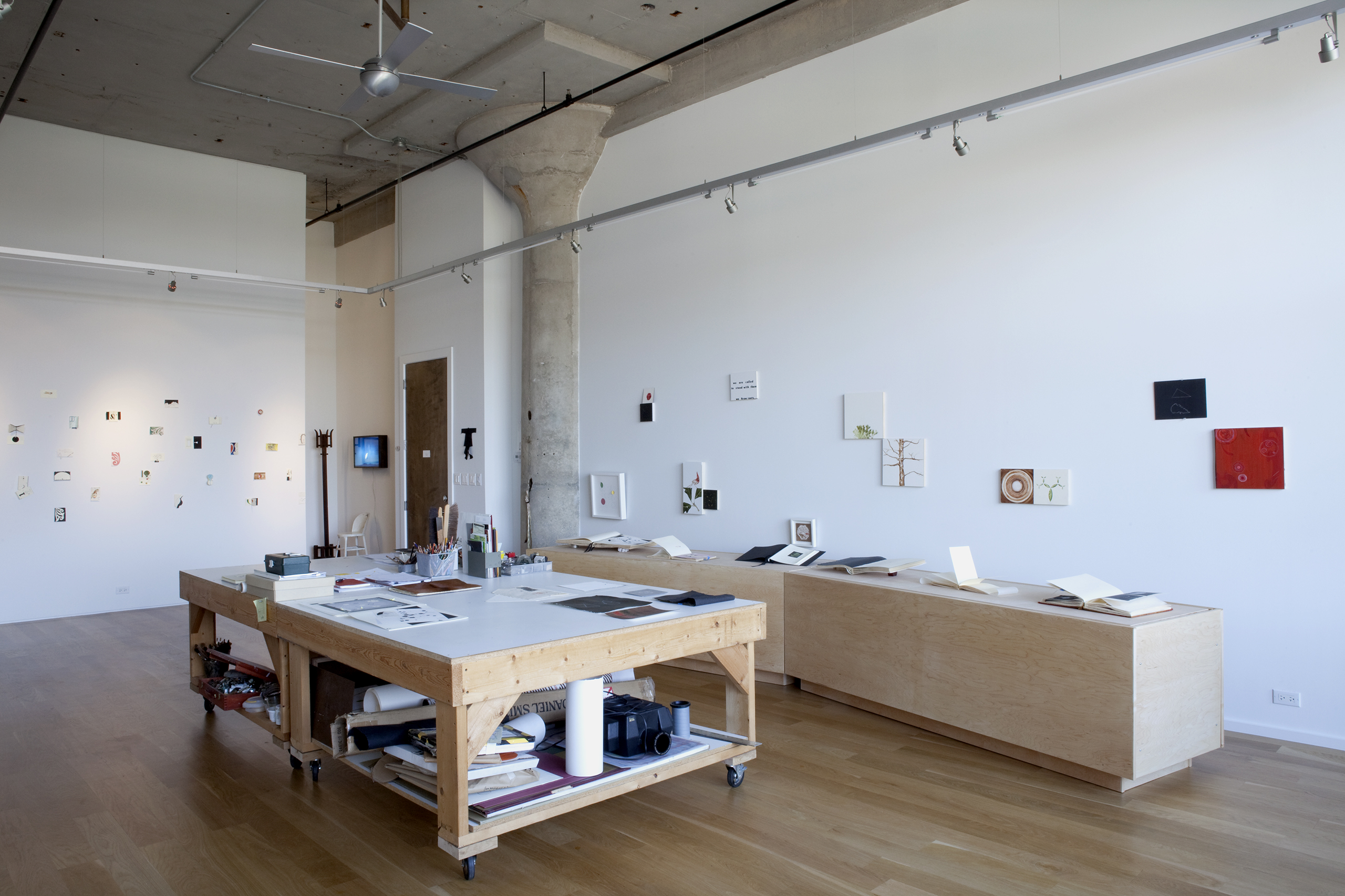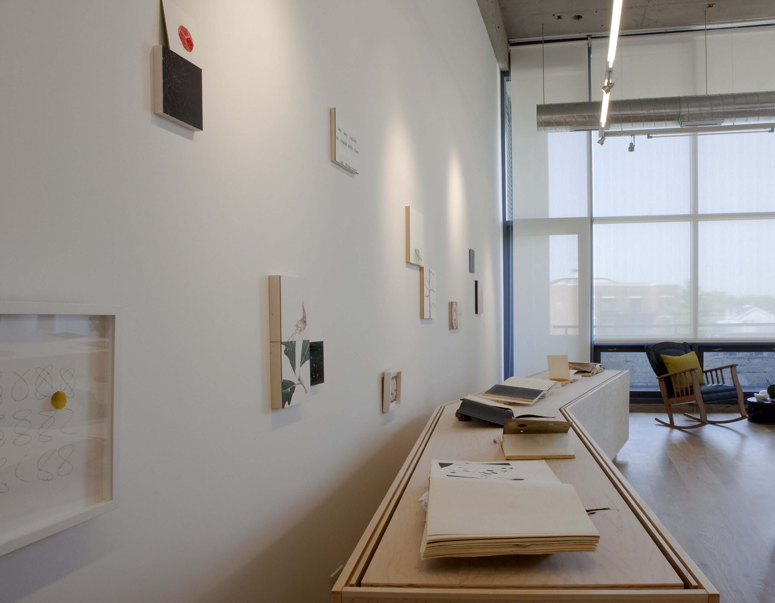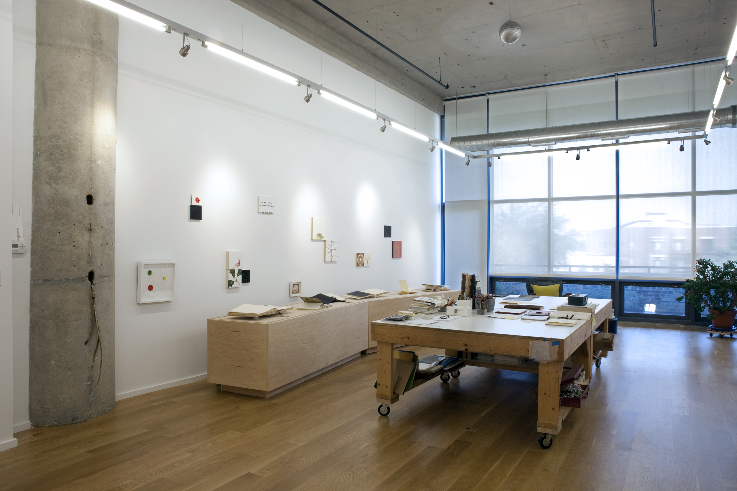 An artist/friend purchased a partially built-out residential unit in an existing loft conversion to serve as her professional studio. Partitions were removed to provide a single rectangular room, the space was further clarified with a rectangle of lighting and visually anchored by a tall, centered rectangular wall. Cooking provisions are subsumed into a deep three foot work/object display counter.