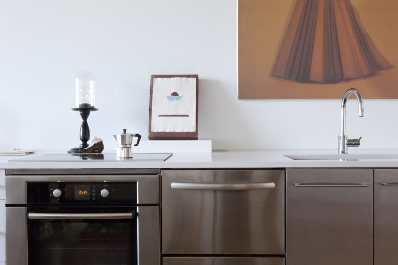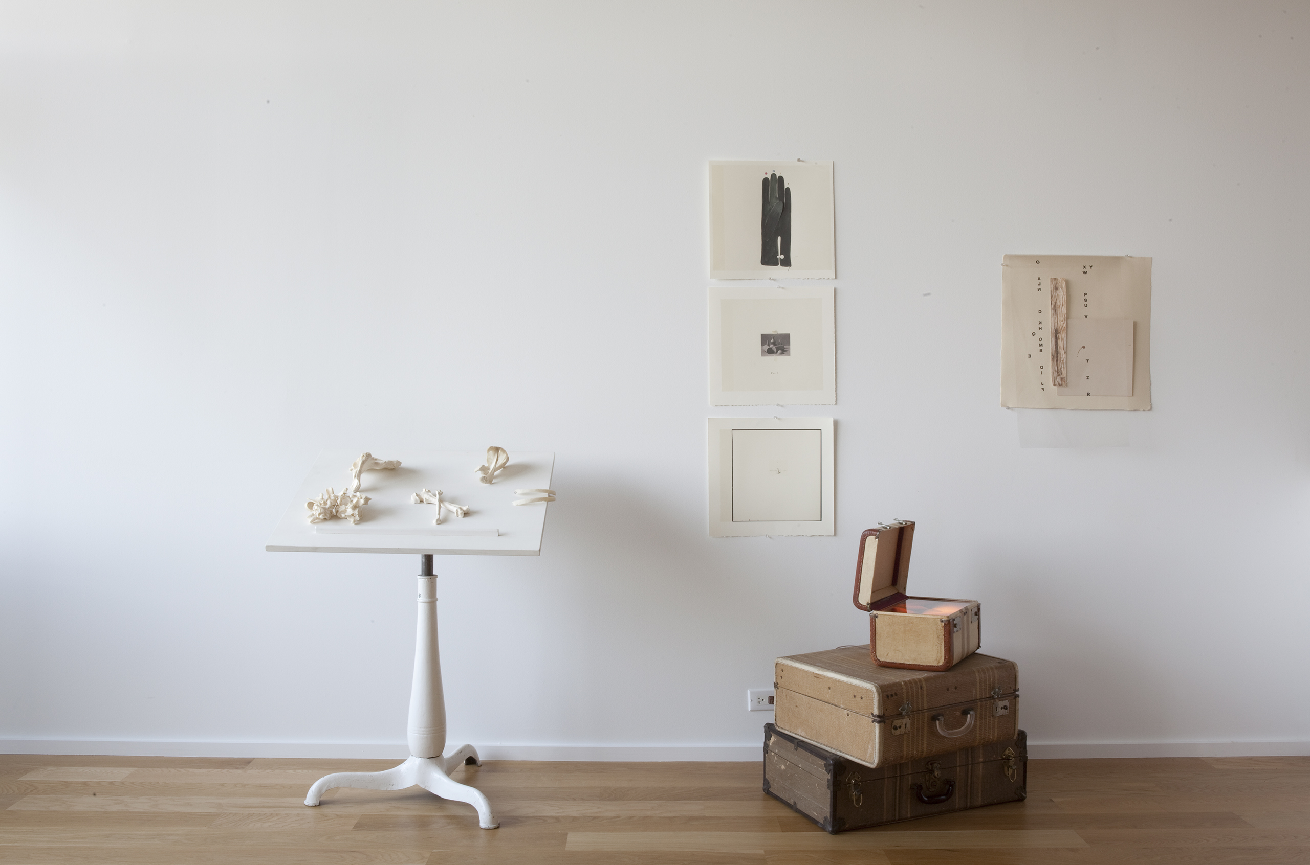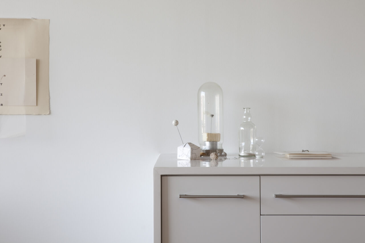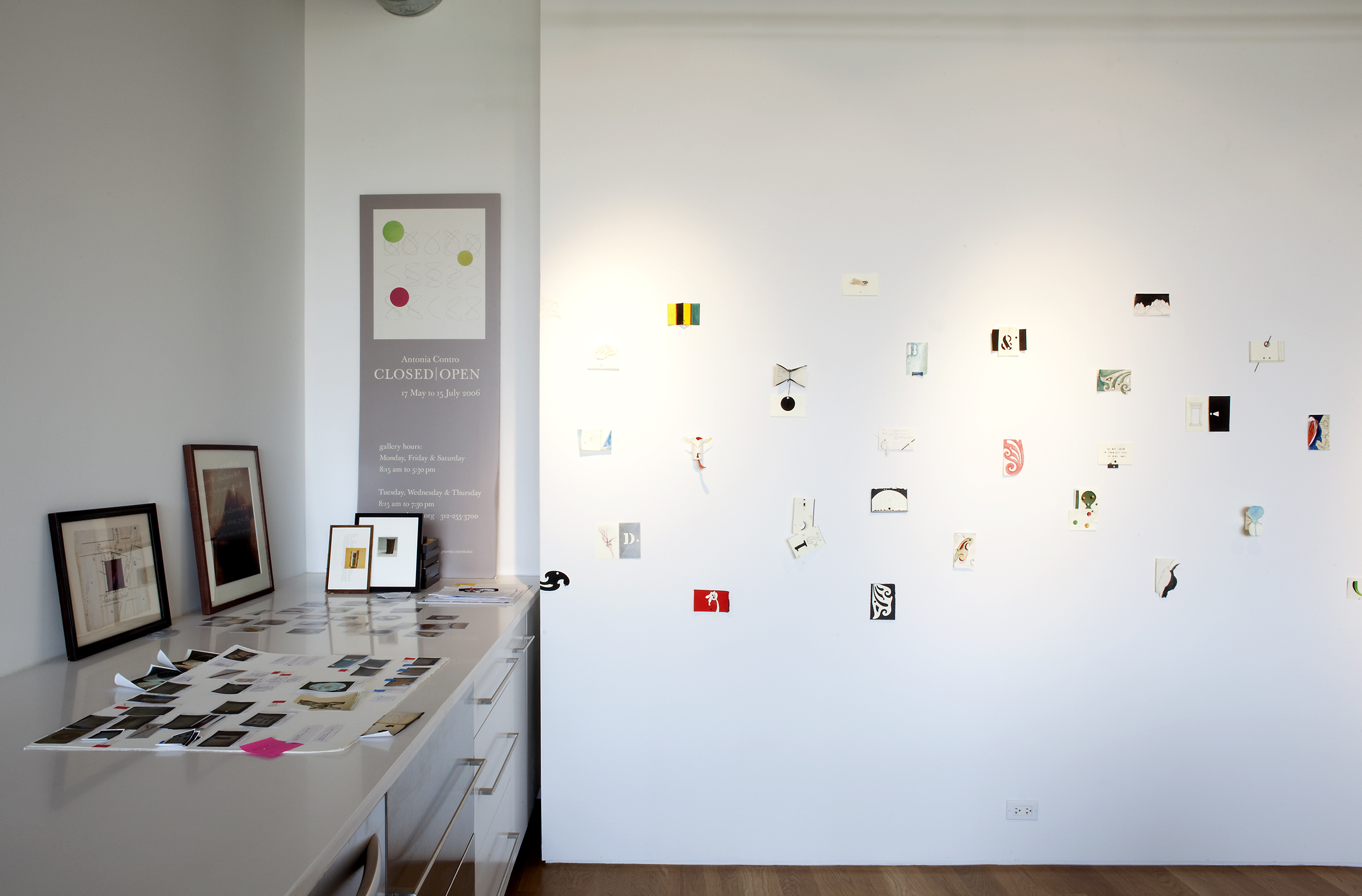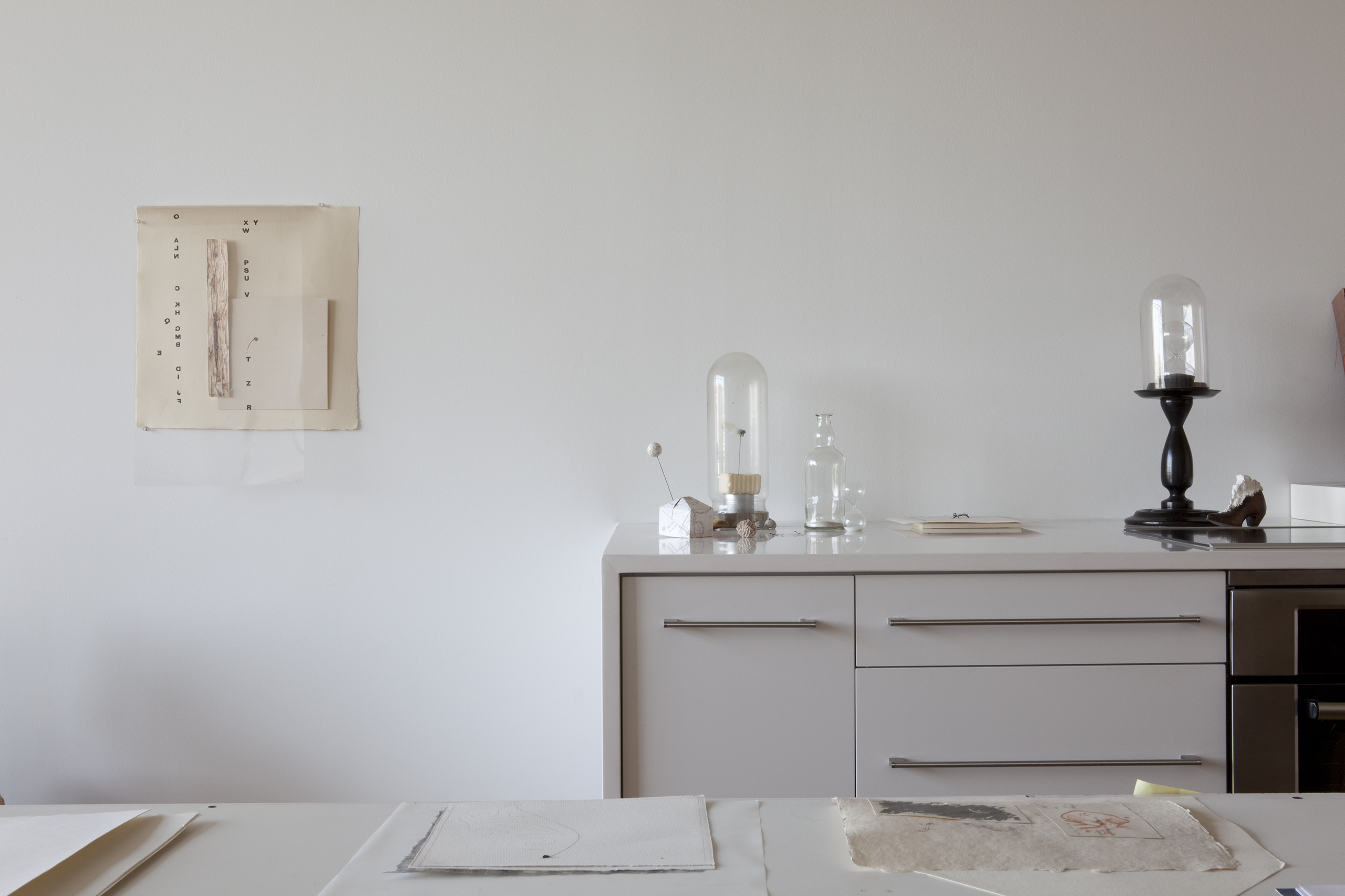 An artist/friend purchased a partially built-out residential unit in an existing loft conversion to serve as her professional studio. Partitions were removed to provide a single rectangular room, the space was further clarified with a rectangle of lighting and visually anchored by a tall, centered rectangular wall. Cooking provisions are subsumed into a deep three foot work/object display counter.