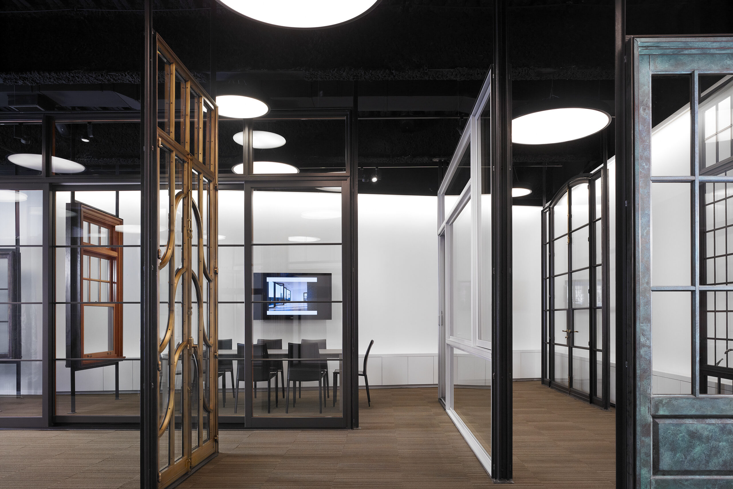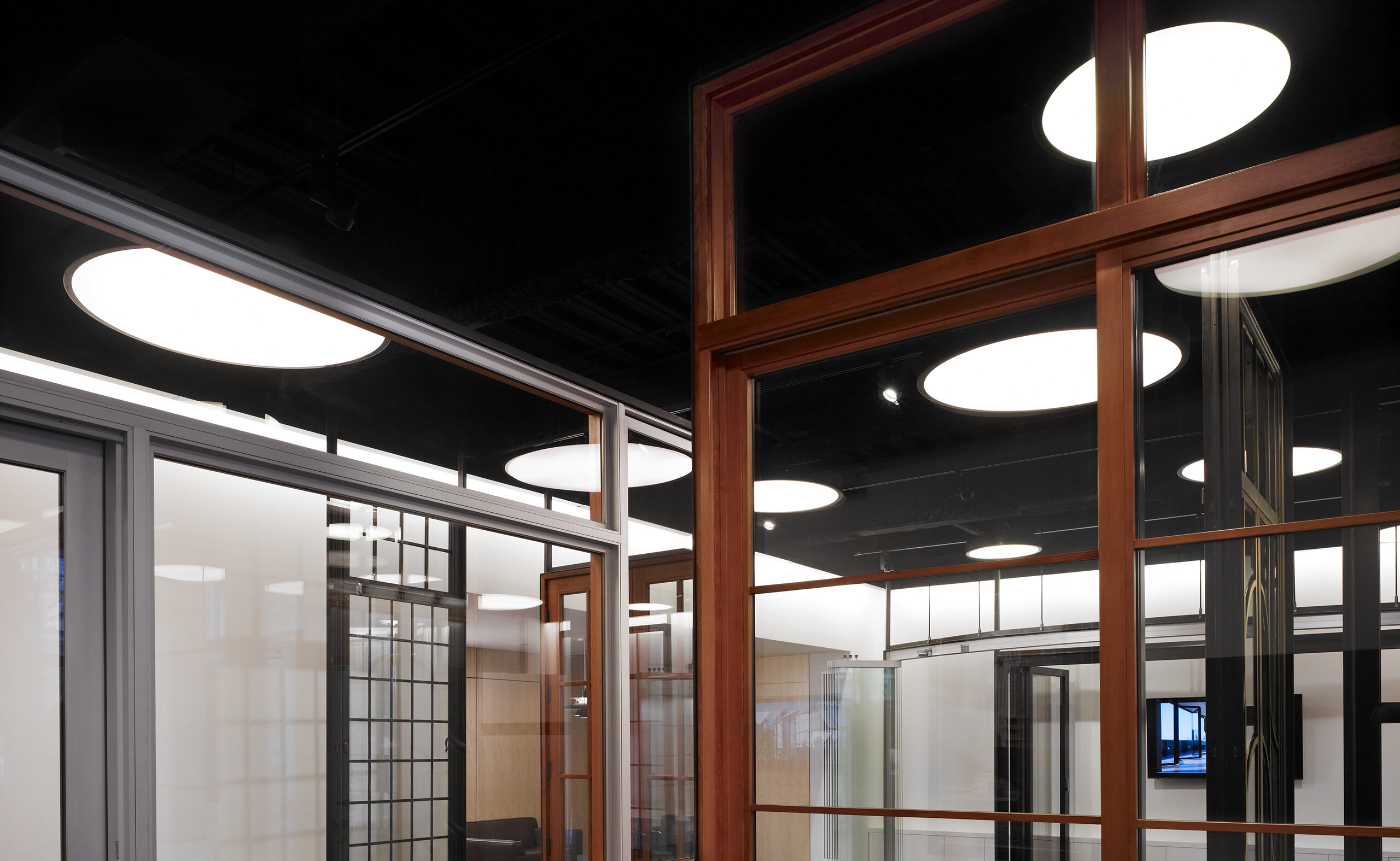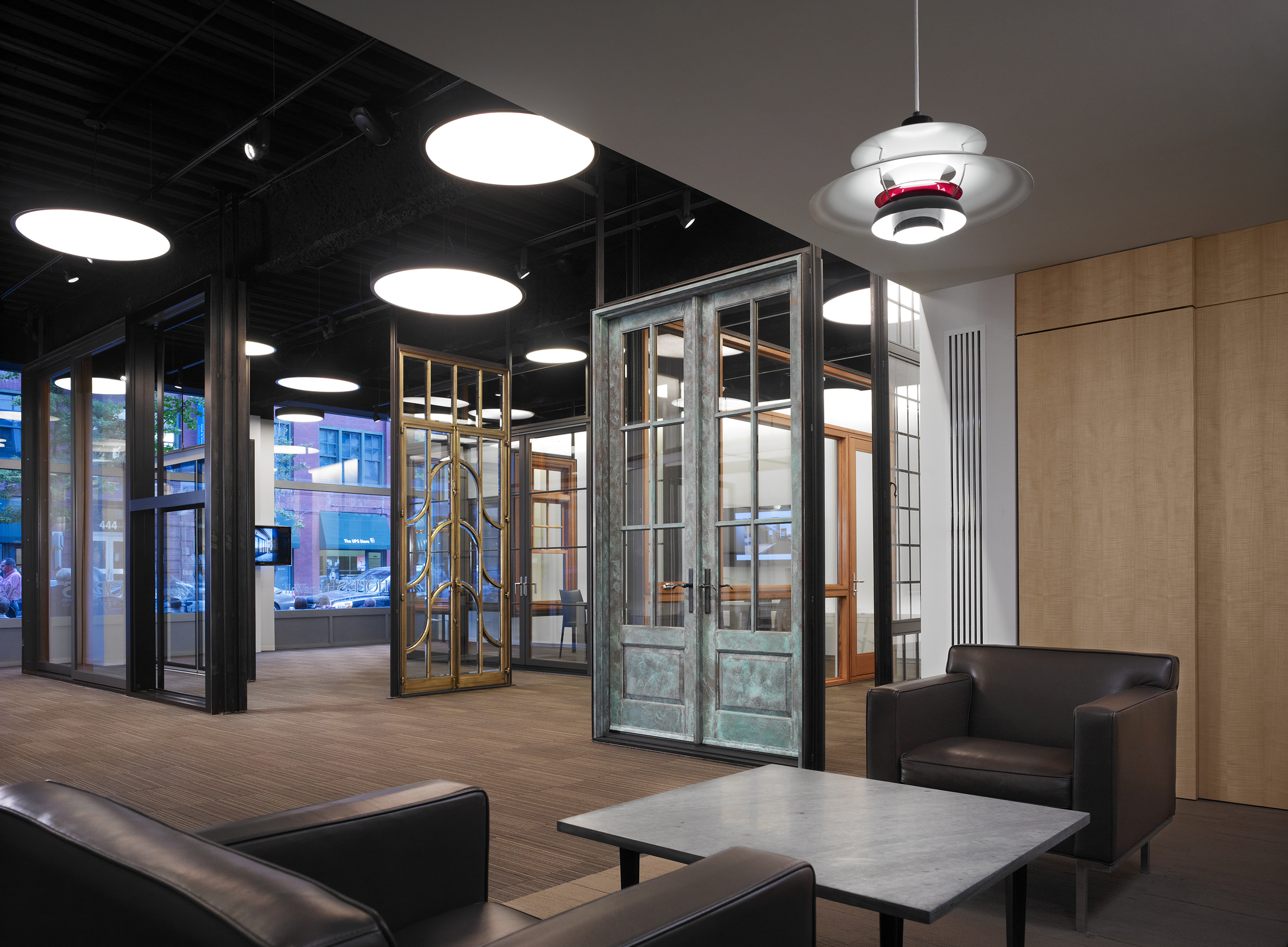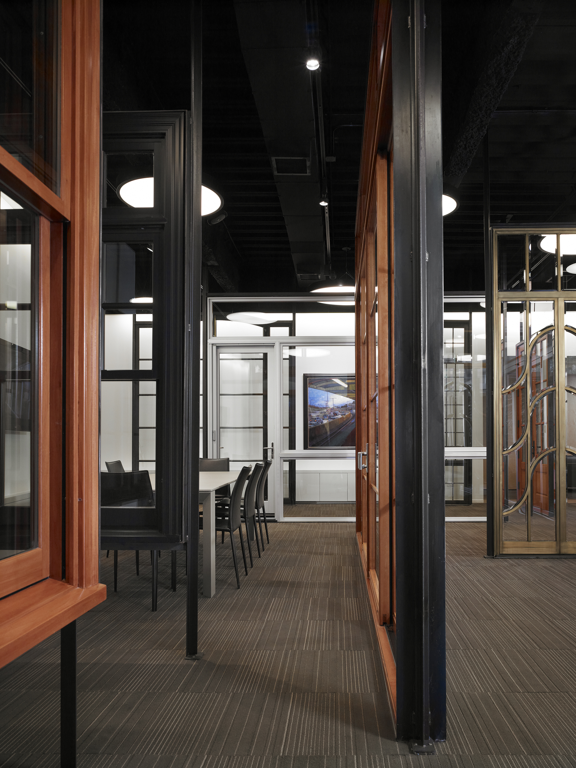 The windows and doors were supported in steel plate frames supported by hot rolled steel t-sections. Transparent window display panels are set parallel and perpendicular to each other defining interconnecting rooms and spaces while allowing for visual continuity of the showroom. Large circular light fixtures float below the exposed structure and mechanical support to define a horizontal ceiling plane. The scale changes in the rear of the showroom as wooden panels delineate an intimate conference area, kitchenette, and the support services behind.