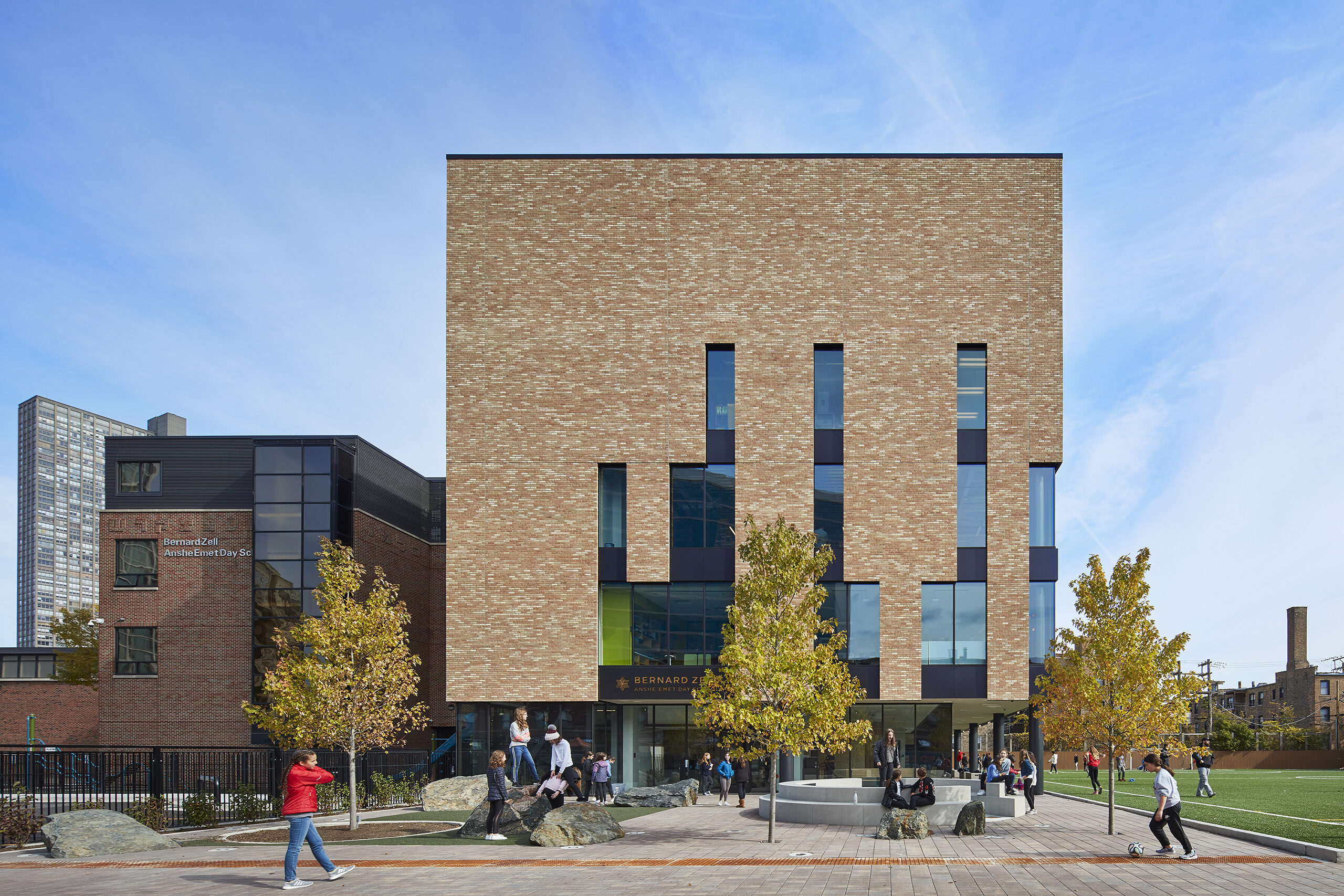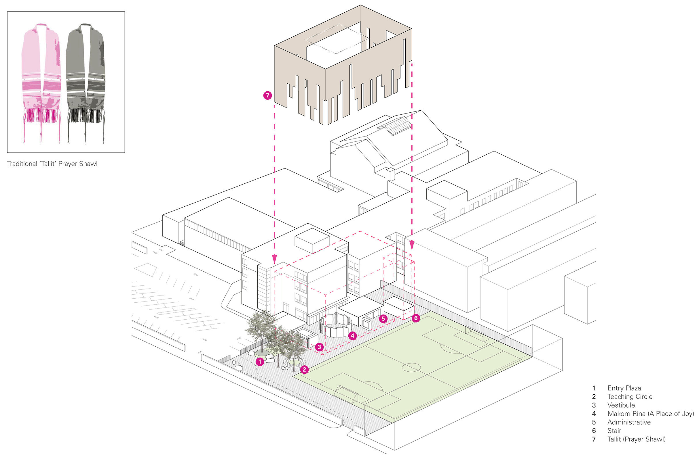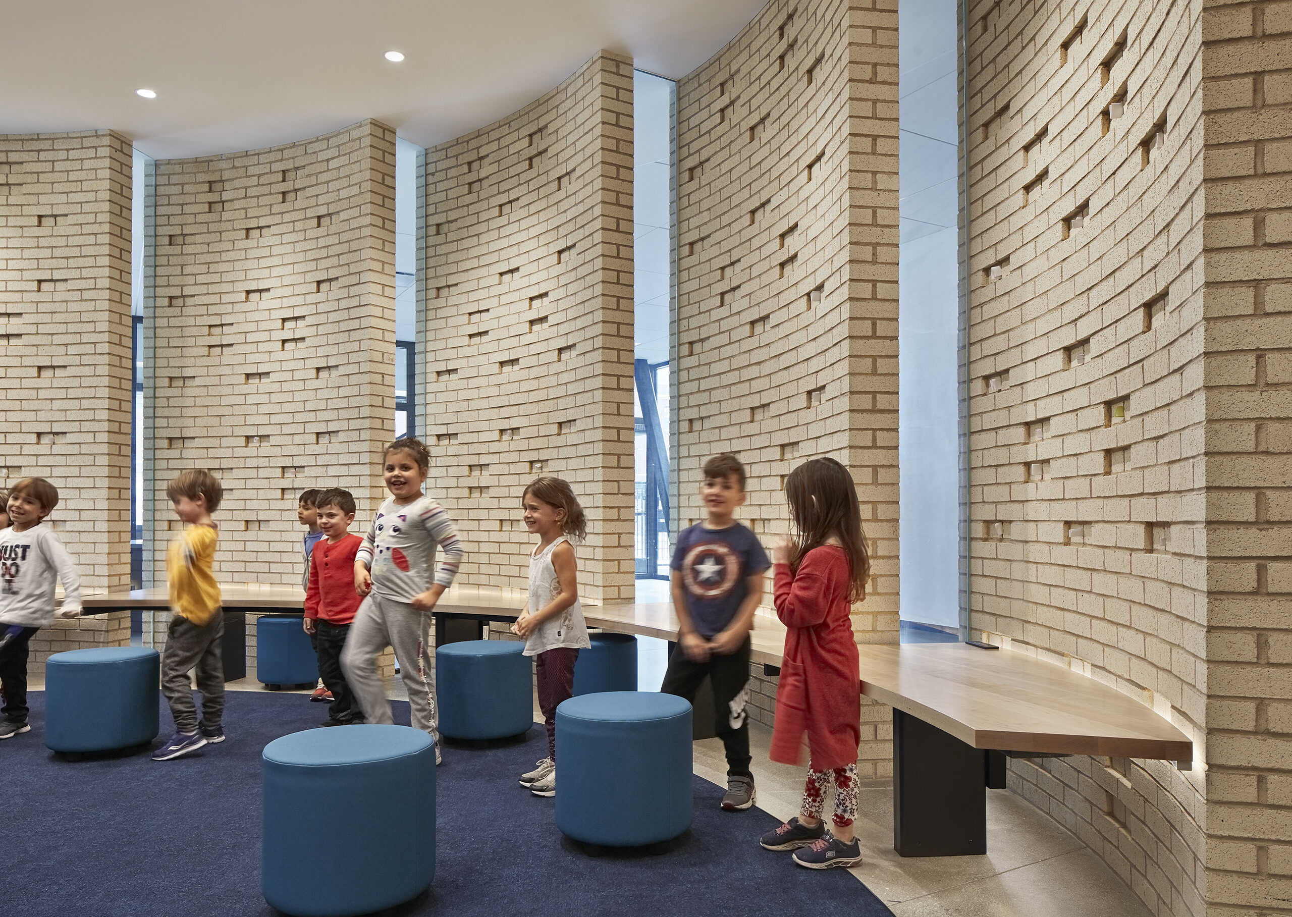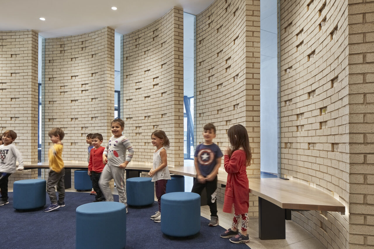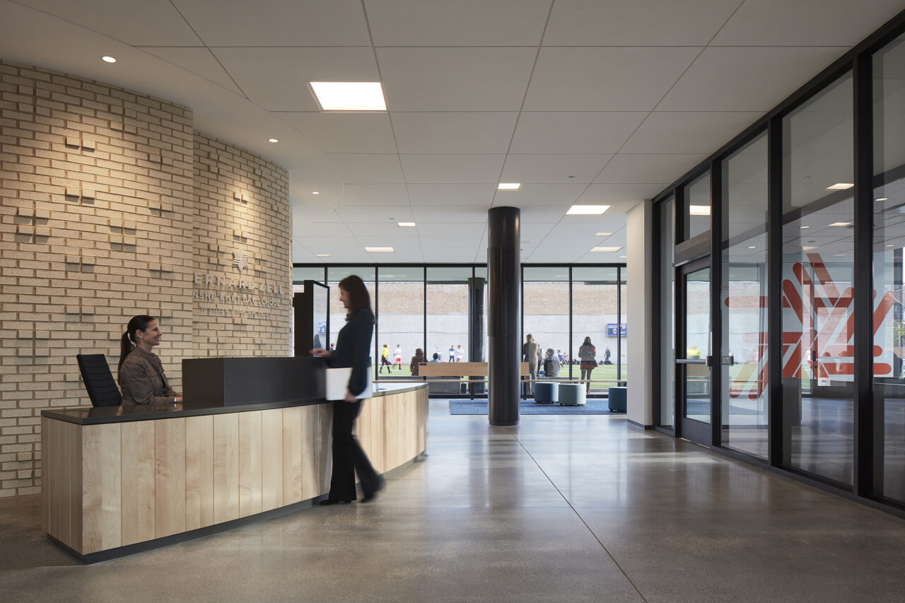 From outside, a light-colored brick ‘Tallit’ wraps the new addition—just as a traditional Jewish tallit (a fringed prayer shawl) covers one’s shoulders to prepare for reflection, prayer, and worship. The façade teaches students through this expression and symbolism; each string in the fringes reminding students they are all unique in their own way yet intertwined, the tzitzit (fringe) knots – to do mitzvot (acts of loving kindness).
