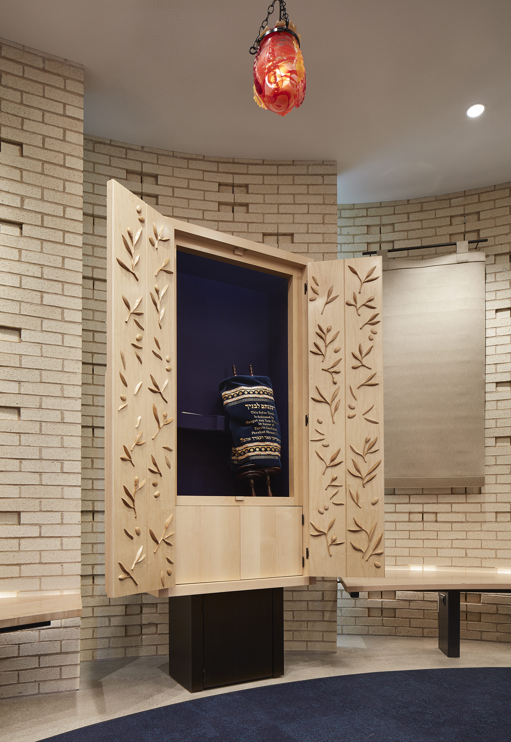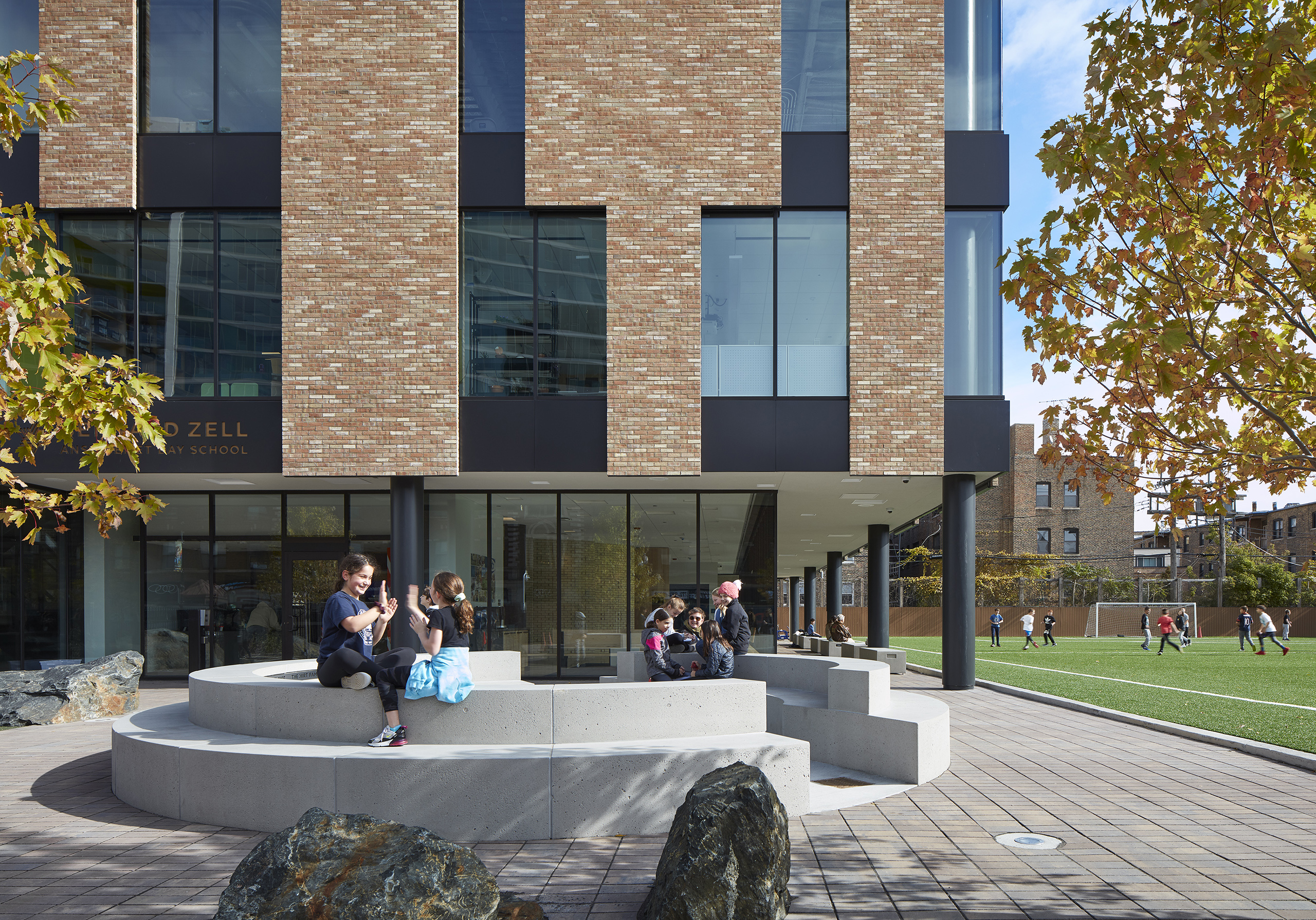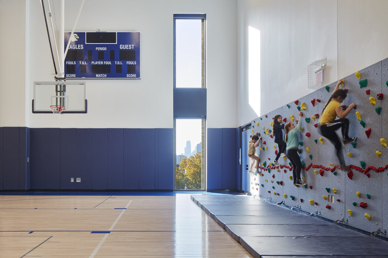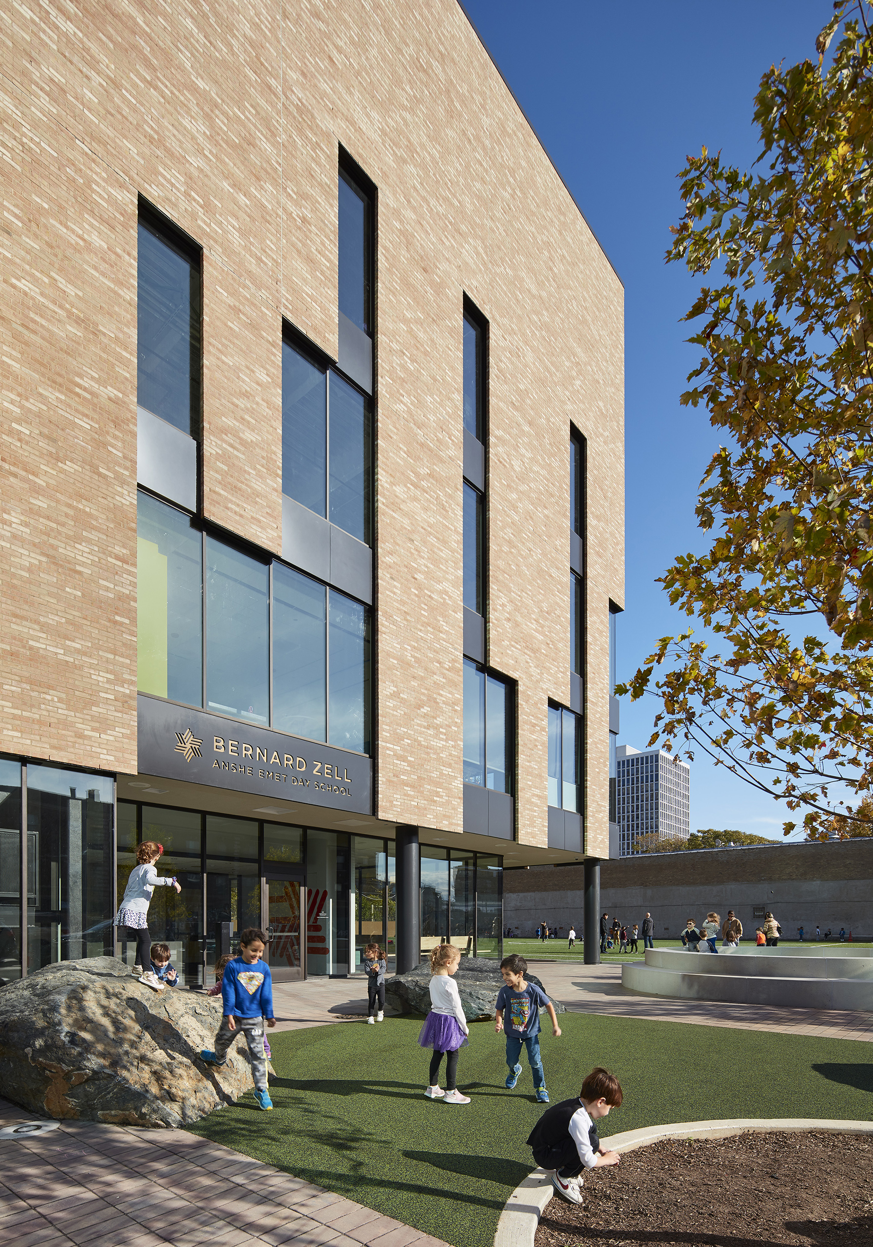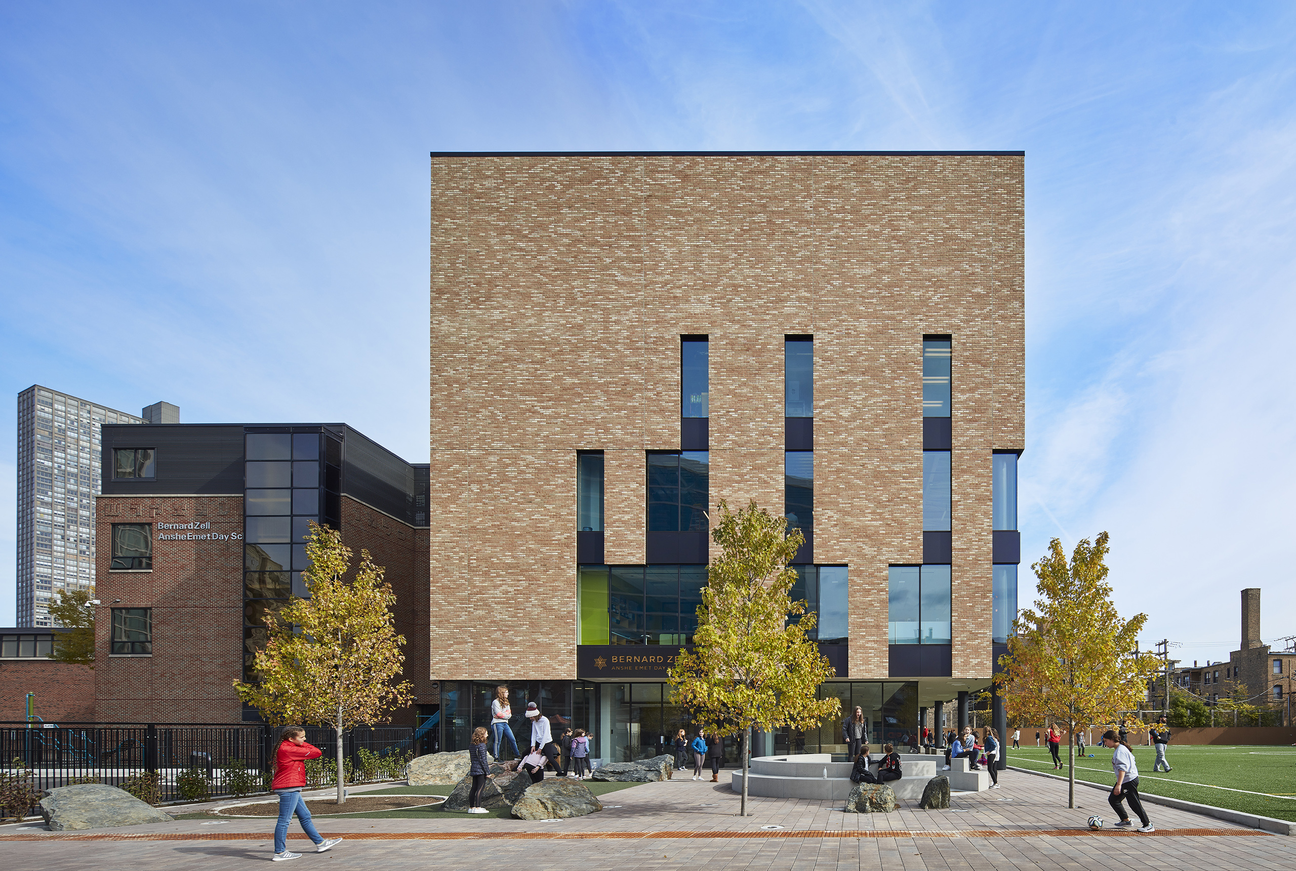 From outside, a light-colored brick ‘Tallit’ wraps the new addition—just as a traditional Jewish tallit (a fringed prayer shawl) covers one’s shoulders to prepare for reflection, prayer, and worship. The façade teaches students through this expression and symbolism; each string in the fringes reminding students they are all unique in their own way yet intertwined, the tzitzit (fringe) knots – to do mitzvot (acts of loving kindness).
