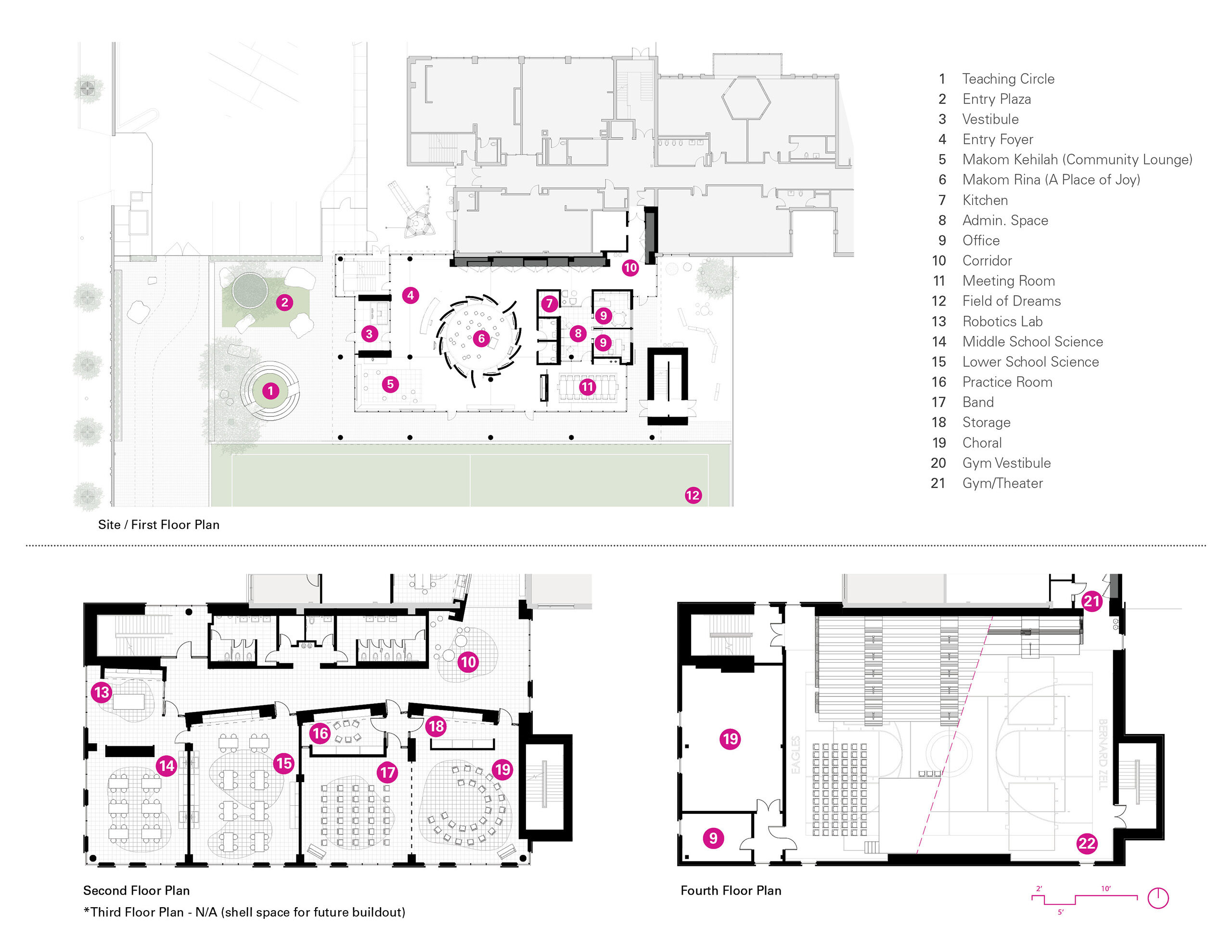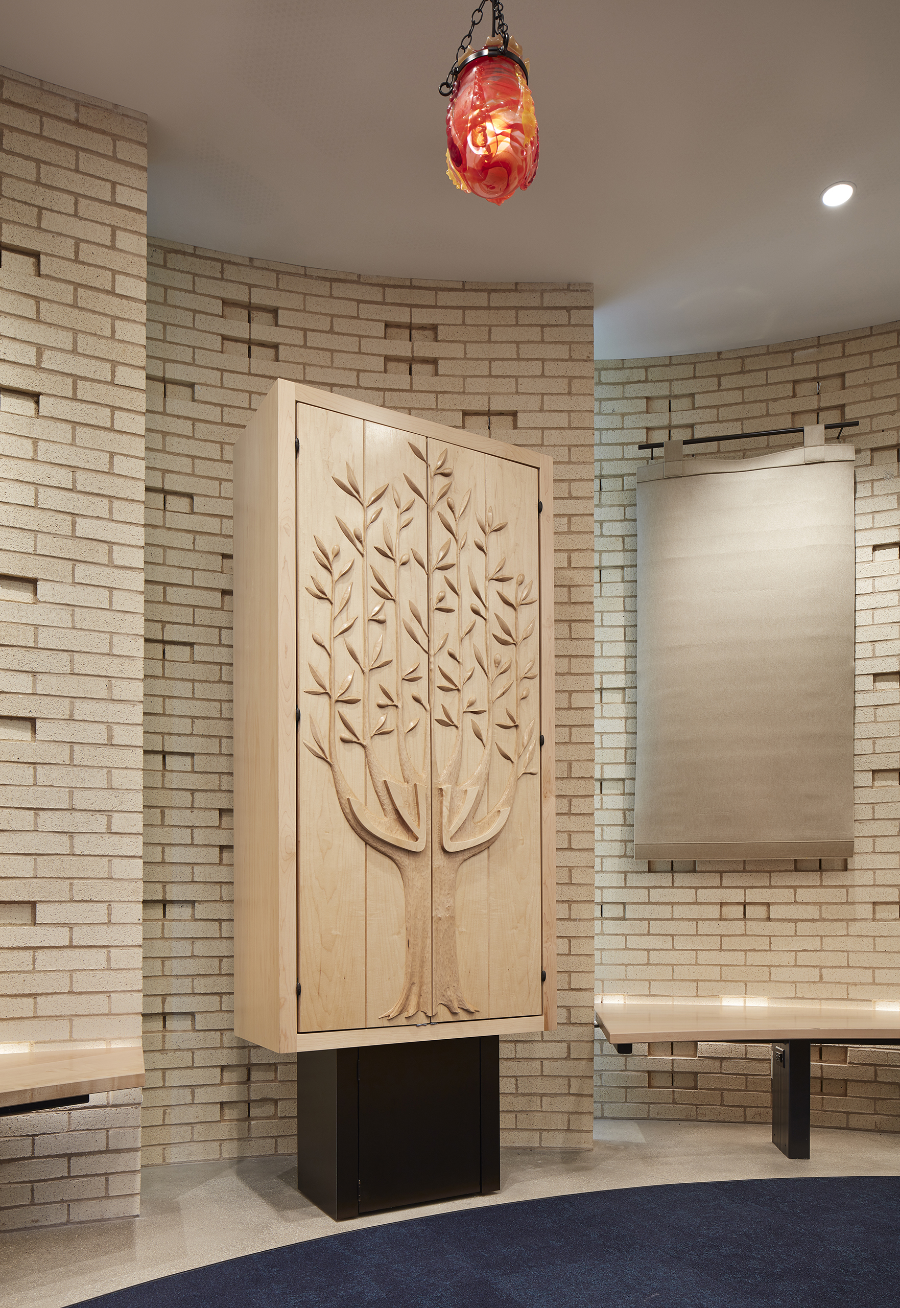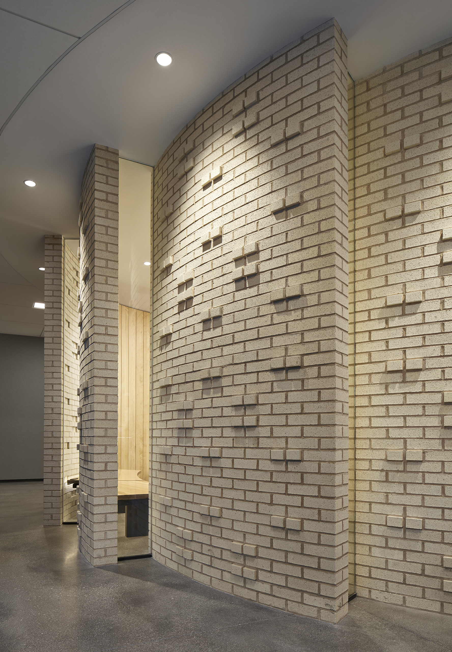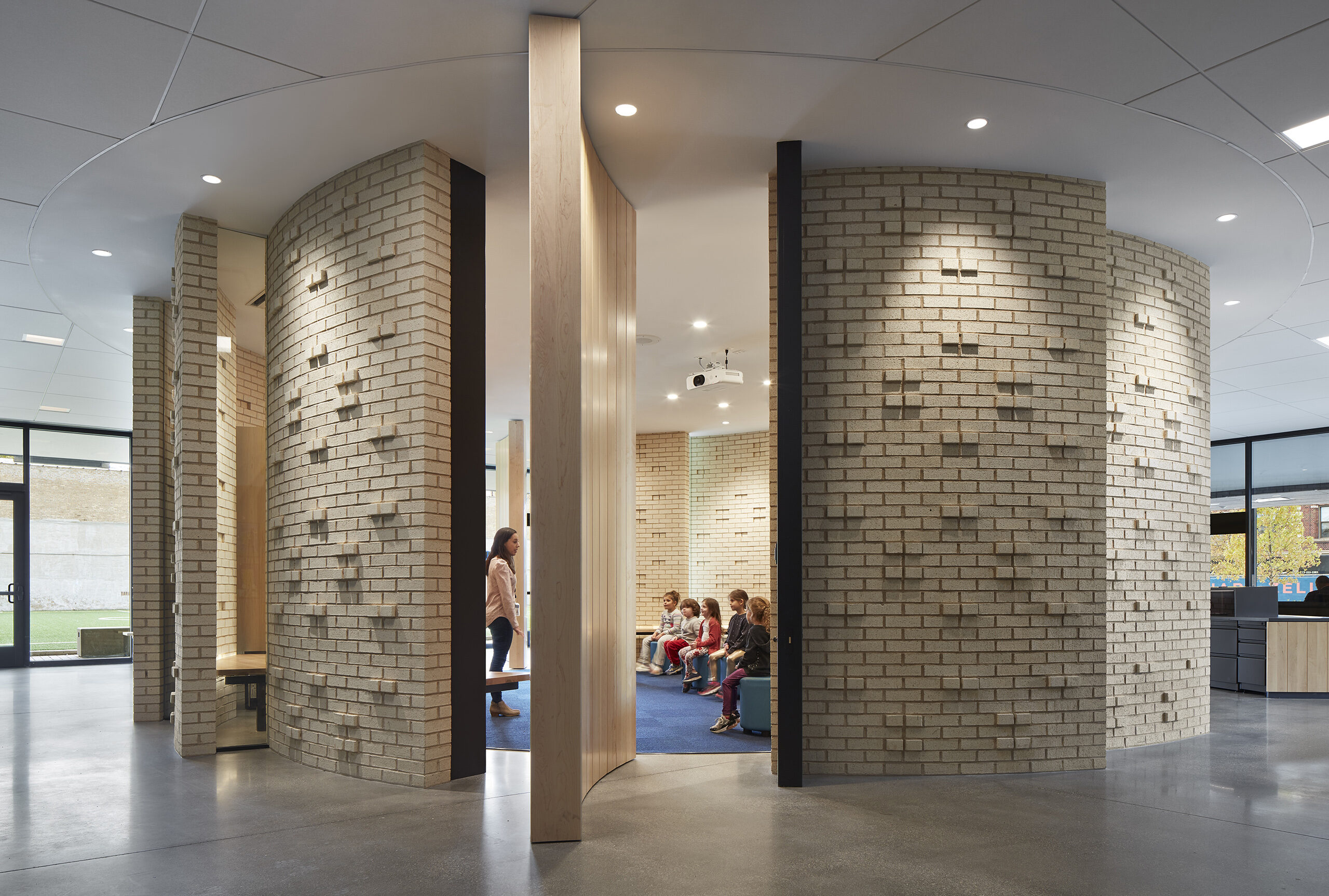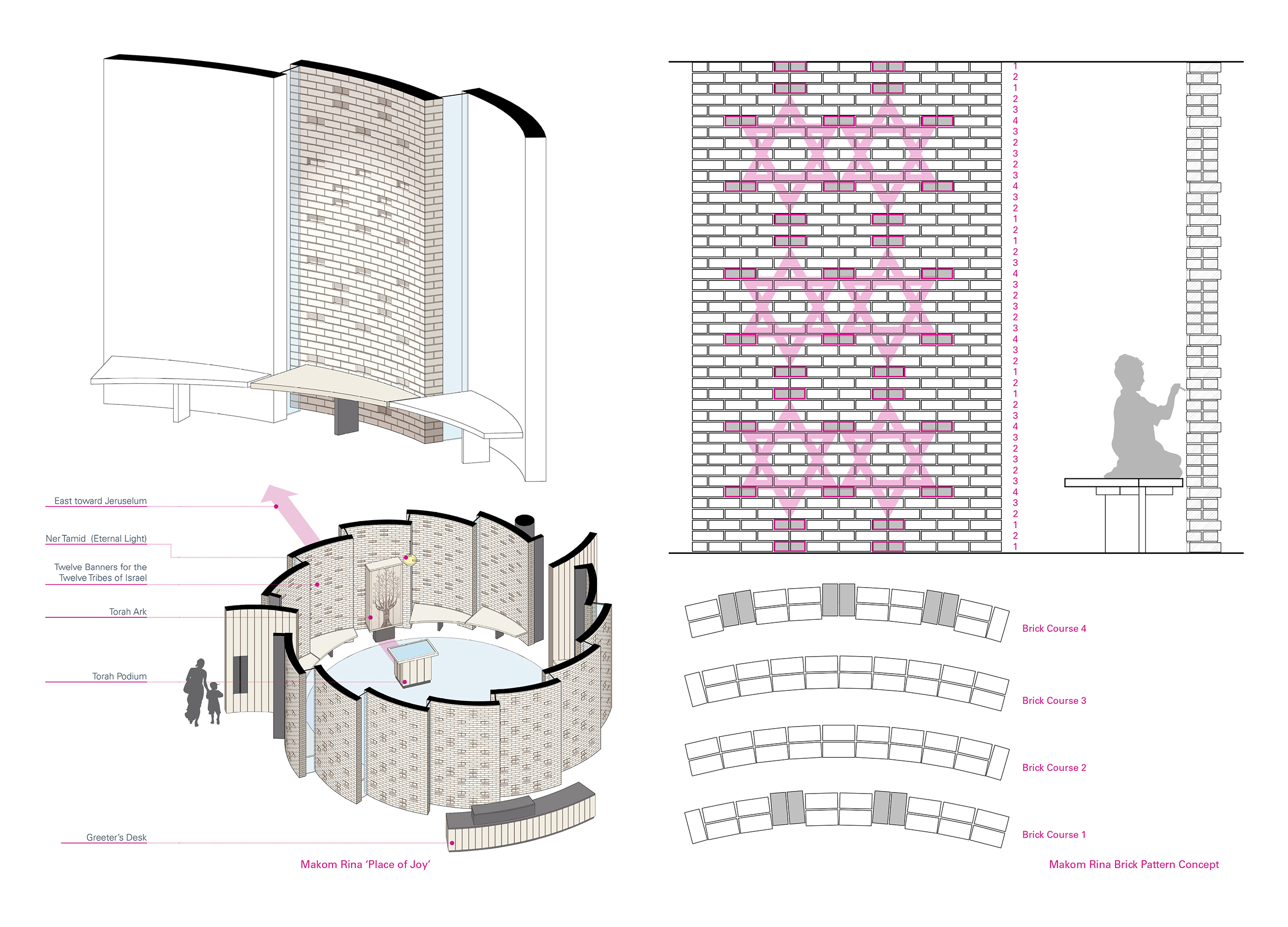 At the heart of the new school addition is a brick and glass sacred space—The Makom Rina or ‘Place of Joy’. Twelve curved brick walls pinwheel in plan to allow glimpses to the musical and spiritual activities taking place inside.