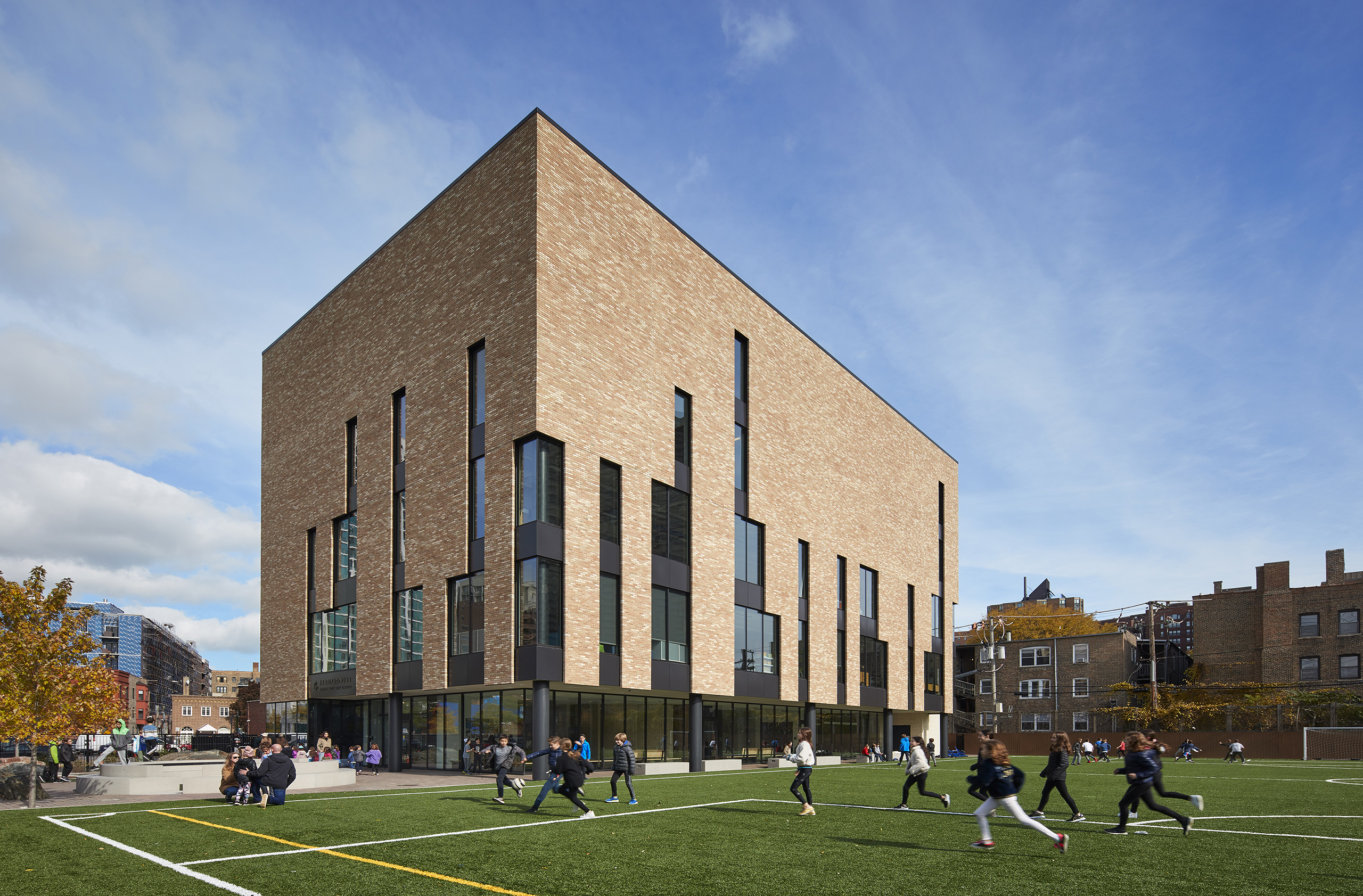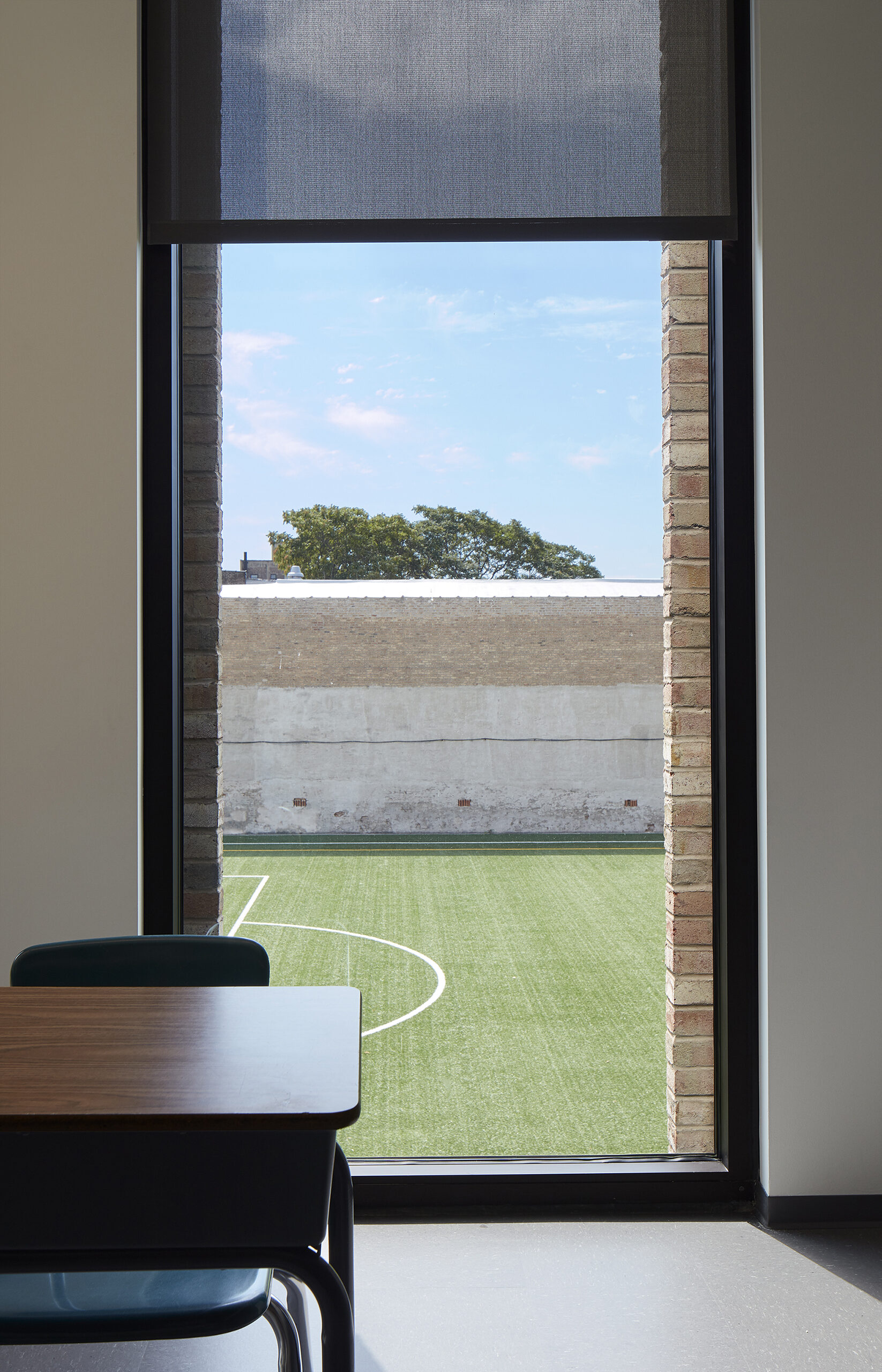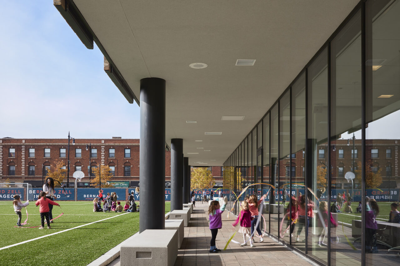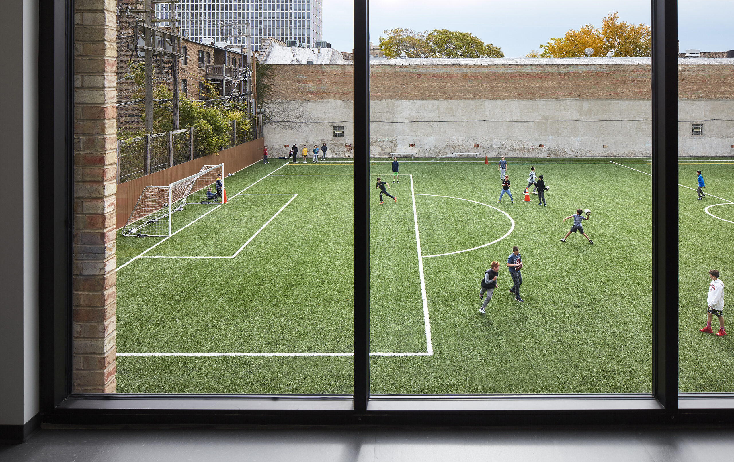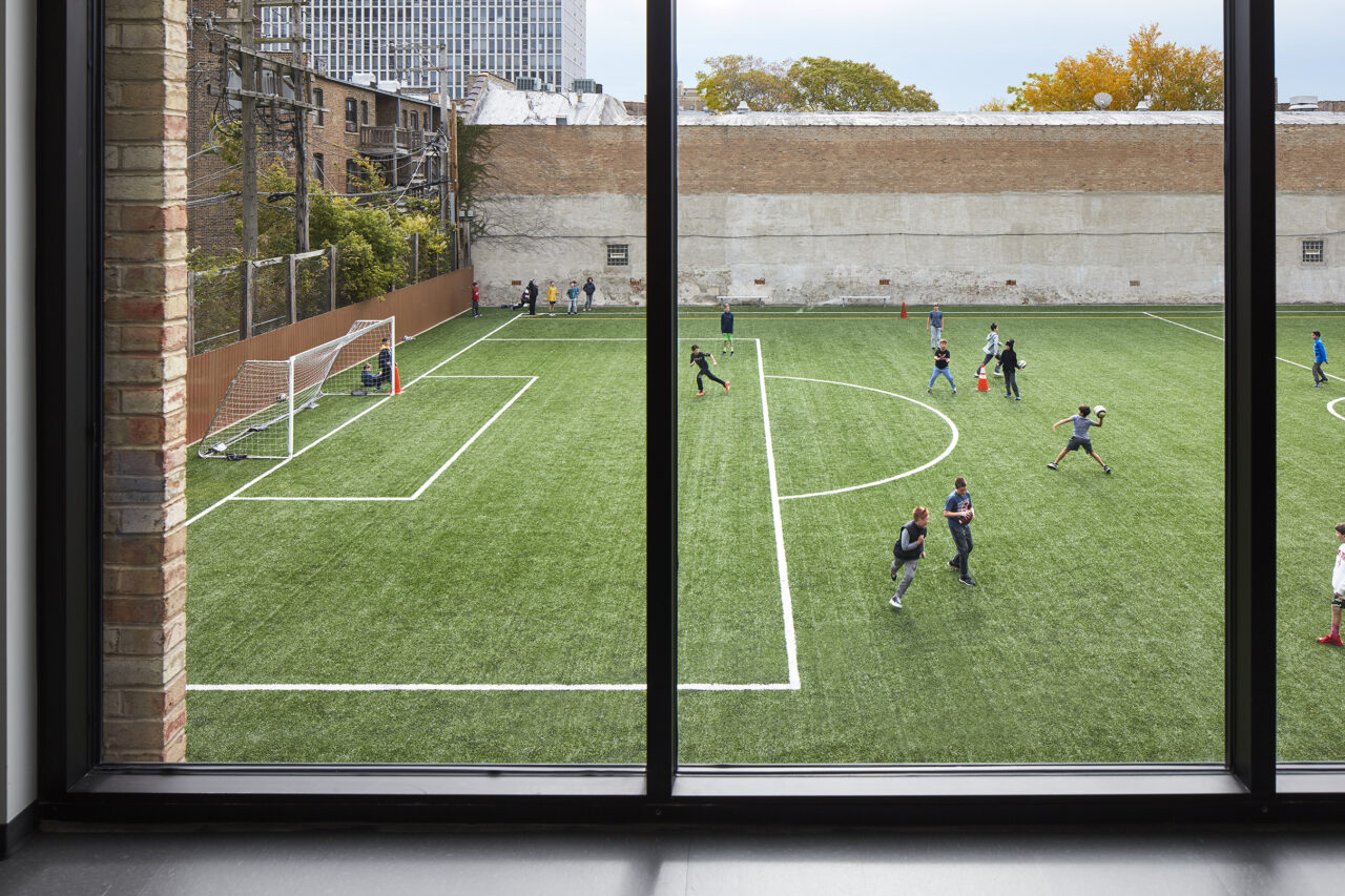 Immediately, they are visibly connected to activities all around them: students playing in the outdoor field and play areas, faculty and parents relaxing in an open lounge, administrators and staff meeting in the conference room, and students ascending a stair to their classrooms and gymnasium.
