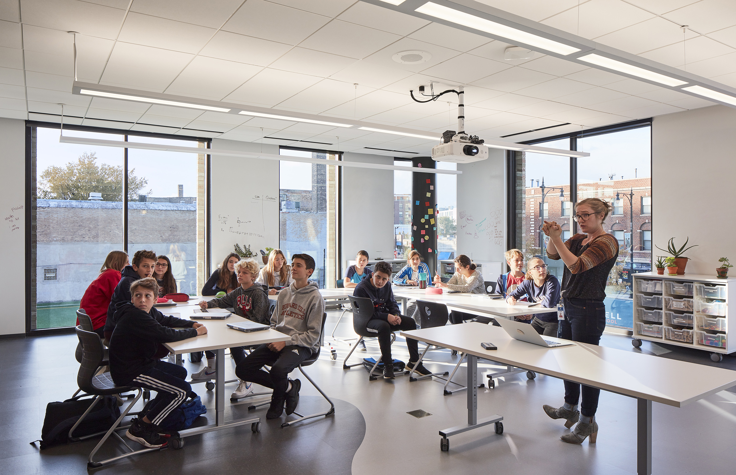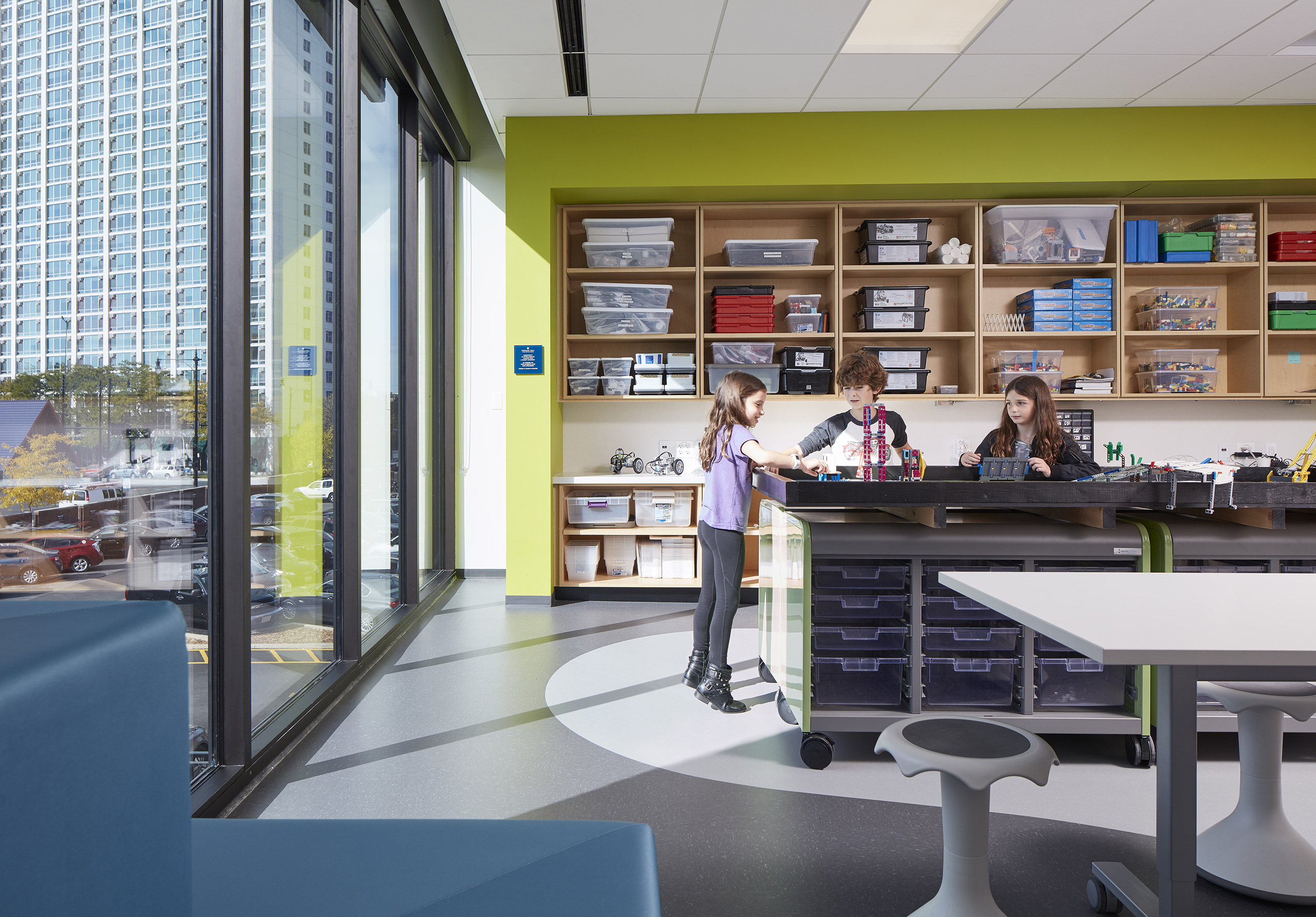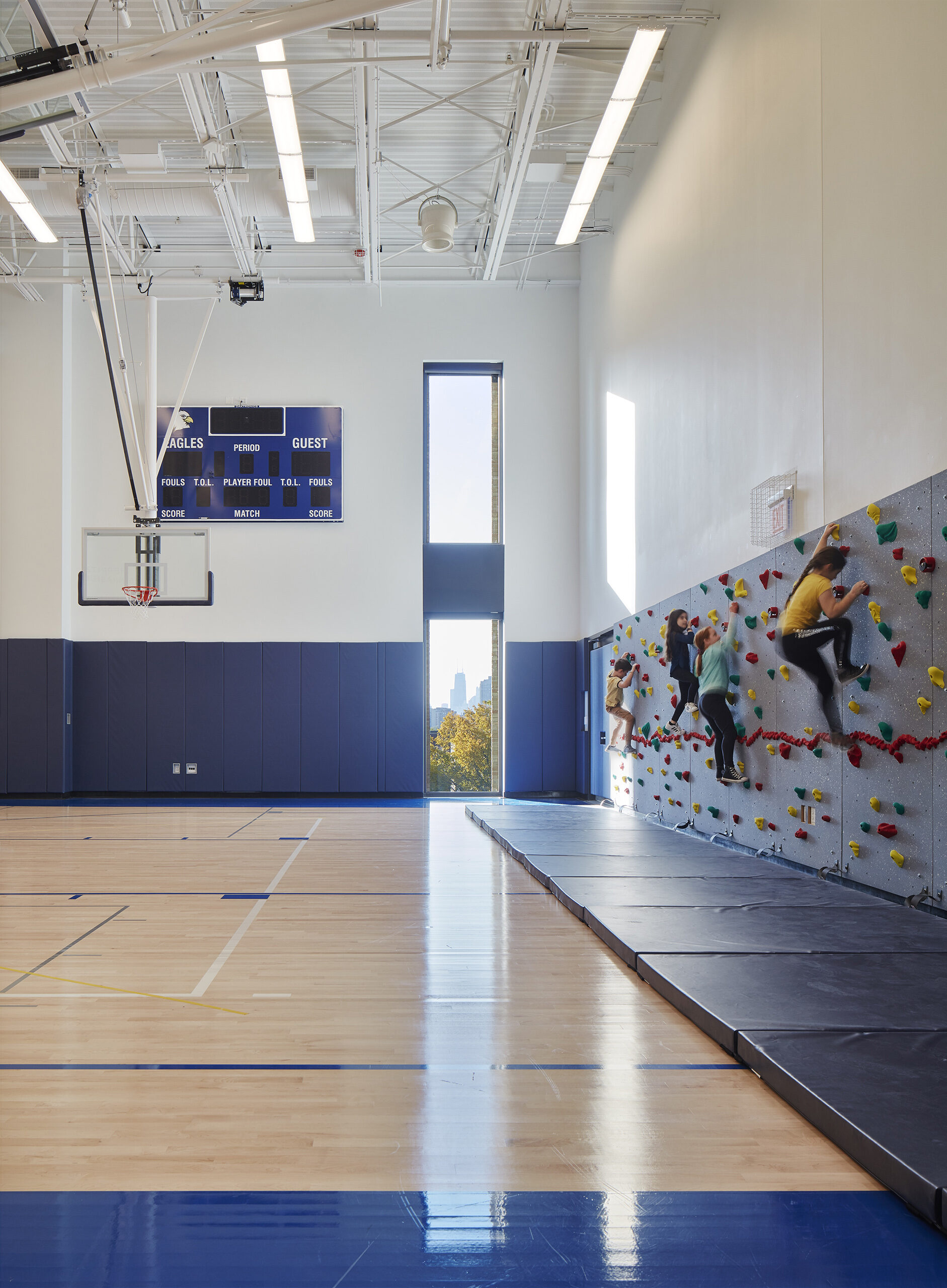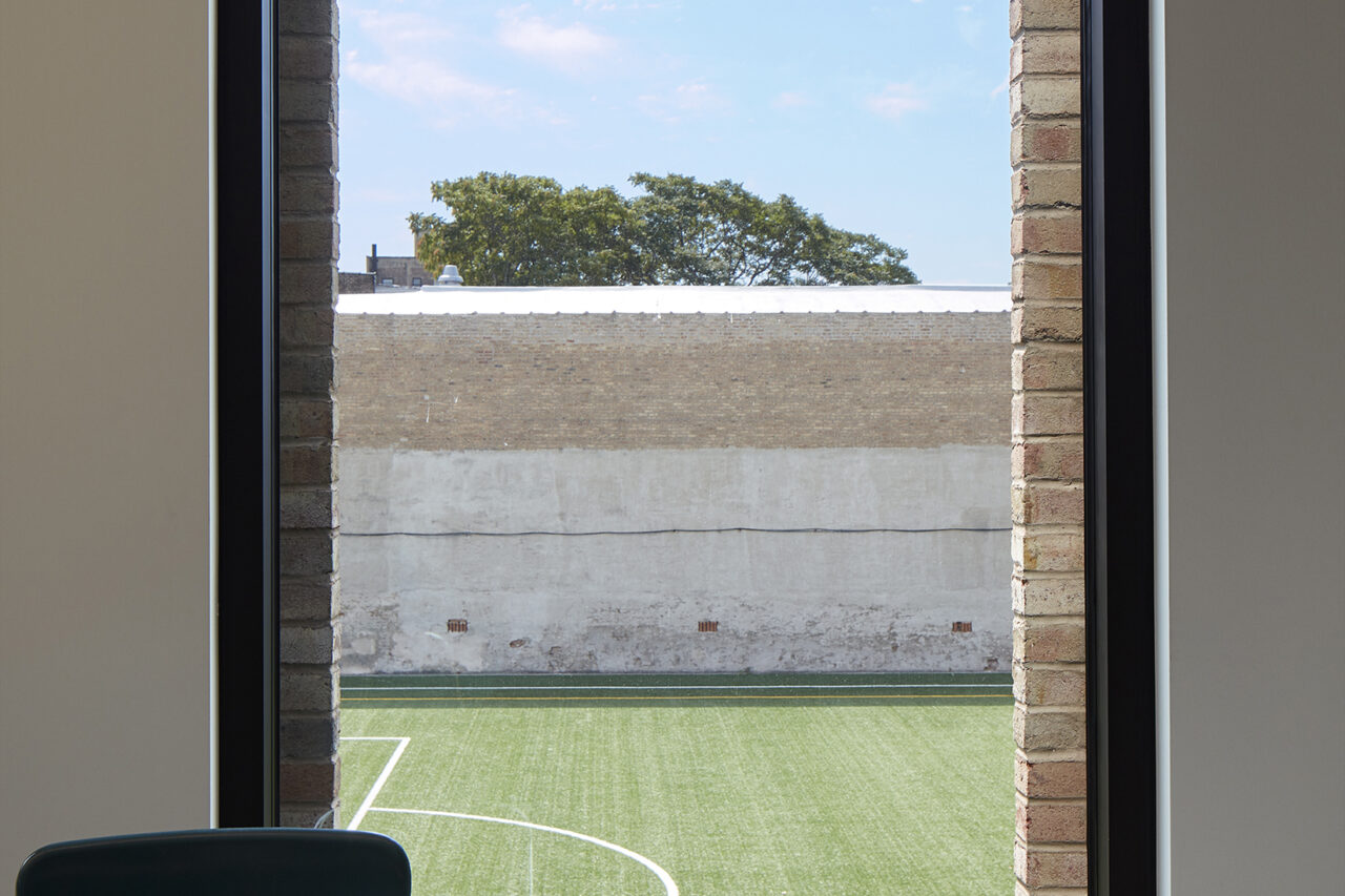 Immediately, they are visibly connected to activities all around them: students playing in the outdoor field and play areas, faculty and parents relaxing in an open lounge, administrators and staff meeting in the conference room, and students ascending a stair to their classrooms and gymnasium.