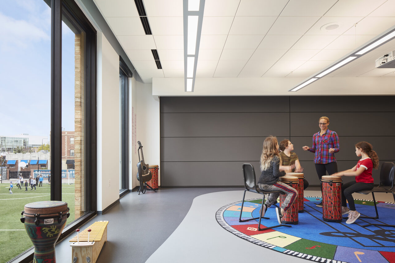Designed to support the school’s evolving curriculum, music classrooms feature a retractable wall to enable the spaces to be used in various configurations and capacities. Once open, the music classroom can accommodate enough students to mimic the capacity of the school’s stage. The enlarged space is also used for faculty workshops, parent-teacher meetings, and other community events.