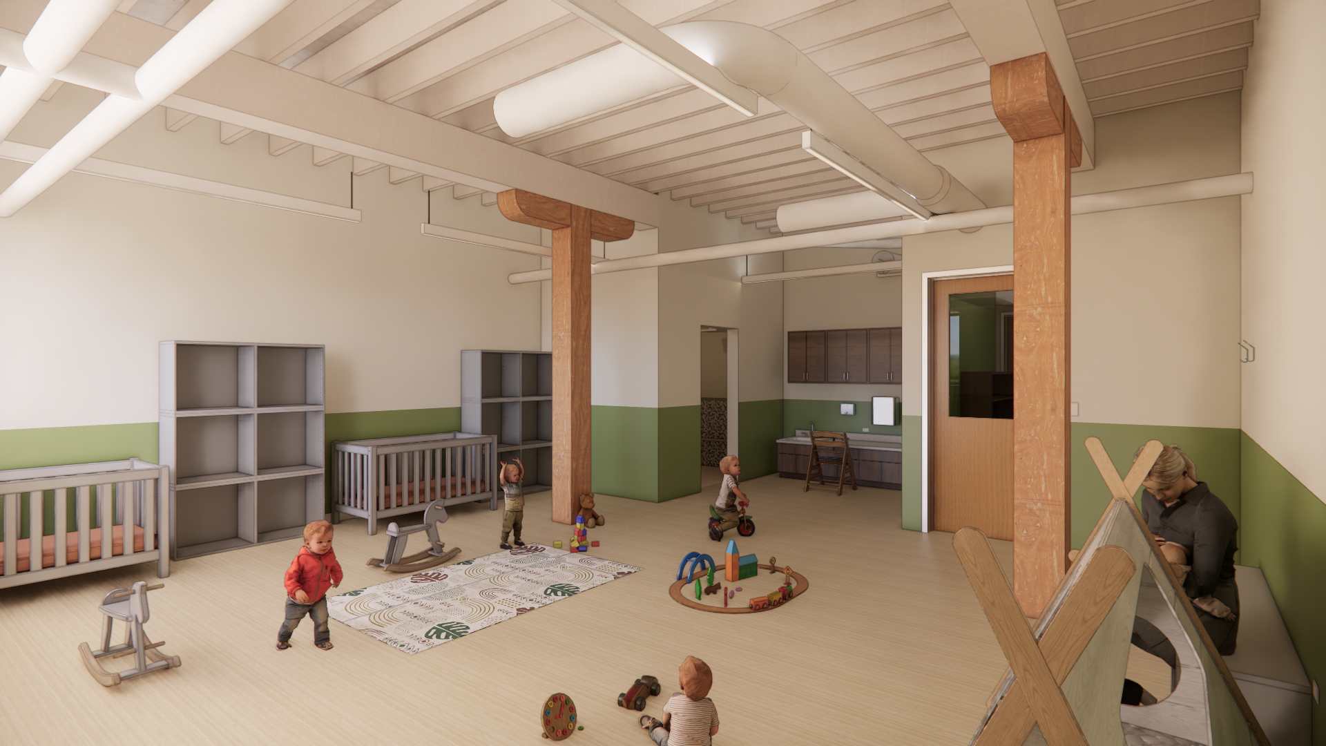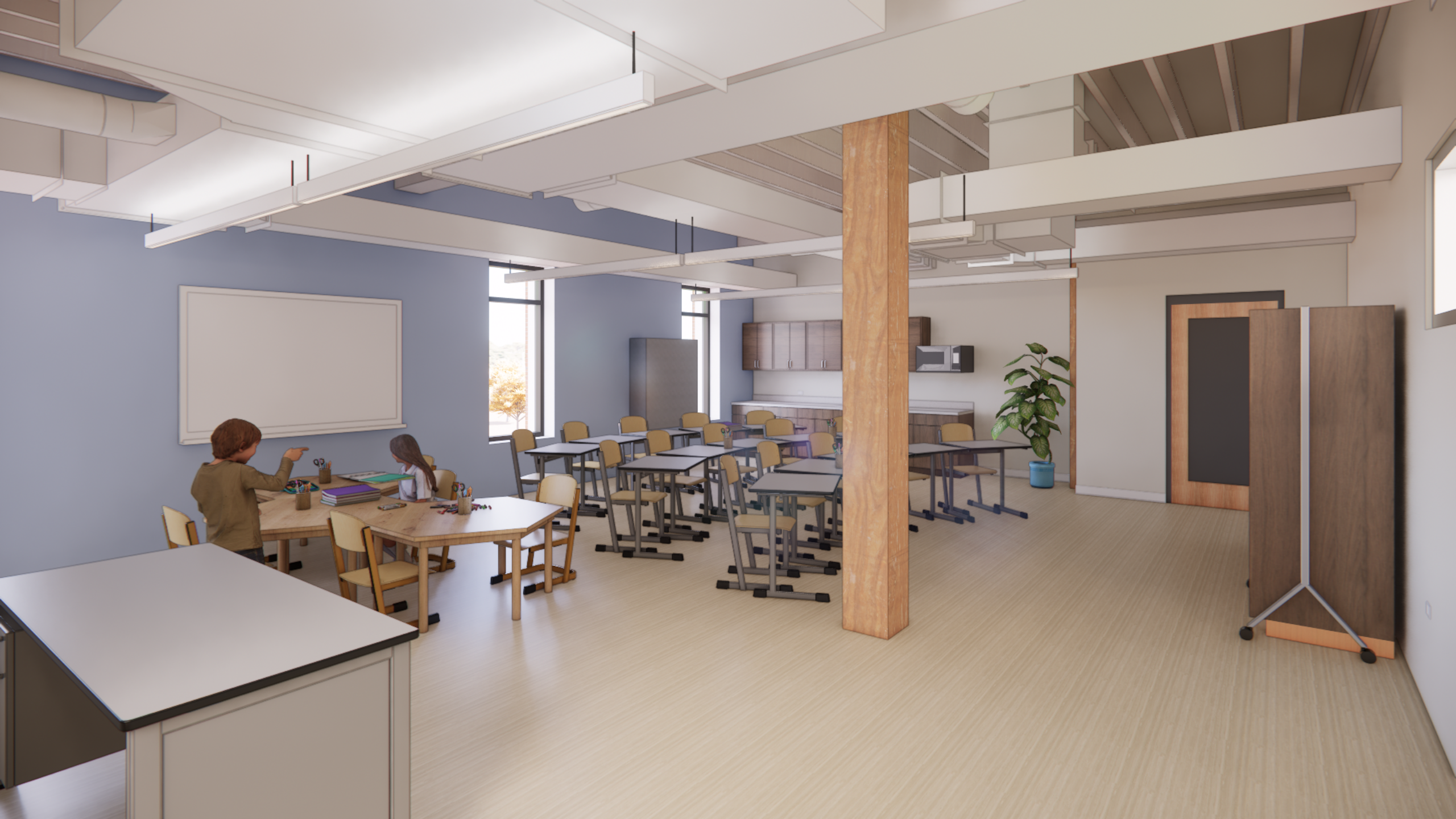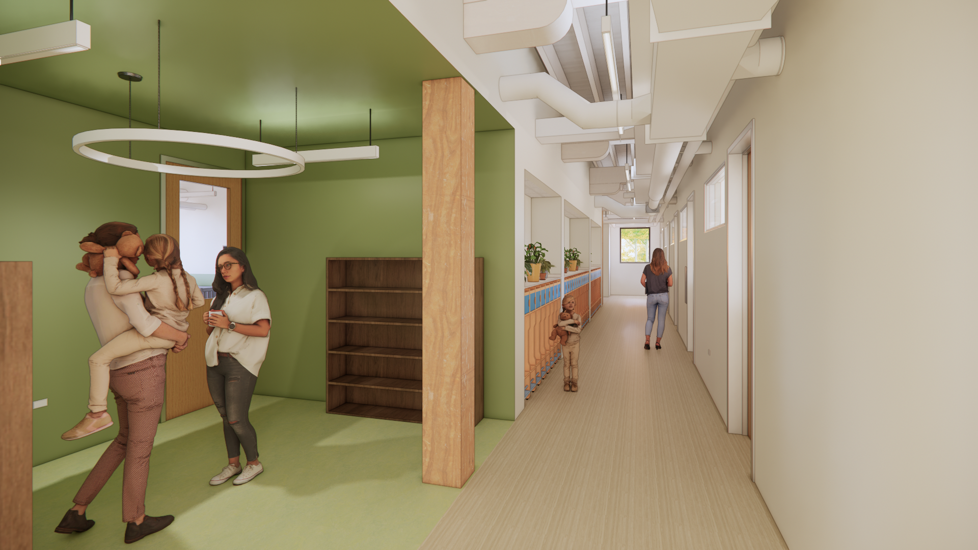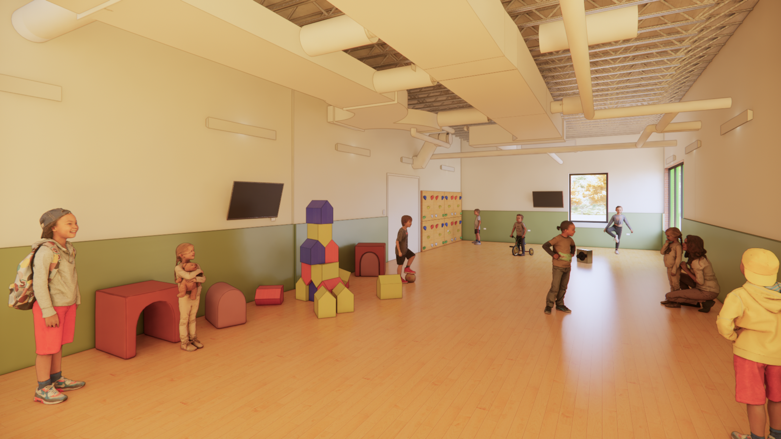 Currently under construction, a former factory building in Des Plaines, IL is the future site of an elementary school and child care facility. The site is perfect for exploratory learning due to its wooded landscape and direct proximity to a river.