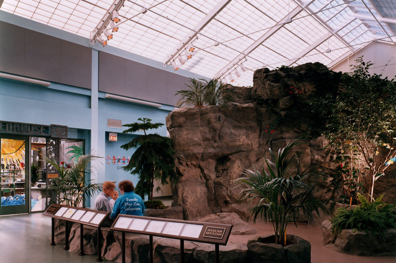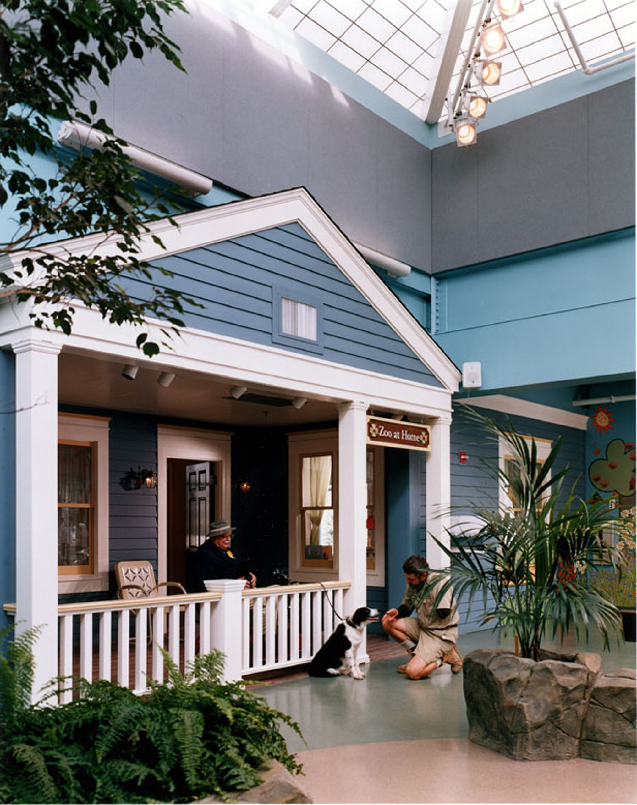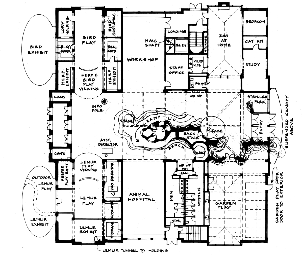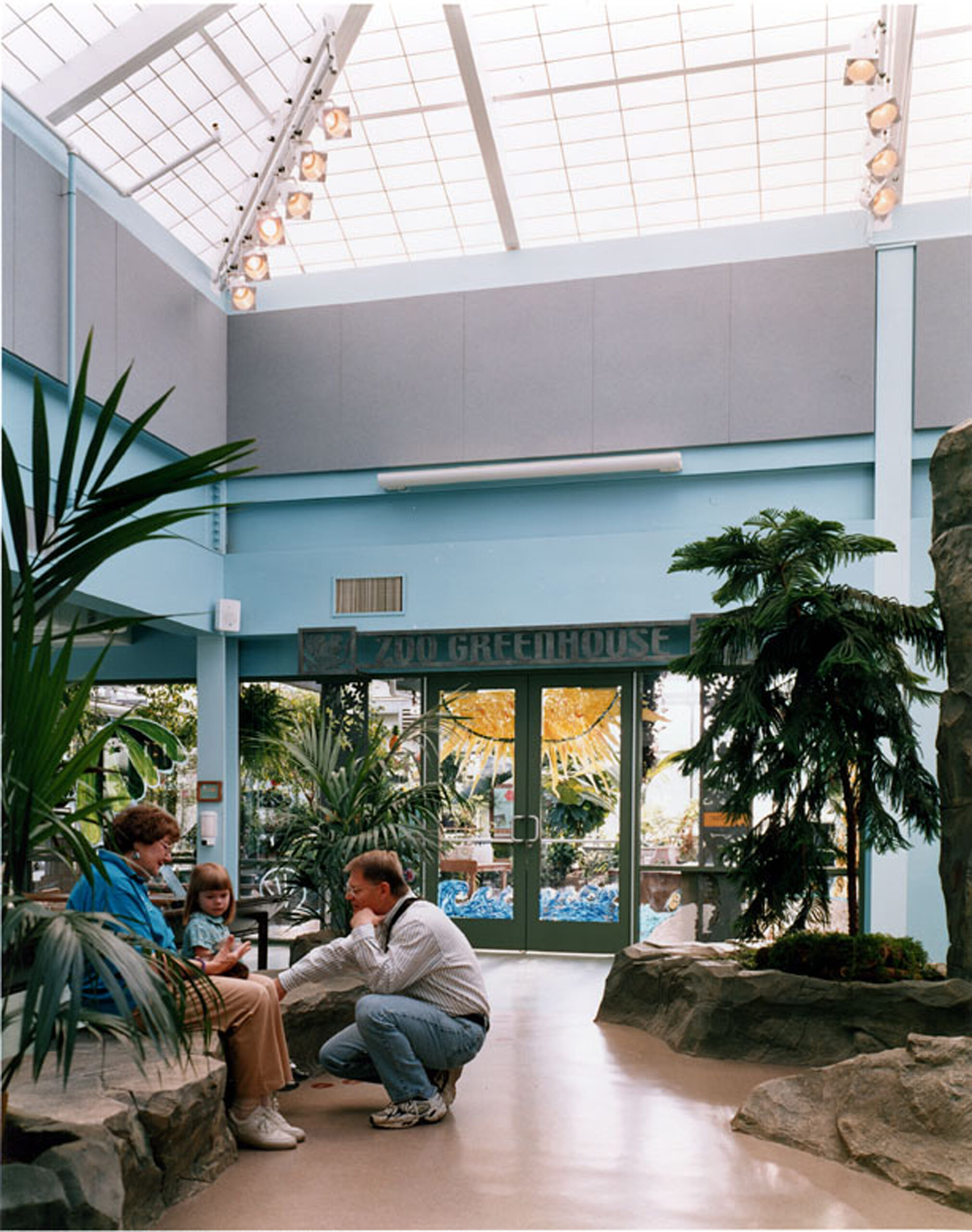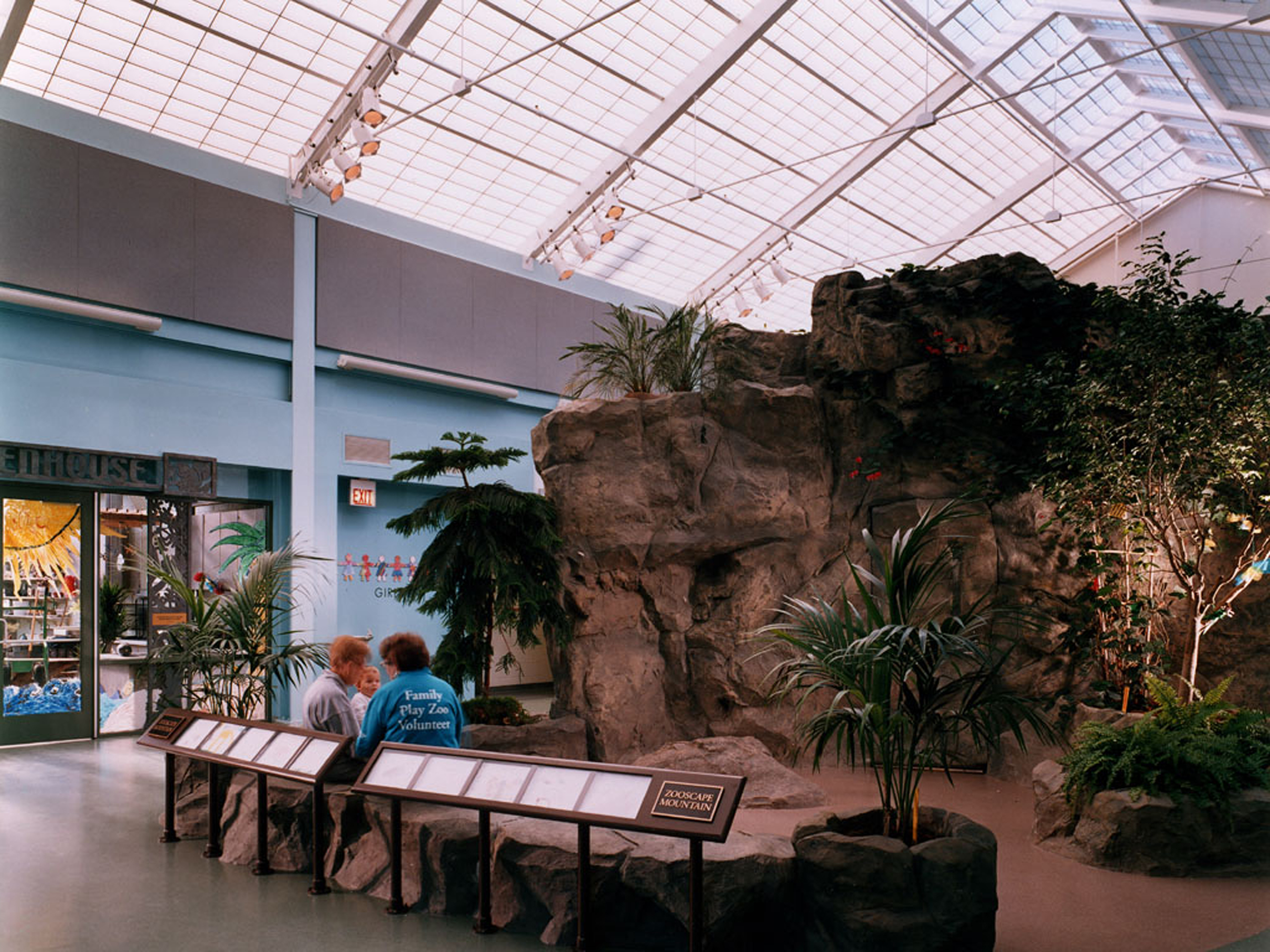 The spaces include areas where children can feed and role play with ring-tailed lemurs and lories, including dressing up as their counterparts. A greenhouse area affords an area where children can plant seeds, observe butterflies, help make soil mixes, and create flower art. An animal hospital area allows children to care for pretend zoo creatures, bandaging injuries, and viewing radiographs.