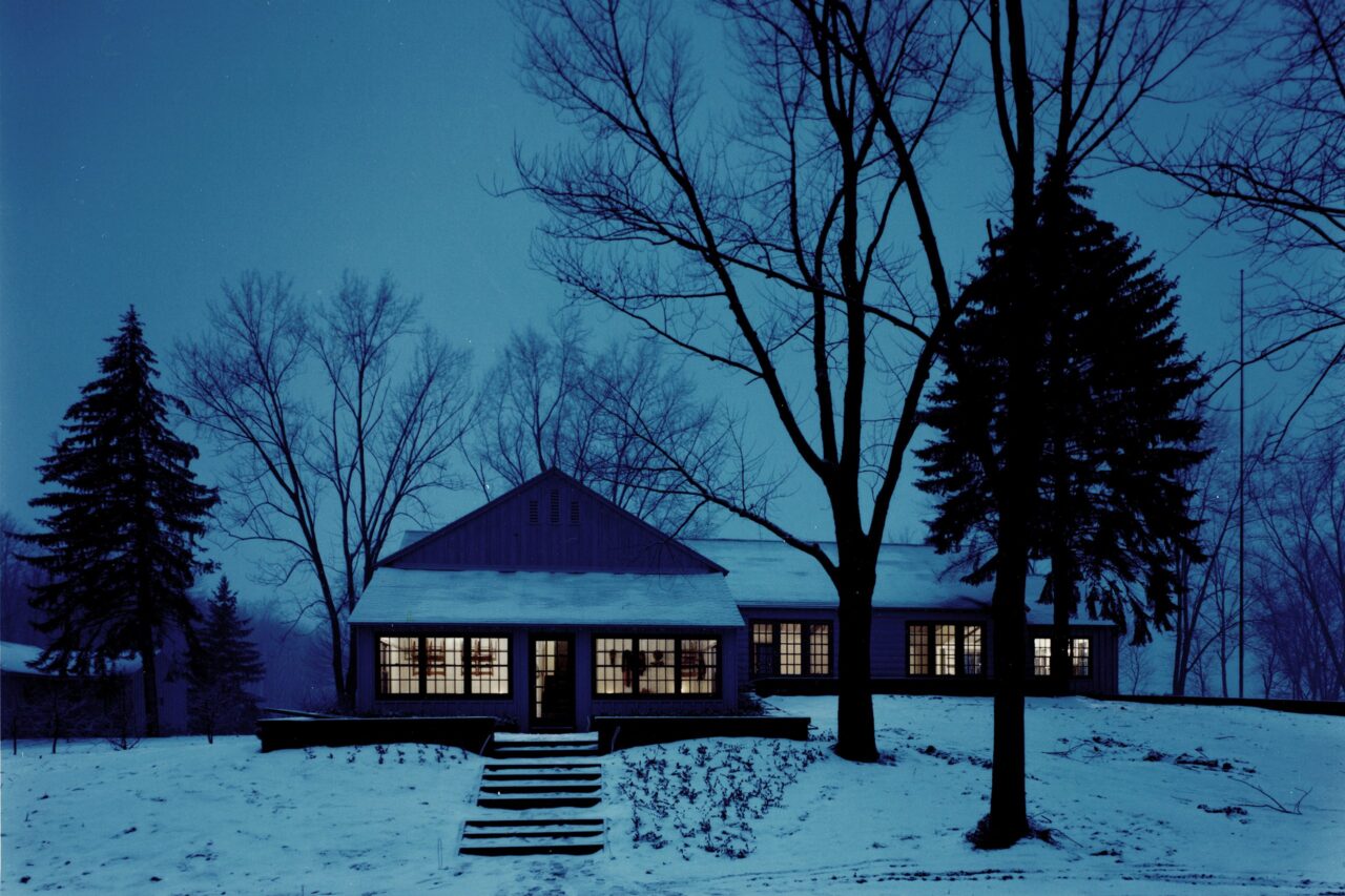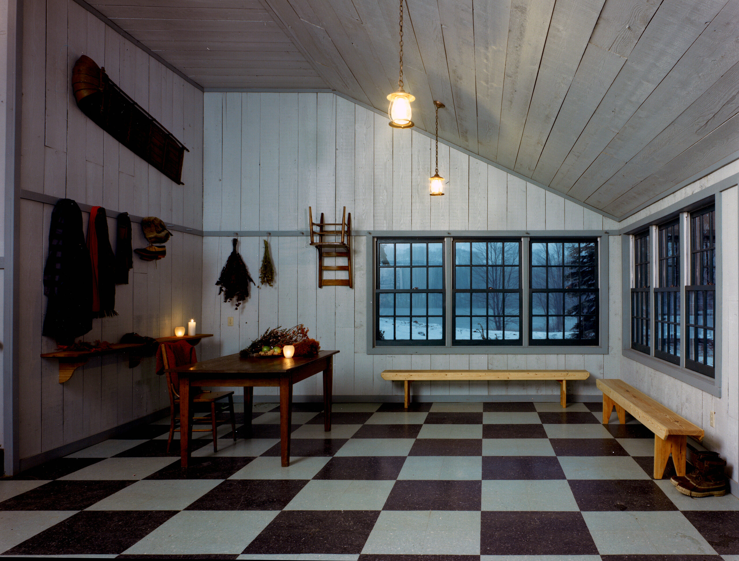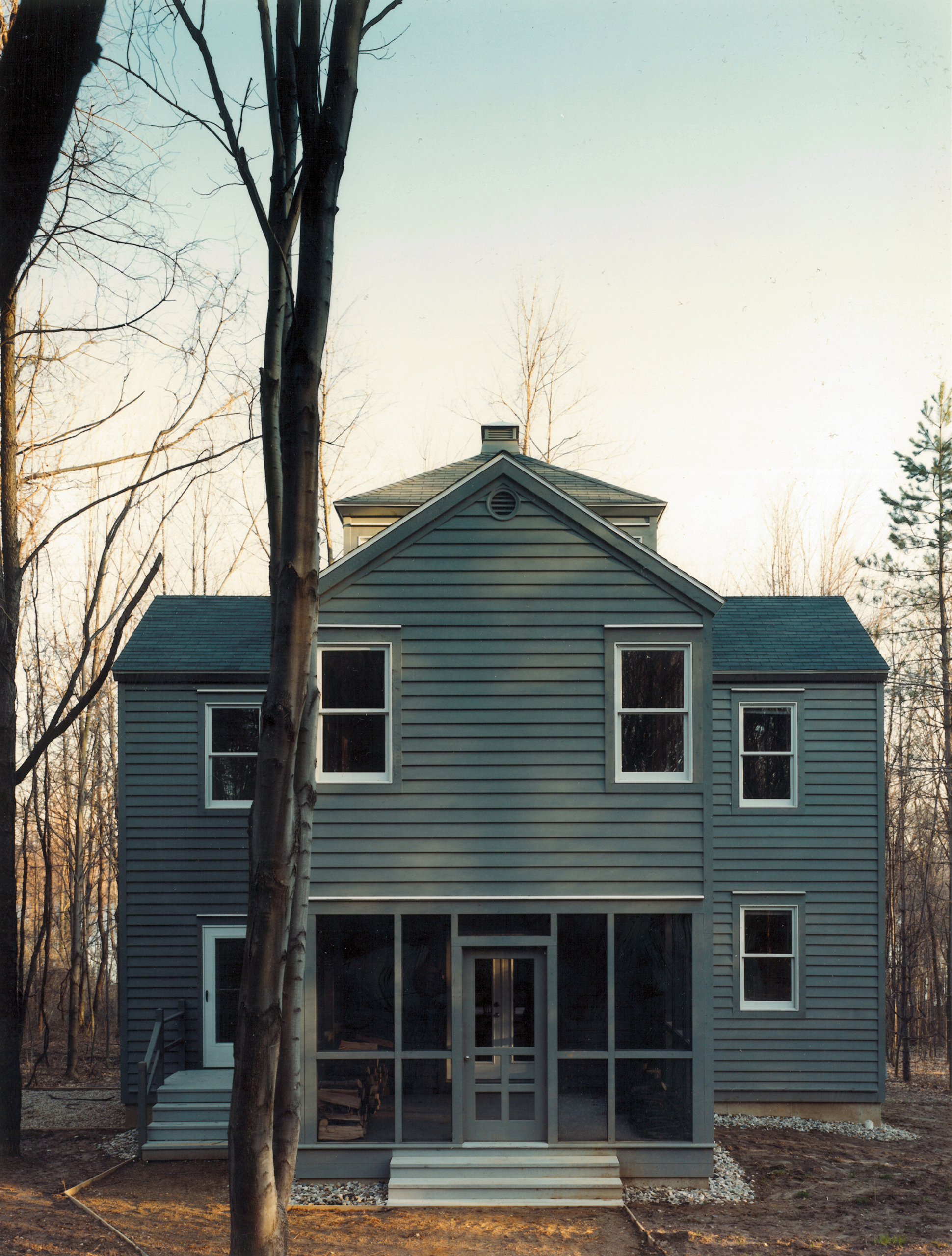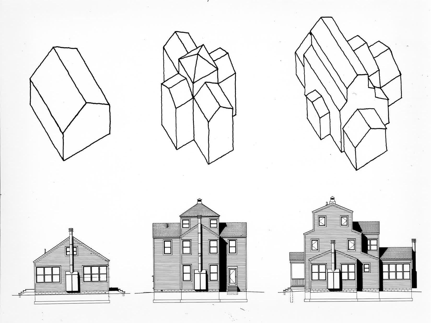 Simple rural and vernacular typologies were studied and reinterpreted for the three prototypical houses: the one-room schoolhouse, the cruciform house, and the telescoping house.