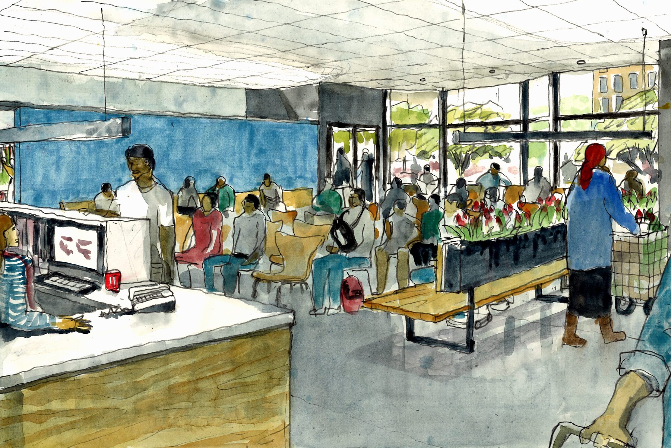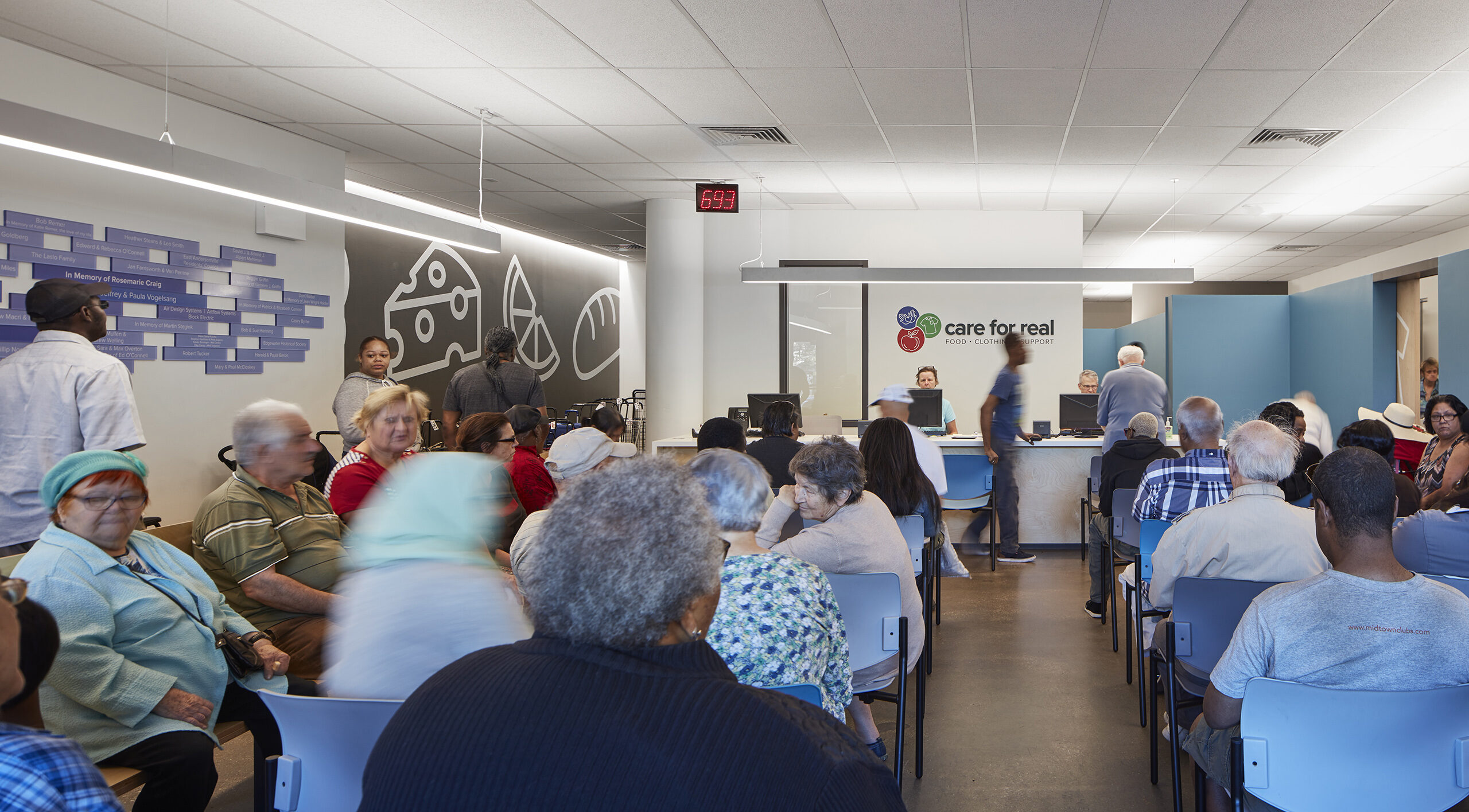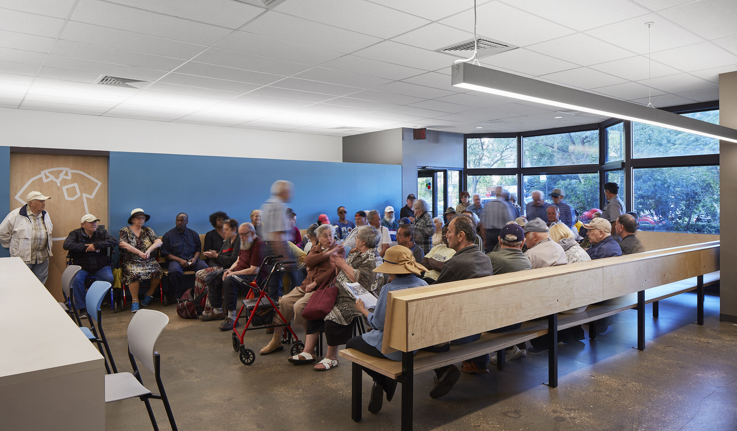 Clients are now greeted on entry by a volunteer, issued a number and are directed to a waiting area. An arrangement of loose chairs in the center and birch plywood benches around the perimeter increase seating capacity from 40 to 60. Additionally, clients now have the option to store shopping carts in a dedicated ‘parking area,’ and thereby open up the circulation in the waiting area.