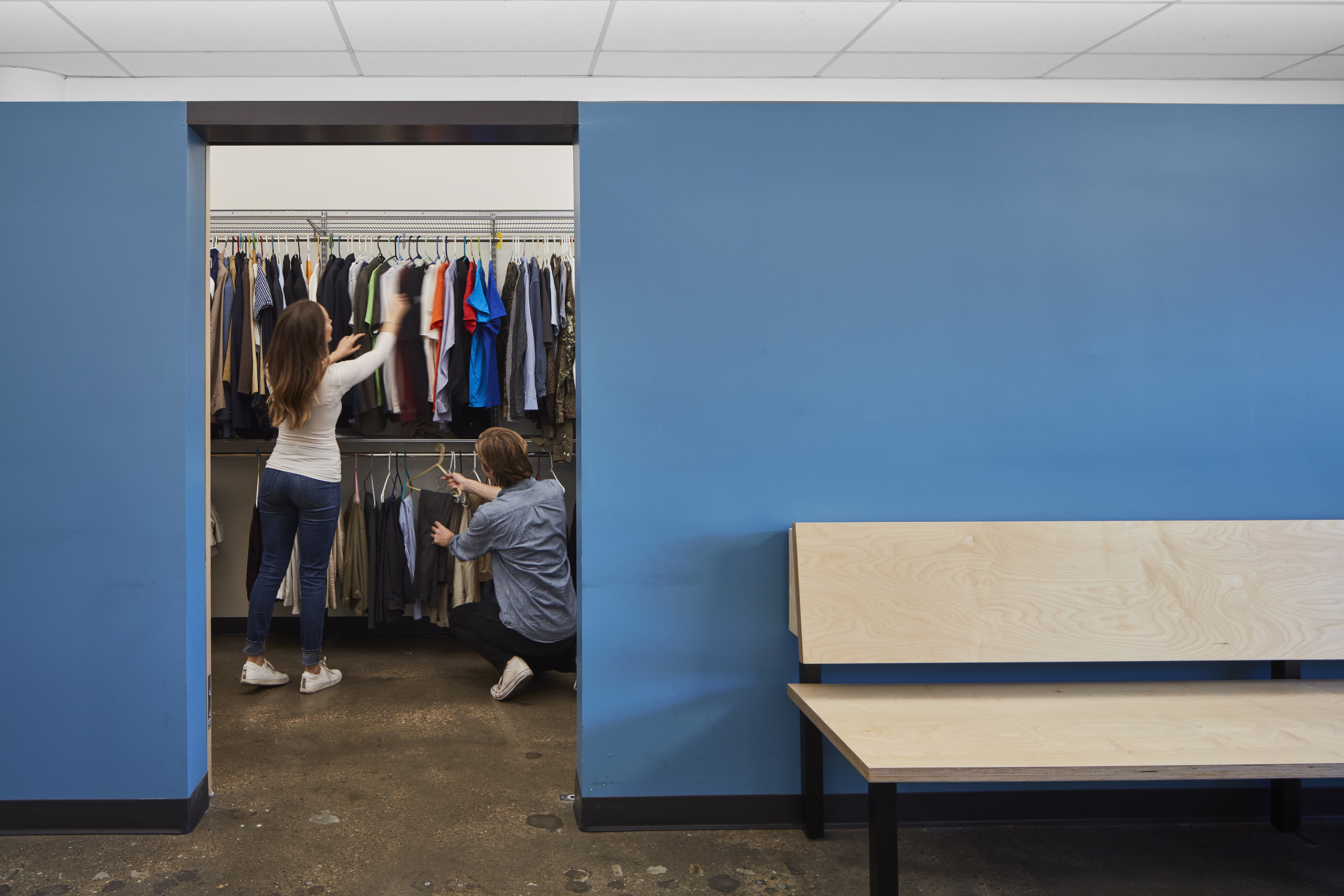 The enlarged clothing closet is outfitted with hanging and shelves on both sides of a center aisle, permitting efficiencies in display and retrieval of goods. This improved organization ensures clients have a positive and dignified shopping experience.