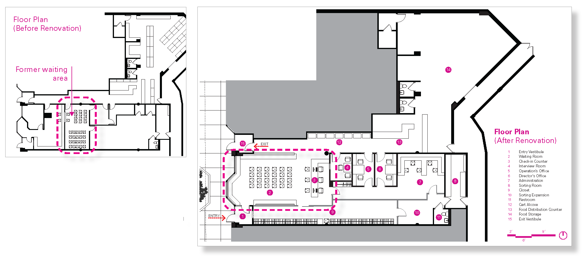 A new receptionist desk anchors the space and welcomes visitors immediately on entry. Administrative offices are centralized, around which clients move through the existing food distribution to the north and the new clothing distribution space to the south.