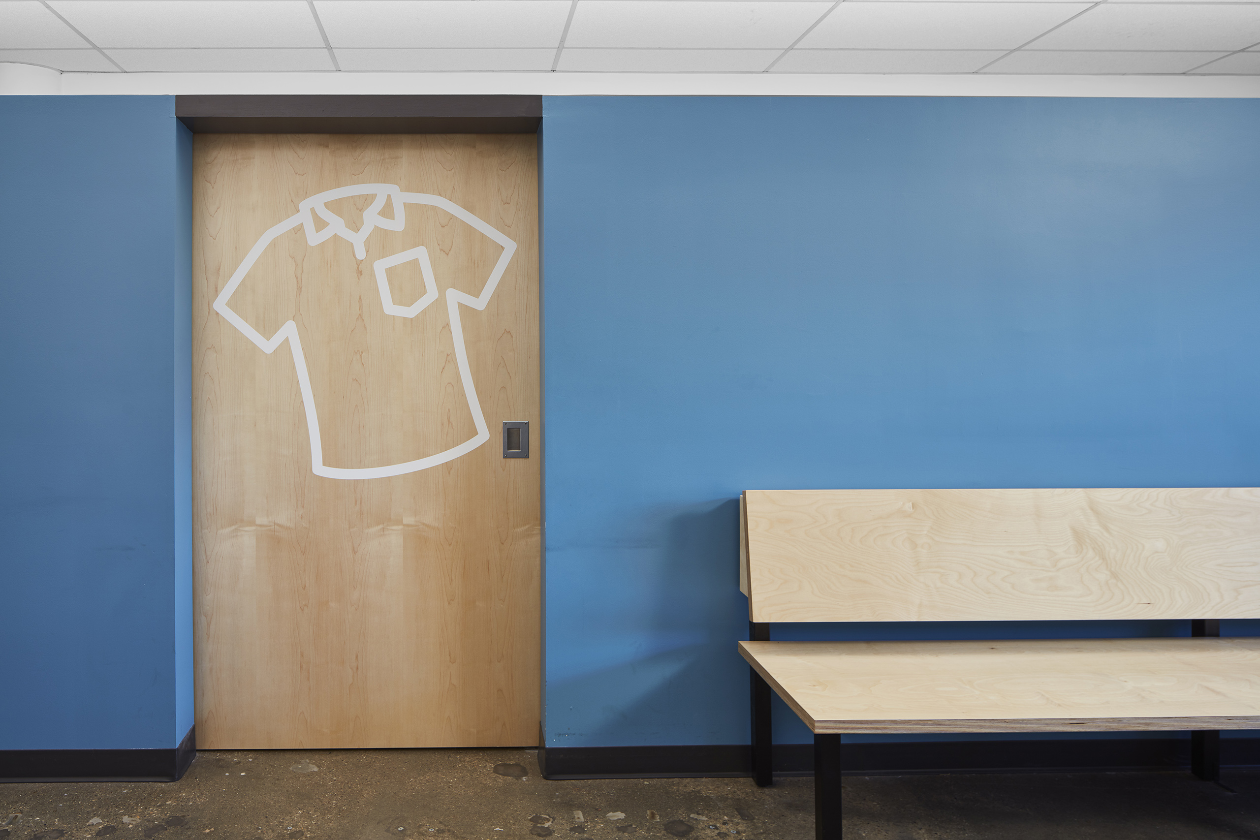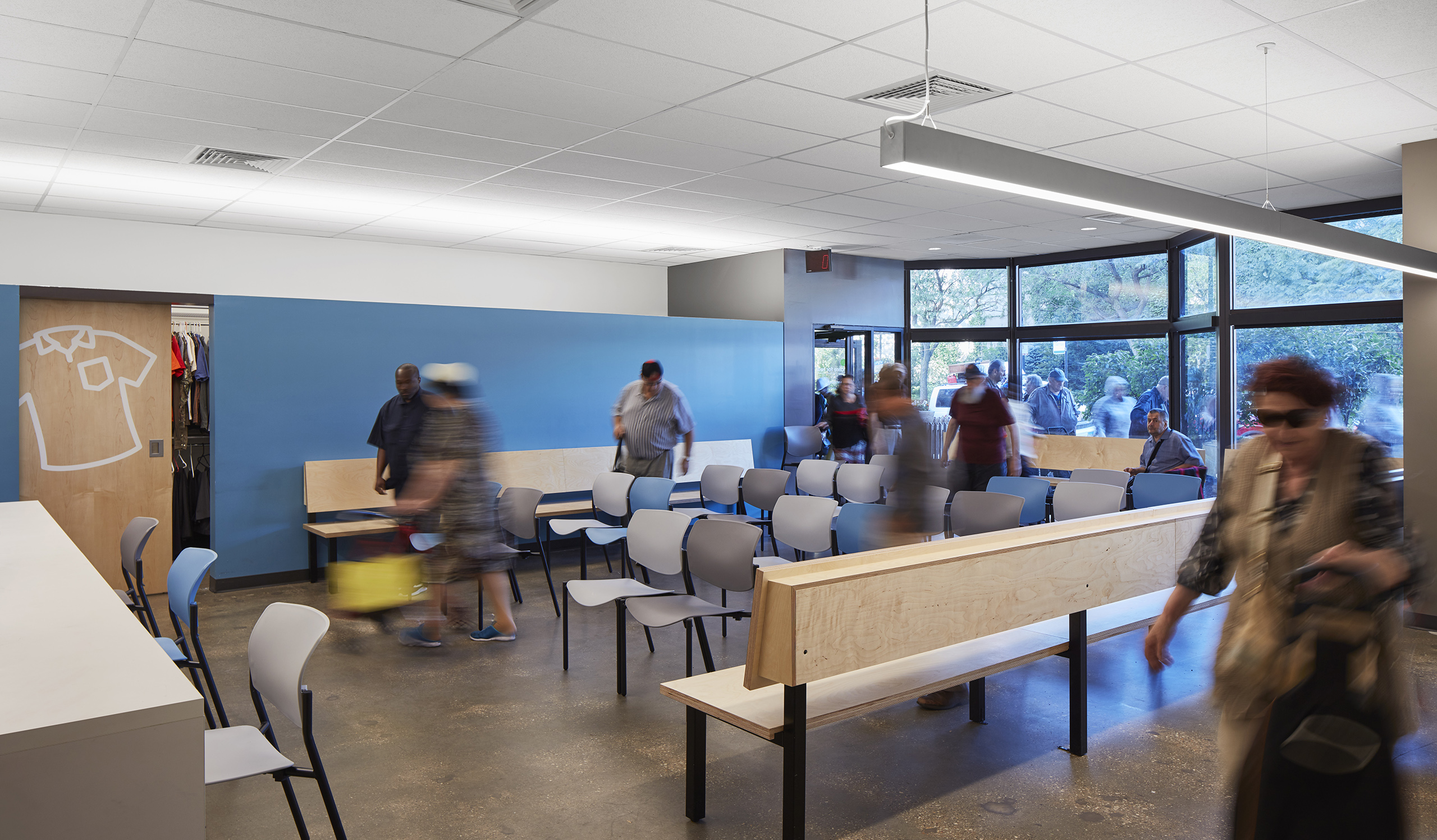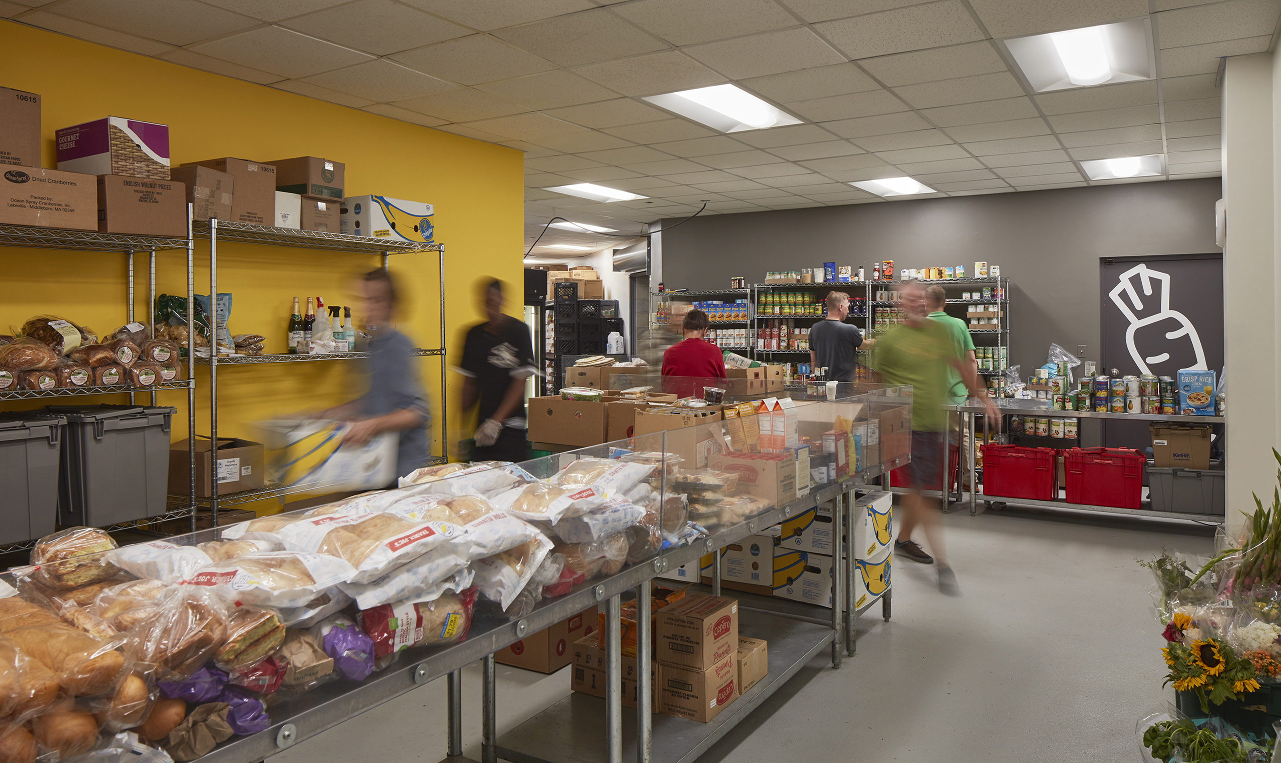Clients are now greeted on entry by a volunteer, issued a number and are directed to a waiting area. An arrangement of loose chairs in the center and birch plywood benches around the perimeter increase seating capacity from 40 to 60. Additionally, clients now have the option to store shopping carts in a dedicated ‘parking area,’ and thereby open up the circulation in the waiting area.