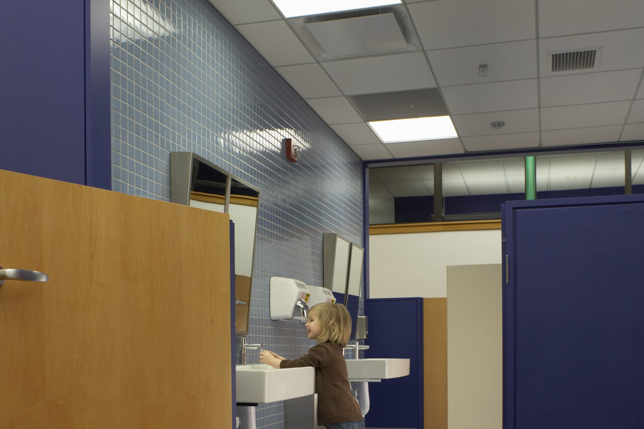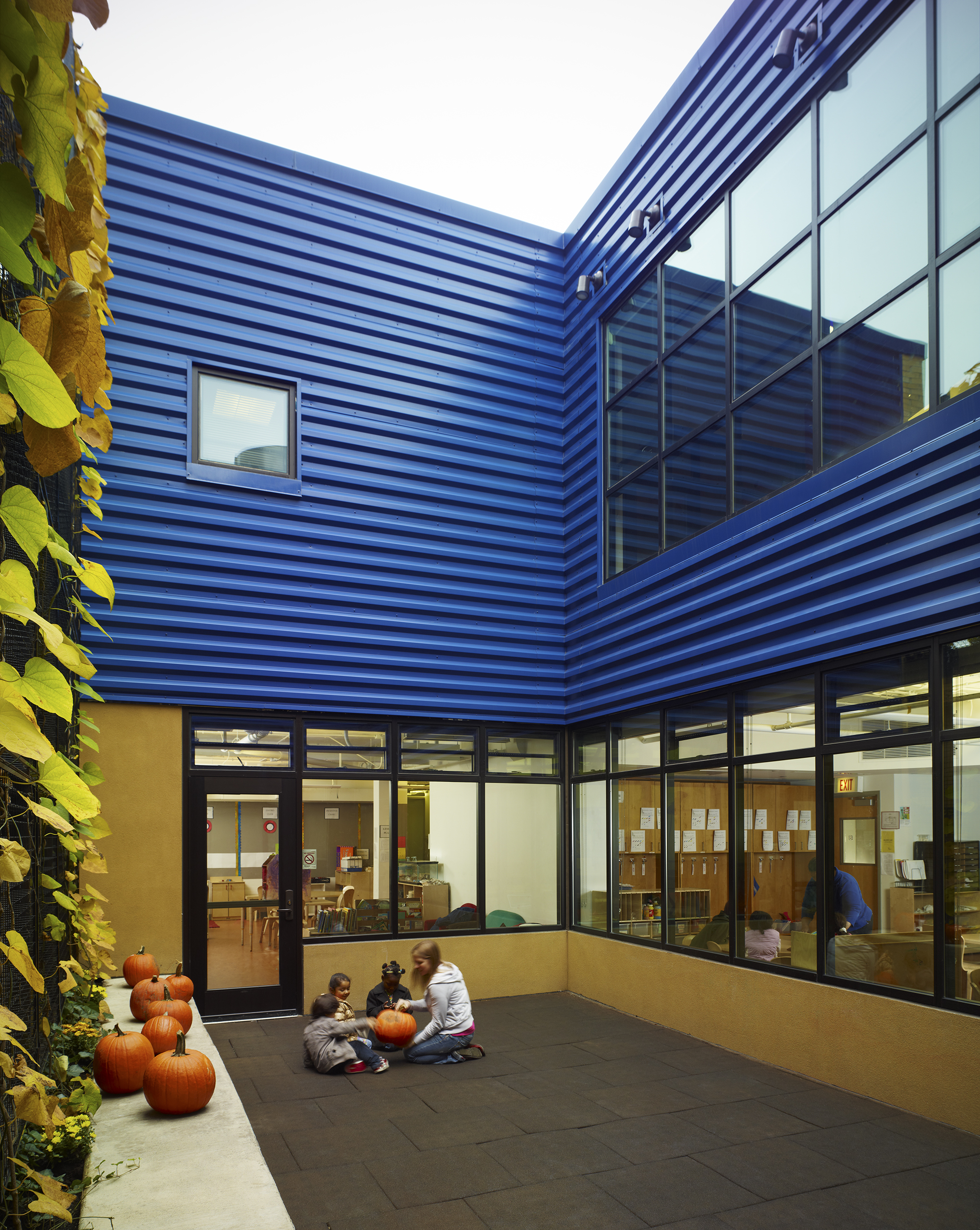 A portion of the existing building was demolished in order to create a new courtyard which provides daylight, views, and outdoor playspace for the lower level classrooms and offices. New landscaped playgrounds provide an opportunity for native, drought resistant planting and permeable paving. Both concrete pavers and permeable rubber play tiles were placed over a storm water-absorbing gravel base. Over sixty percent of the roof is planted.