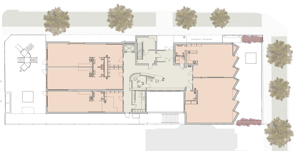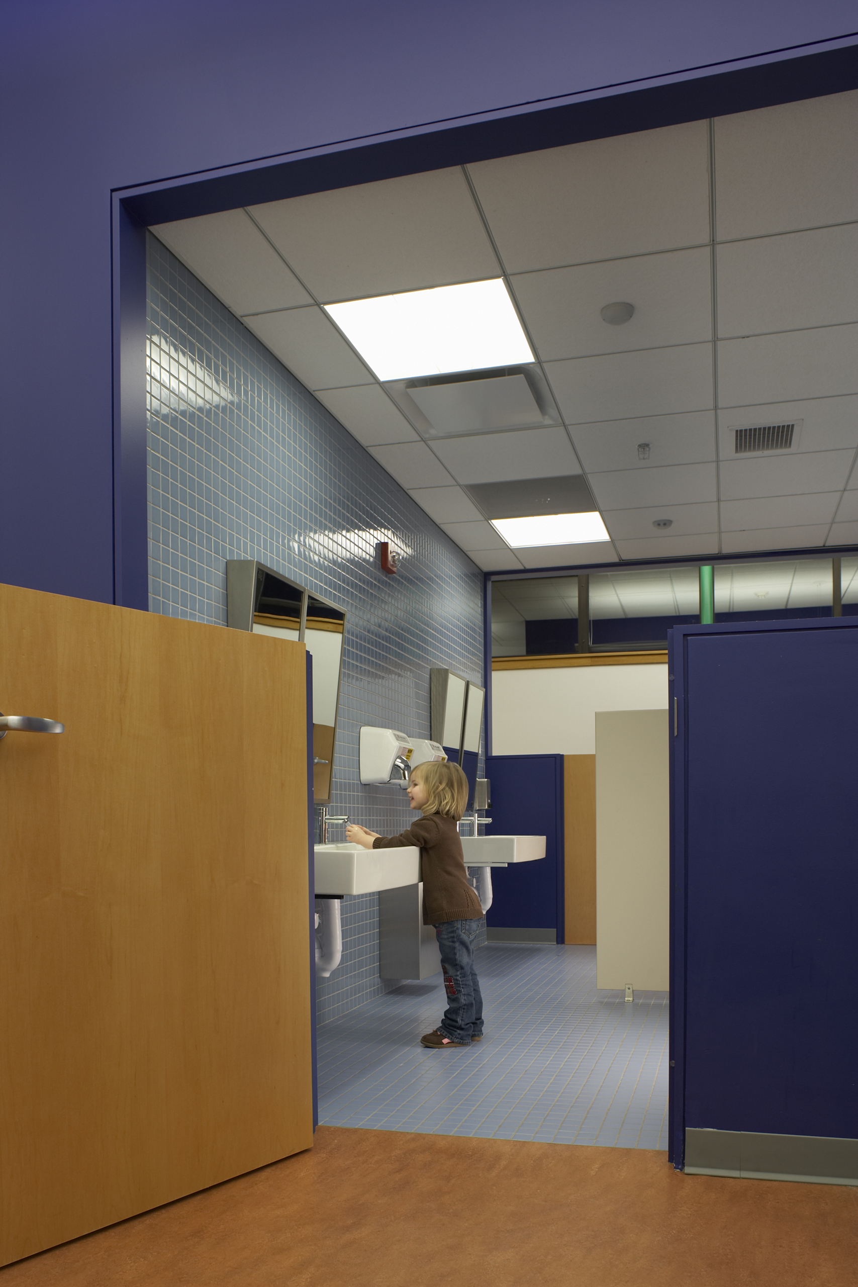 A portion of the existing building was demolished in order to create a new courtyard which provides daylight, views, and outdoor playspace for the lower level classrooms and offices. New landscaped playgrounds provide an opportunity for native, drought resistant planting and permeable paving. Both concrete pavers and permeable rubber play tiles were placed over a storm water-absorbing gravel base. Over sixty percent of the roof is planted.