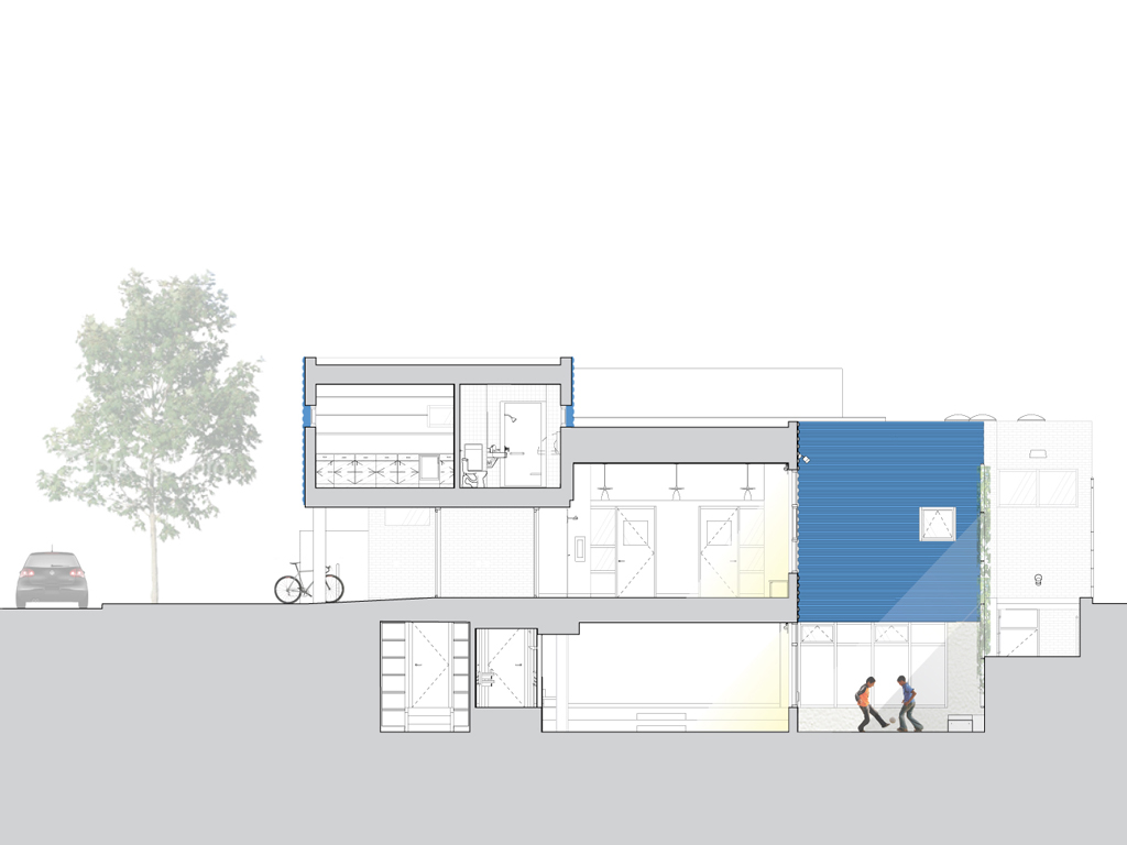 New bright blue metal cladding surfaces the interventions at the courtyard and clads the main entry volume.