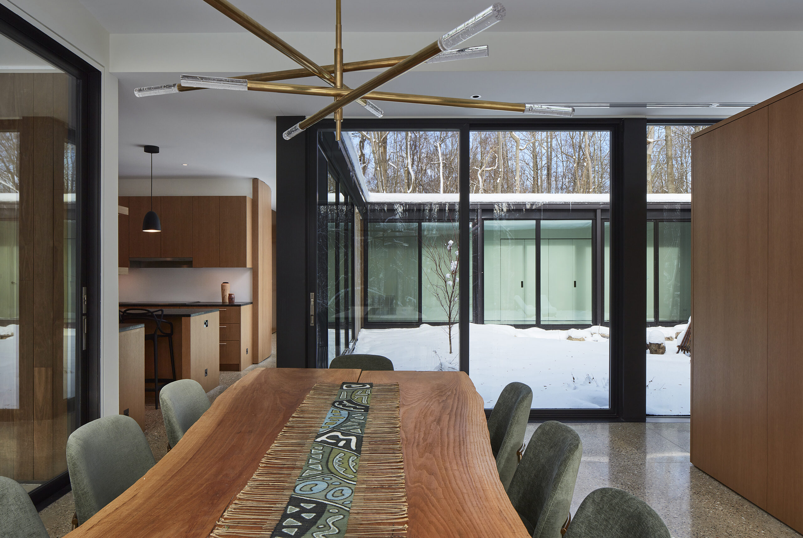 The main living spaces feature floor-to-ceiling glass walls, providing unobstructed views to either the Courtyard or the ravine. Two screened porches extend the living area to the outside in good weather: one adjacent to the kitchen for dining, and the other a quiet sitting space off the living room. These porches capture breezes during warmer months, promote cross ventilation and reinforce the indoor-outdoor living experience.