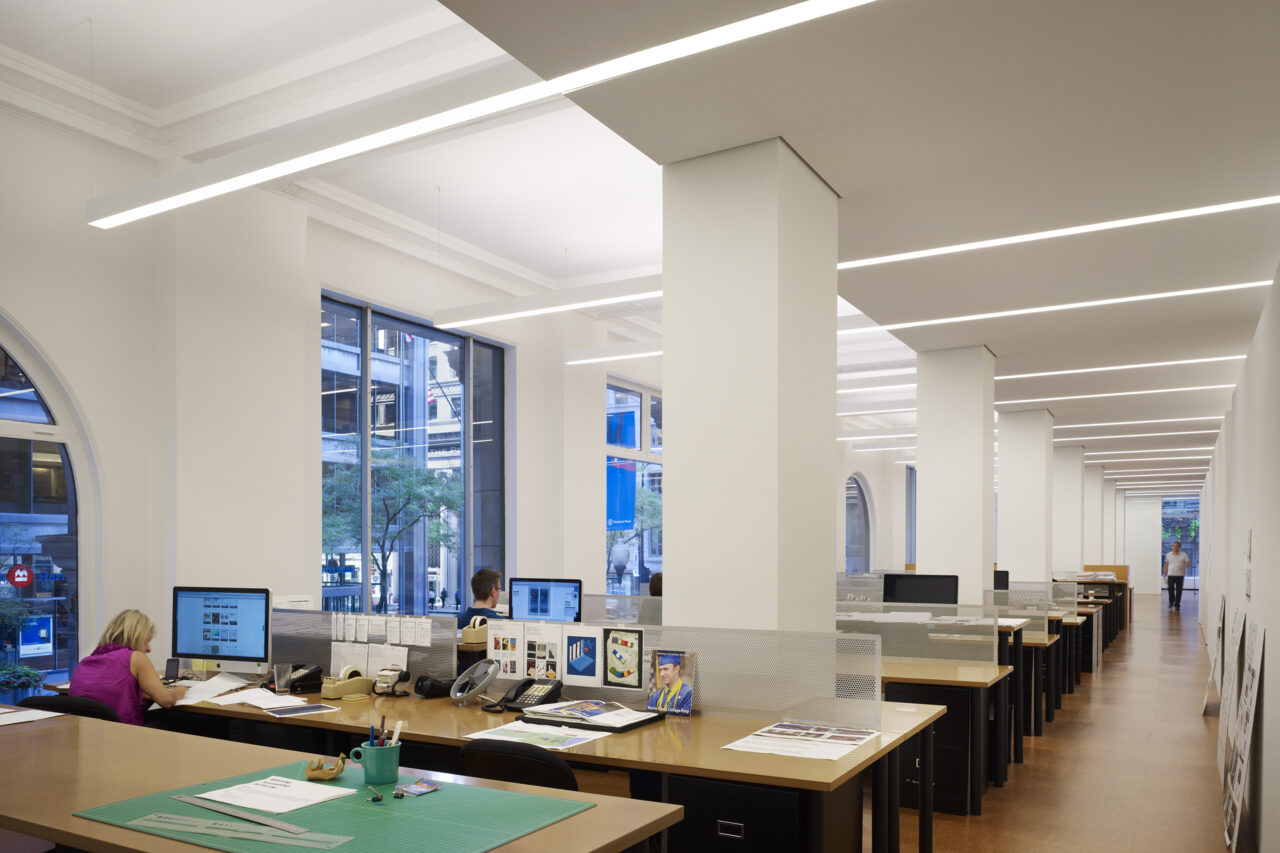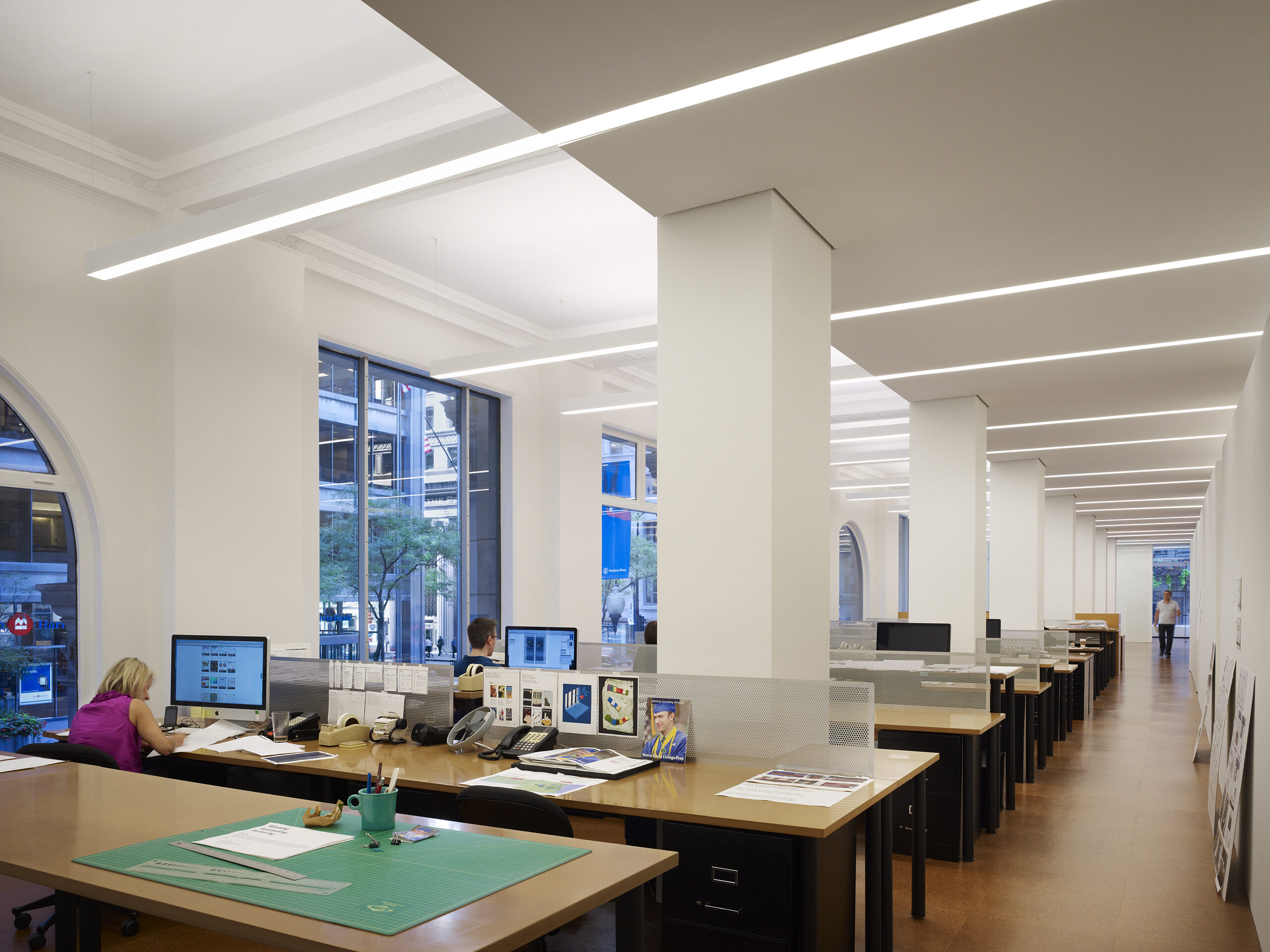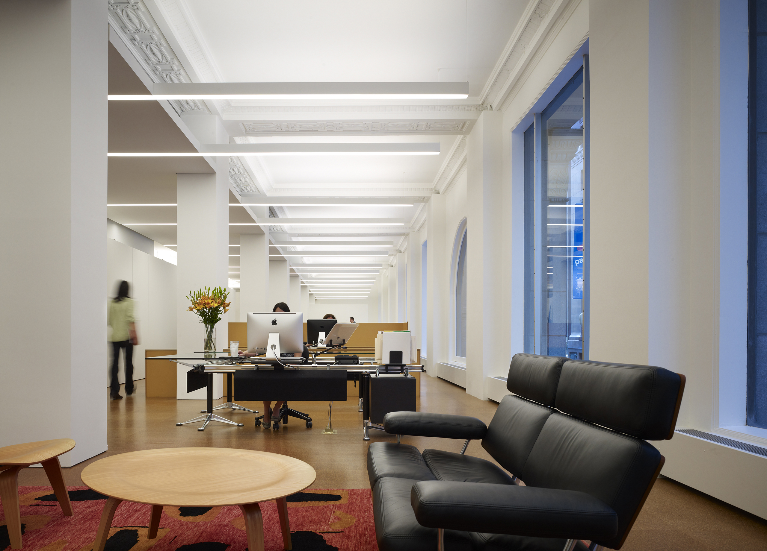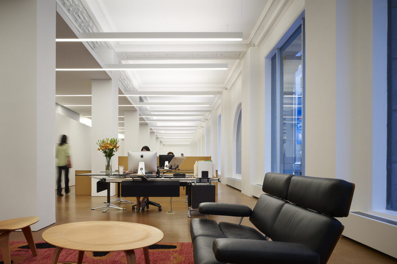 Bright white walls and ceiling act as light reflecting surfaces to illuminate true color of graphic work and presentations. The 4200 sf space was designed to support a collaborative open studio environment, conference spaces and office support space. Large windows, high ceilings and remaining plaster ornament from the original structure provide contrast for the newly constructed space defined by floating planes, lighting, and utilitarian elements.