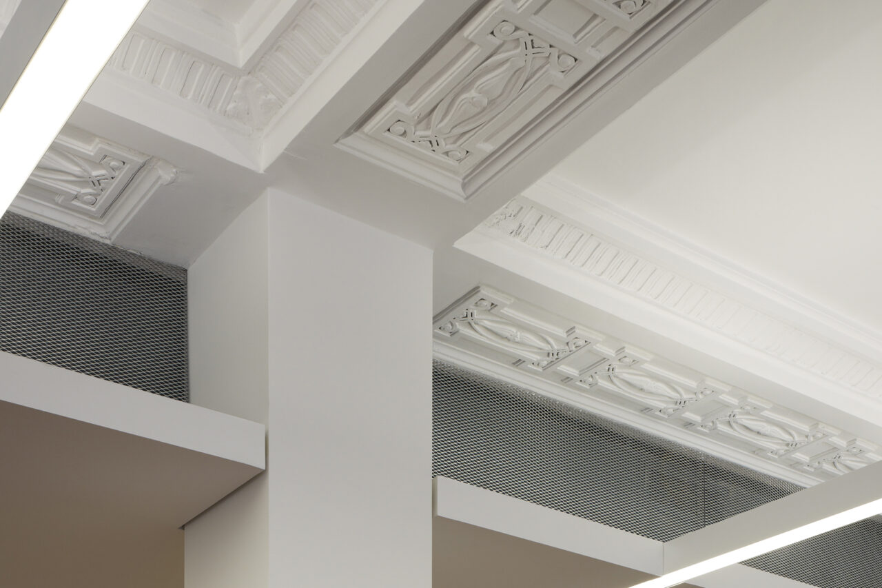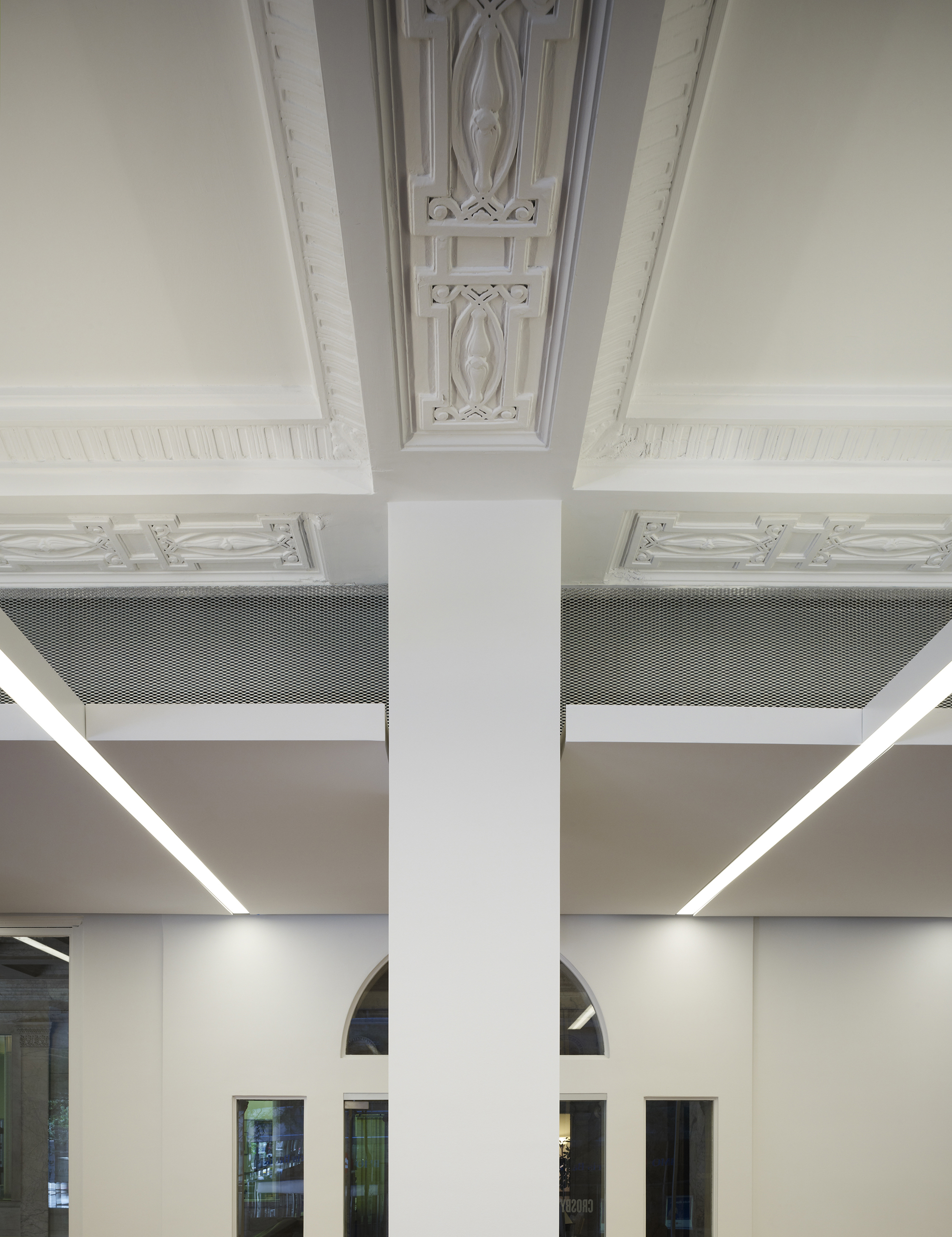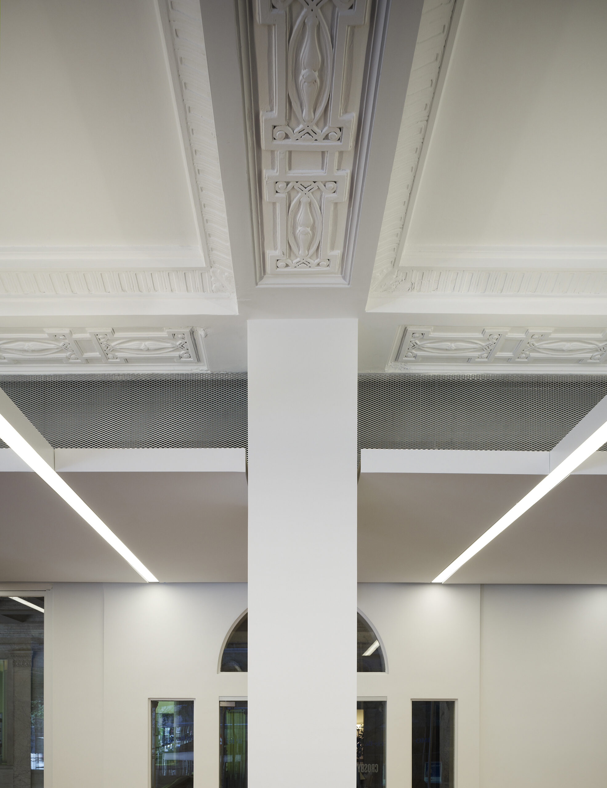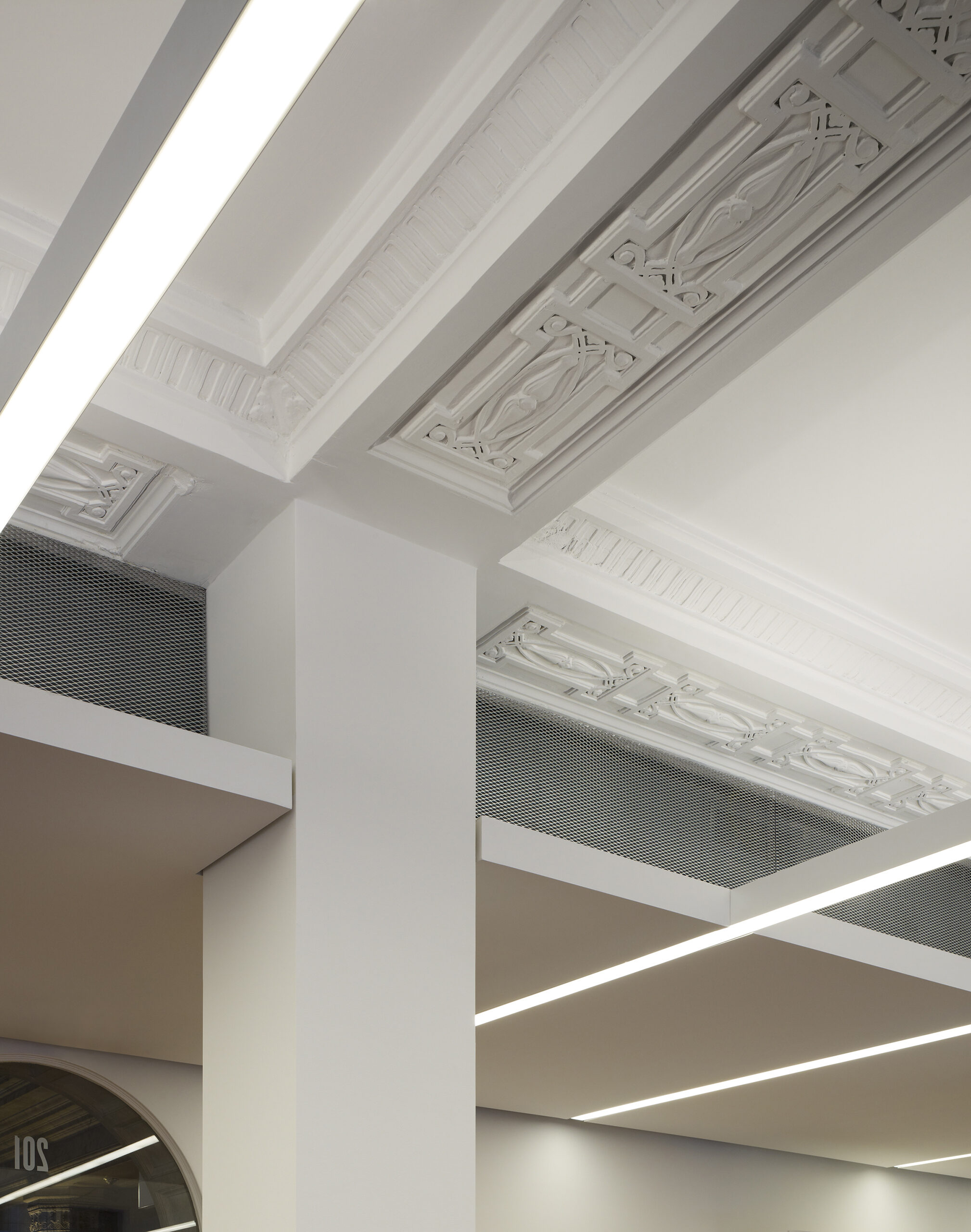 Bright white walls and ceiling act as light reflecting surfaces to illuminate true color of graphic work and presentations. The 4200 sf space was designed to support a collaborative open studio environment, conference spaces and office support space. Large windows, high ceilings and remaining plaster ornament from the original structure provide contrast for the newly constructed space defined by floating planes, lighting, and utilitarian elements.