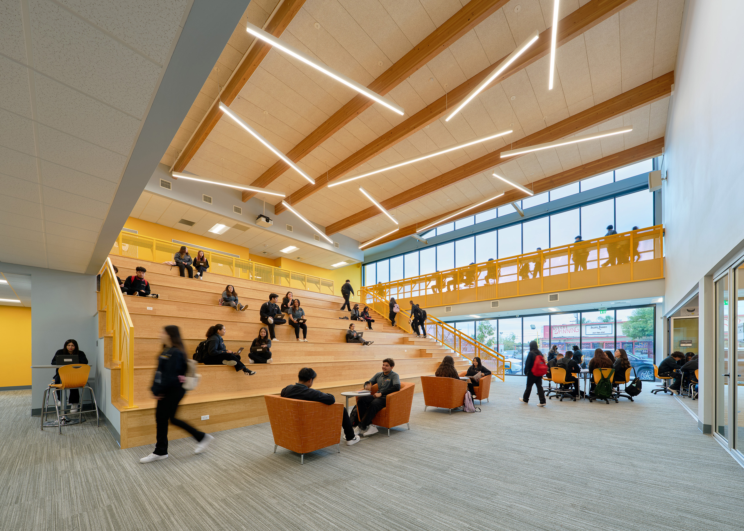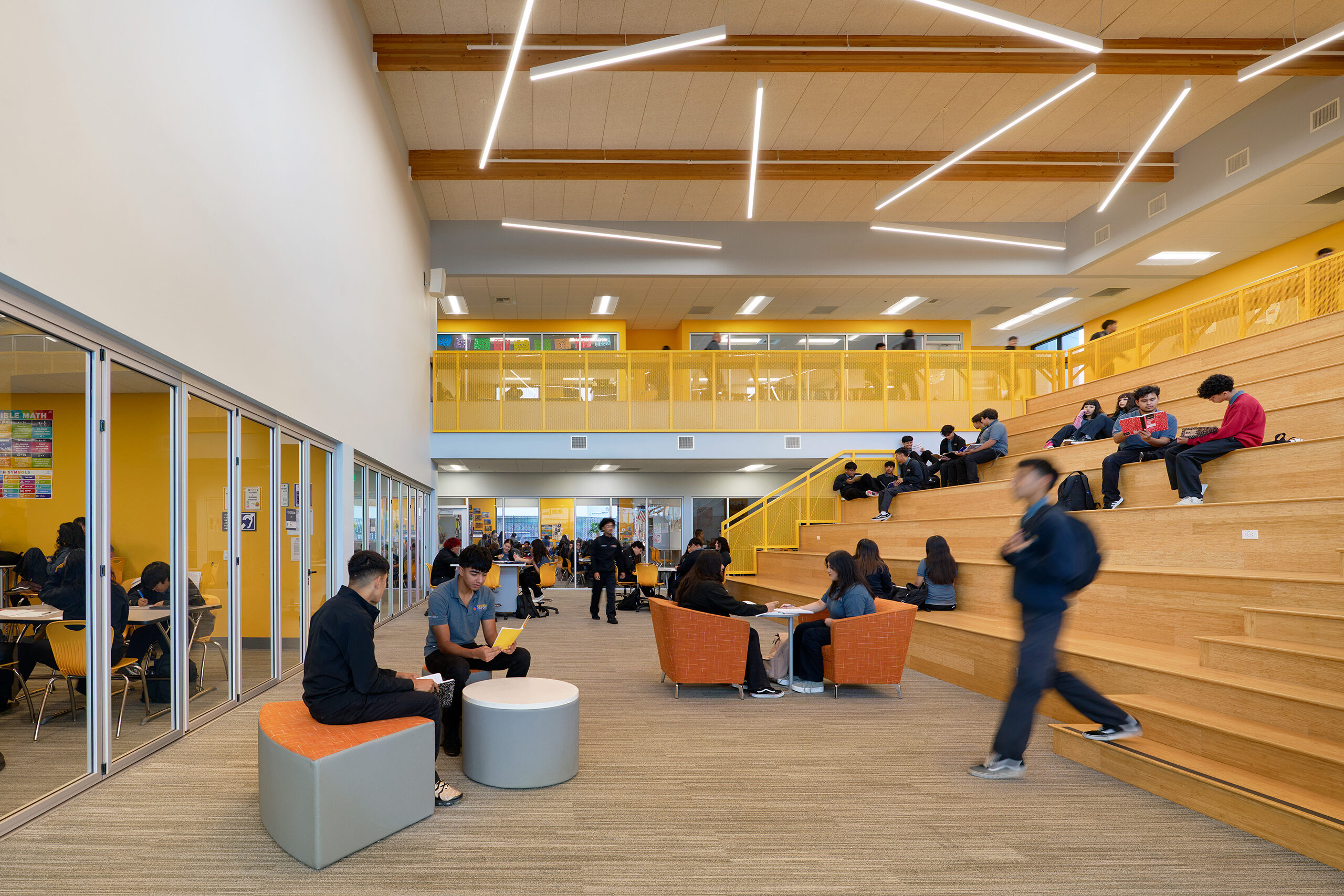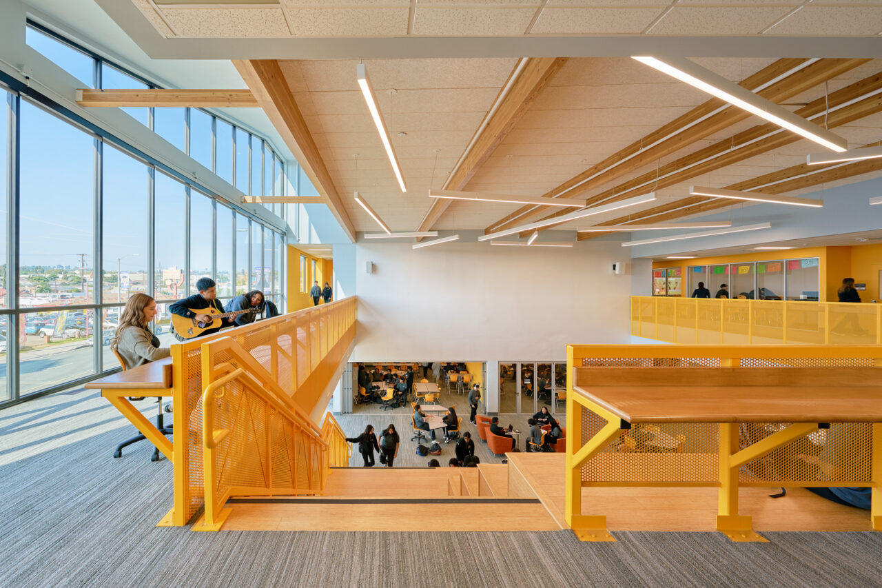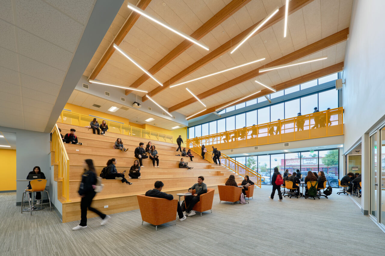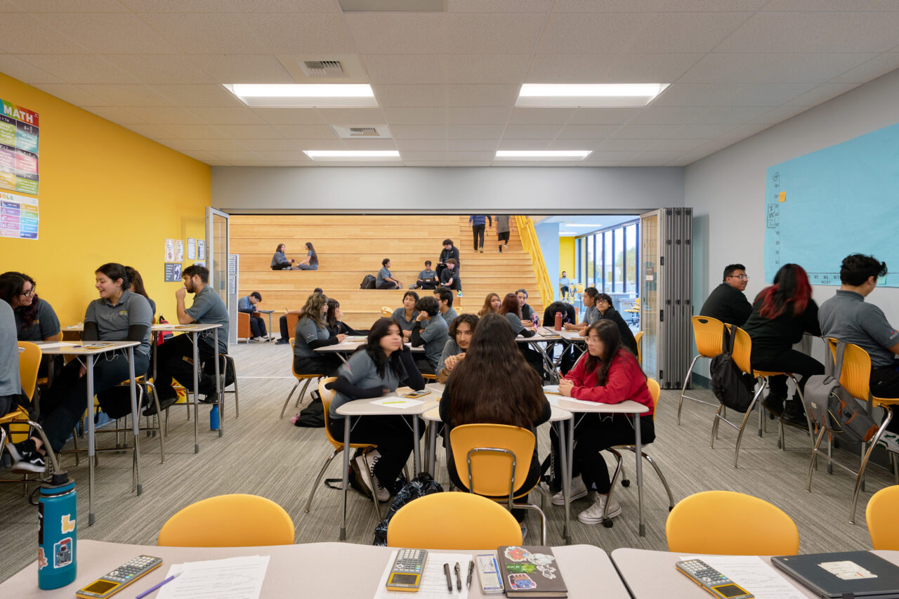 To support Ednovate’s learning model and curriculum, the schools feature “quad-pod” learning spaces, comprised of four classrooms or “pods” surrounding an open studio, for each grade level. The studio can be recruited on an impromptu basis by students electing to work independently or in small groups. It also serves as a daily meeting space for an advisory and can combine with one of the pods to accommodate a stand-up meeting for the whole grade. For the centerpiece of the schools, named the “townhall”, WKA designed a double-height senior studio as a place for the seniors to present their projects.