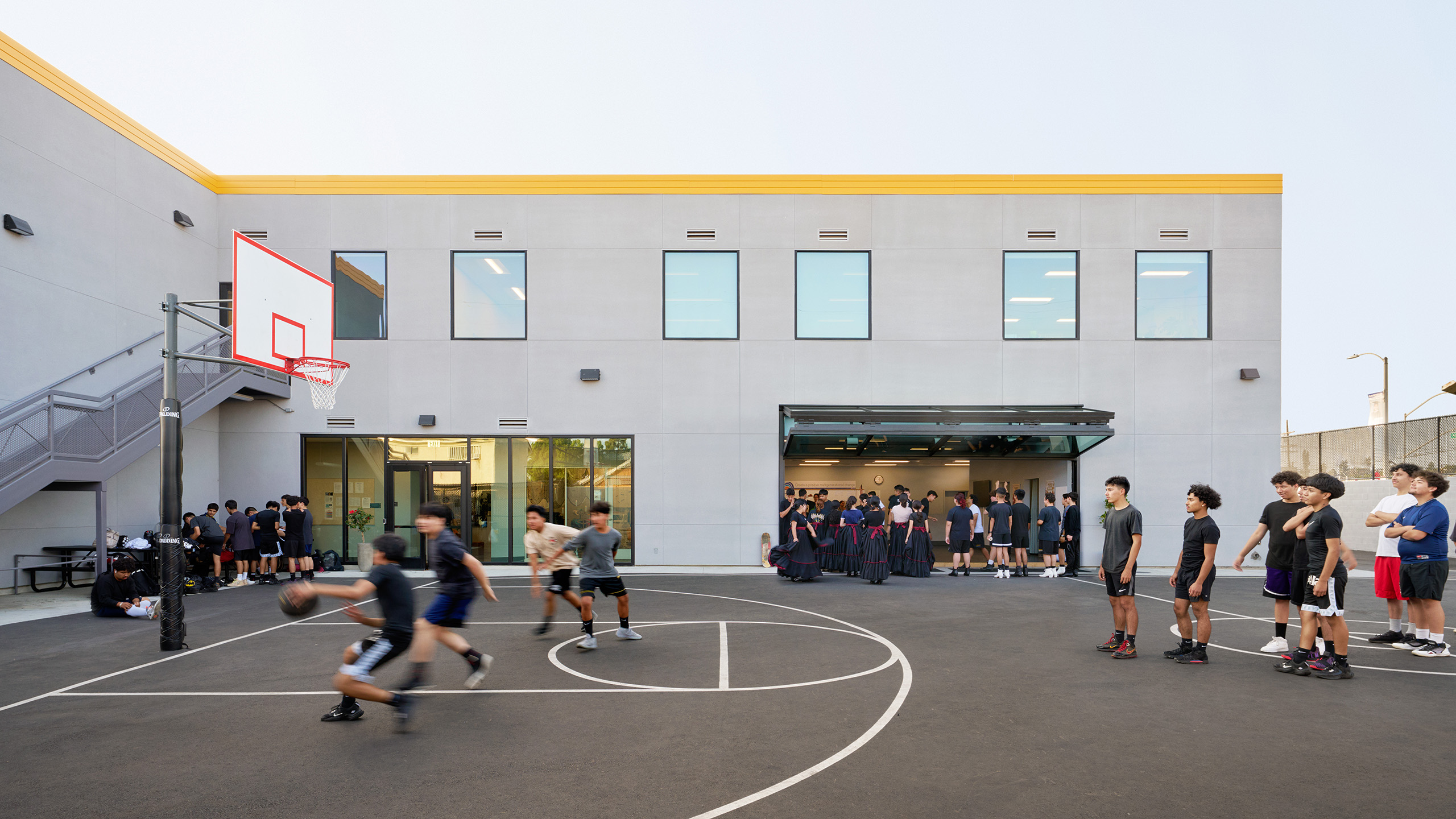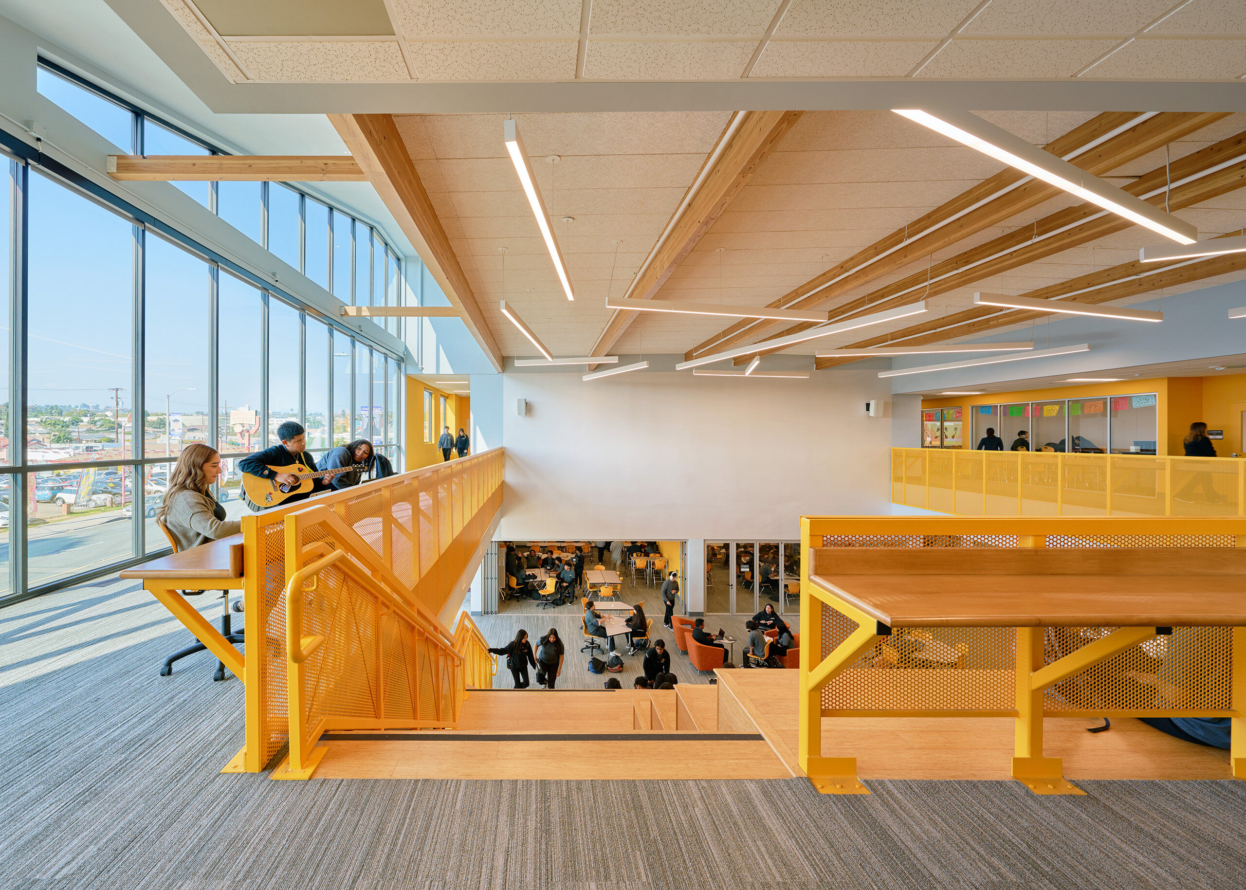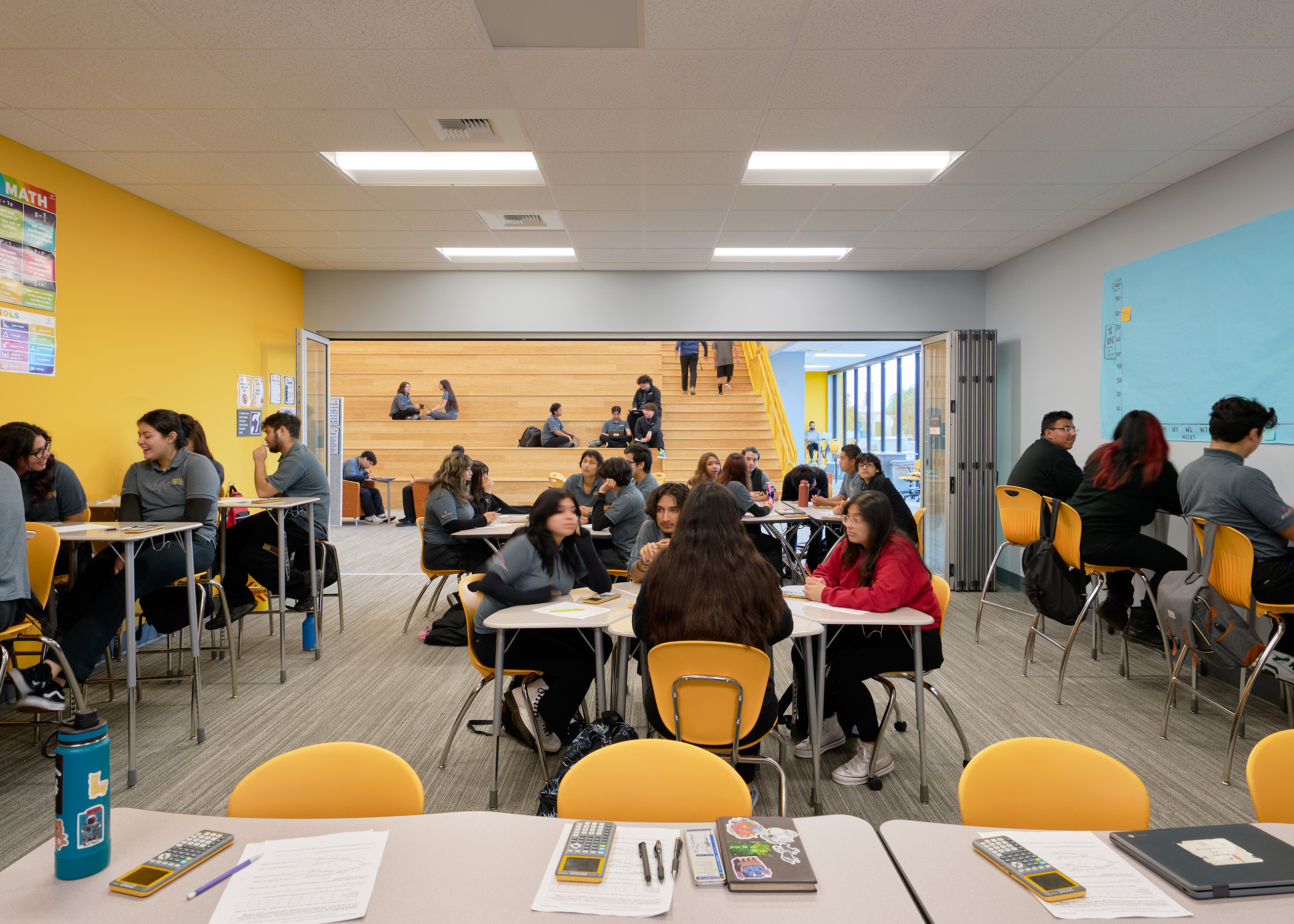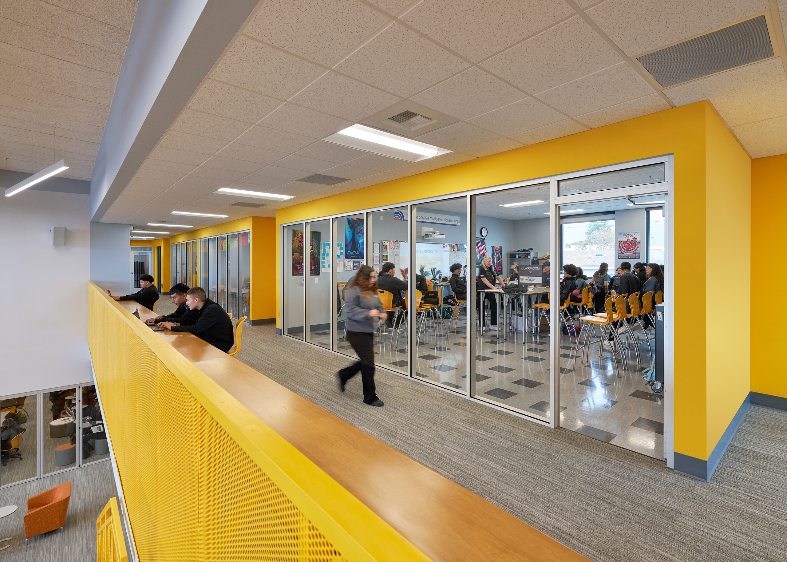 To support Ednovate’s learning model and curriculum, the schools feature “quad-pod” learning spaces, comprised of four classrooms or “pods” surrounding an open studio, for each grade level. The studio can be recruited on an impromptu basis by students electing to work independently or in small groups. It also serves as a daily meeting space for an advisory and can combine with one of the pods to accommodate a stand-up meeting for the whole grade. For the centerpiece of the schools, named the “townhall”, WKA designed a double-height senior studio as a place for the seniors to present their projects.