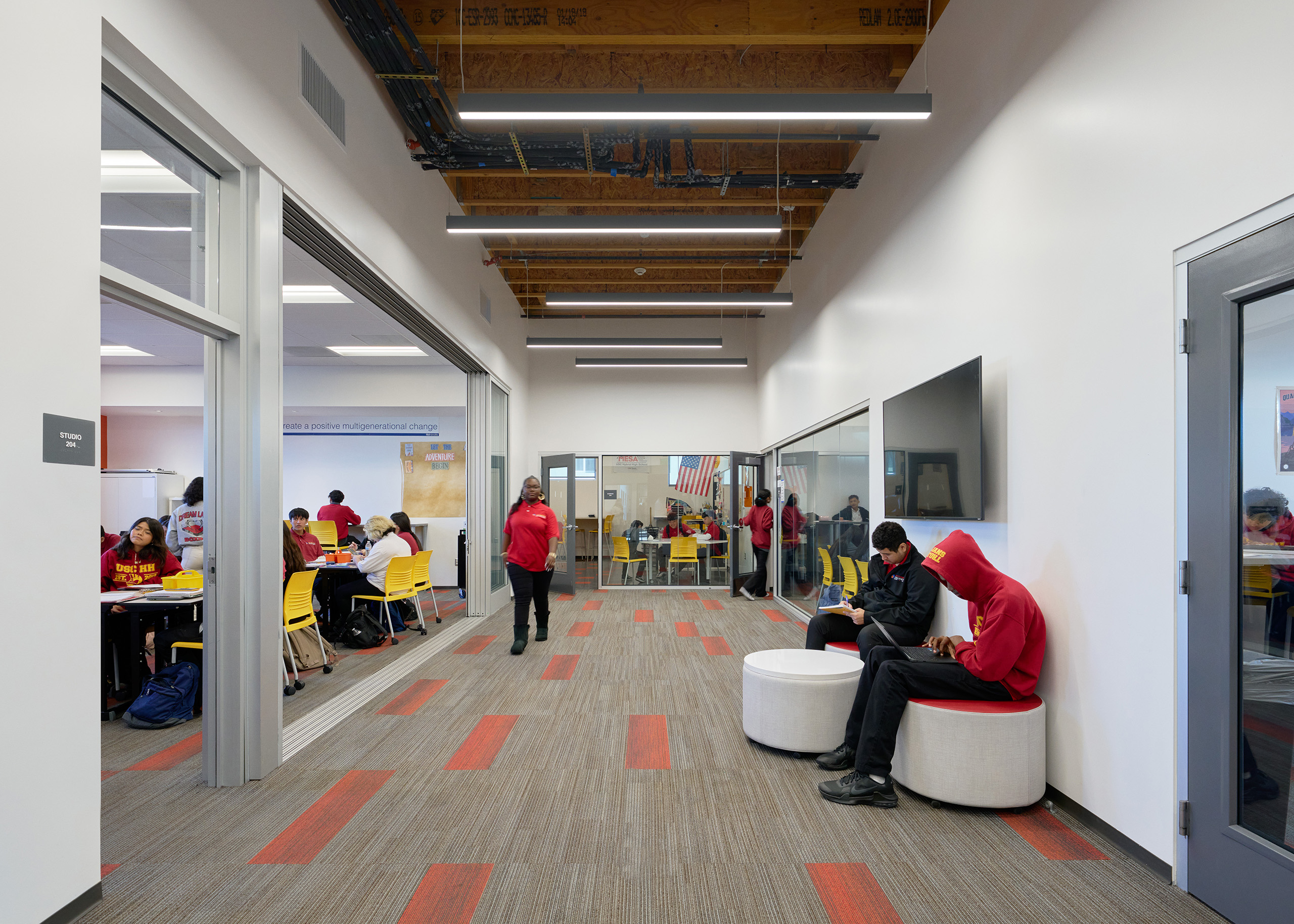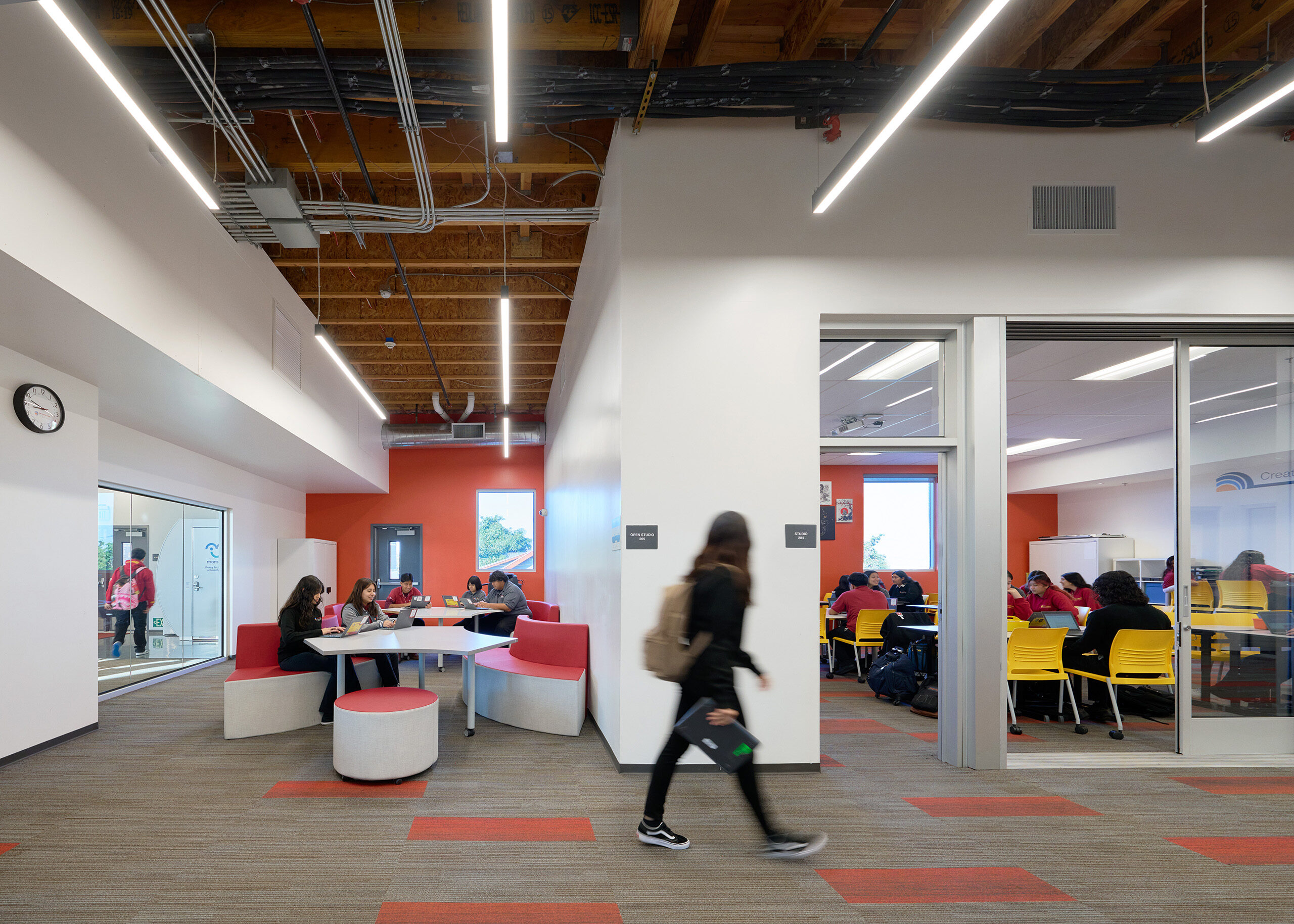 To support Ednovate’s learning model and curriculum, the schools feature “quad-pod” learning spaces, comprised of four classrooms or “pods” surrounding an open studio, for each grade level. The studio can be recruited on an impromptu basis by students electing to work independently or in small groups. It also serves as a daily meeting space for an advisory and can combine with one of the pods to accommodate a stand-up meeting for the whole grade. For the centerpiece of the schools, named the “townhall”, WKA designed a double-height senior studio as a place for the seniors to present their projects.