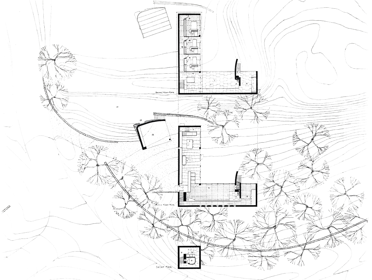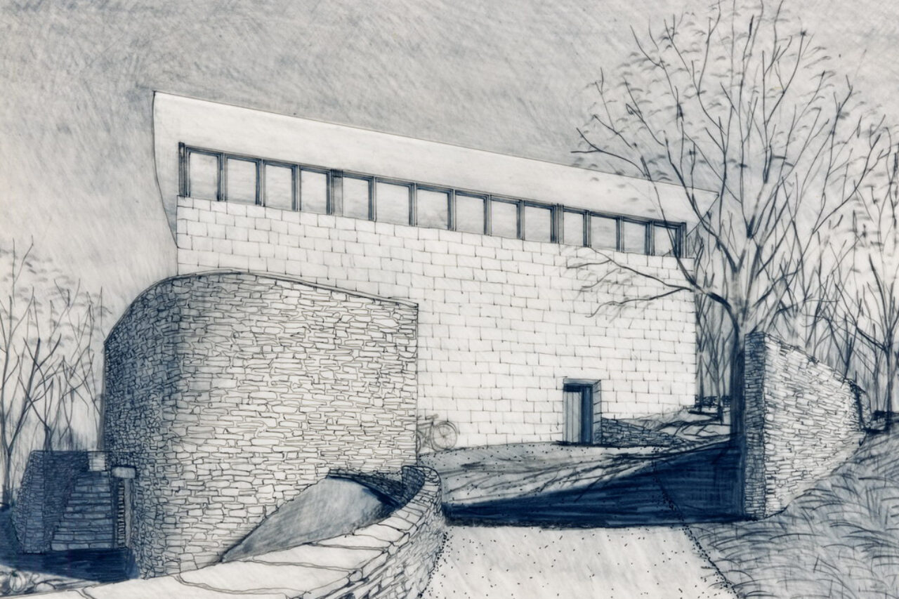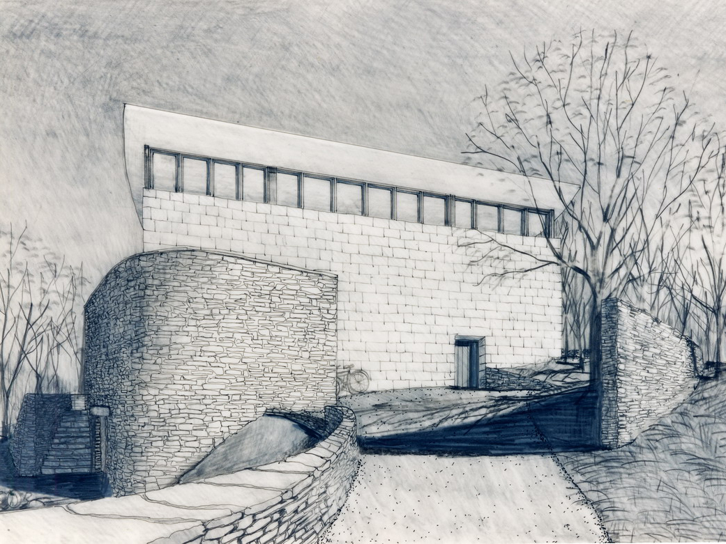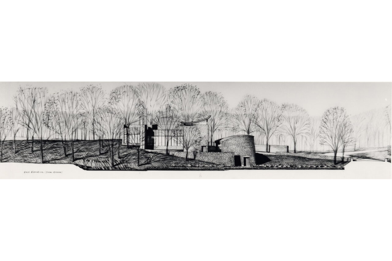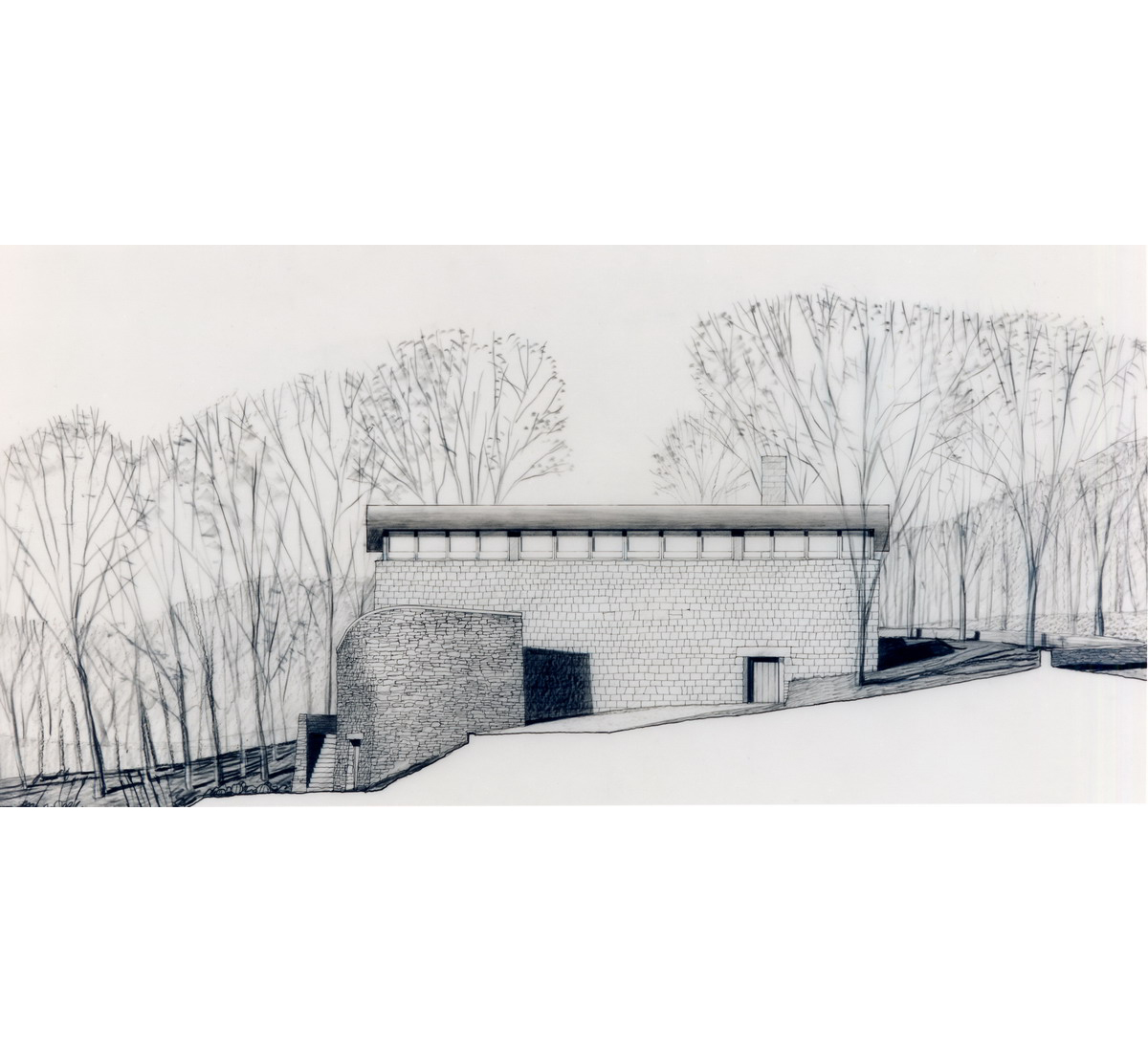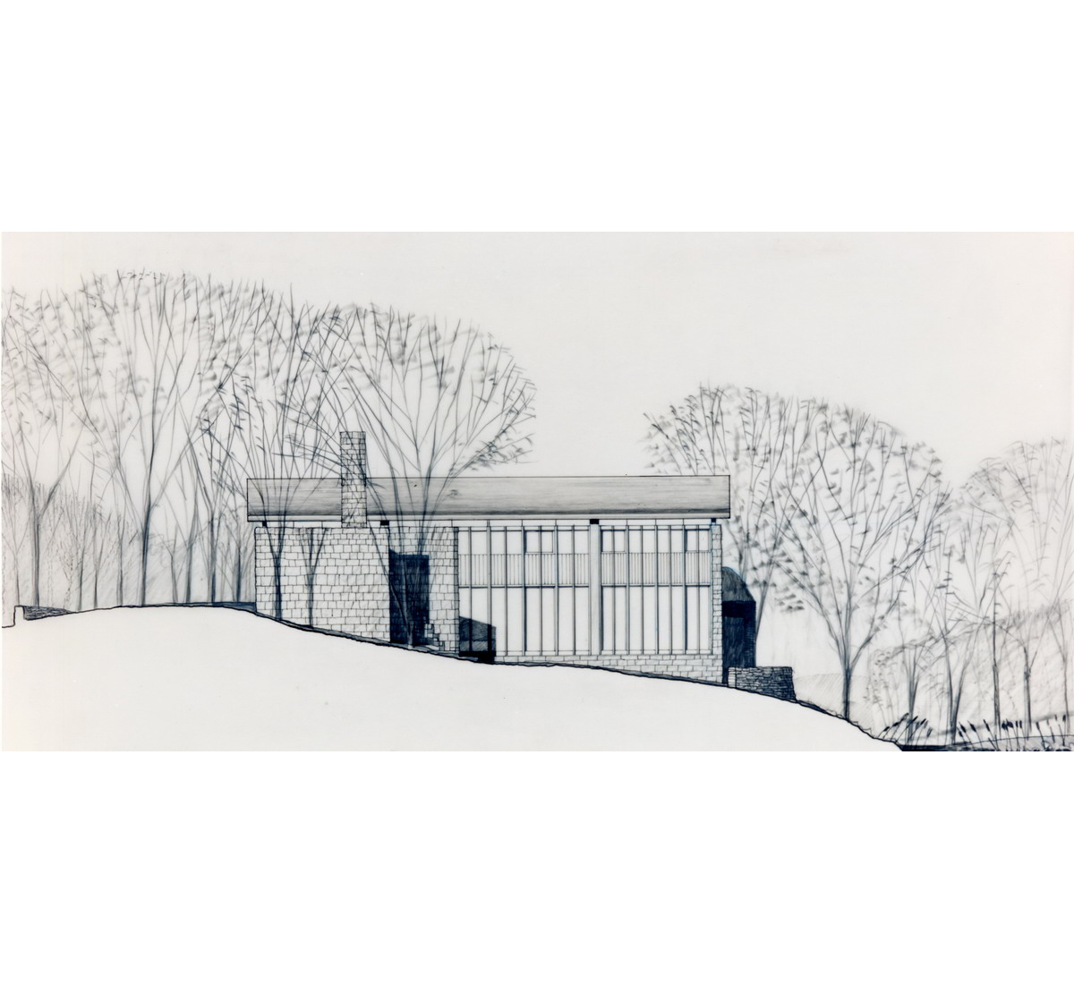 A Japanese developer invited eight architectural firms to design a speculative residence for a rare rolling tract of land southwest of Chicago, which was surrounded by the typical suburban overbuilt Tudors. Each firm agreed to limit the size of each house to four thousand square feet. A stone wall was to be built and shared by each site, to create a common link from site to site.