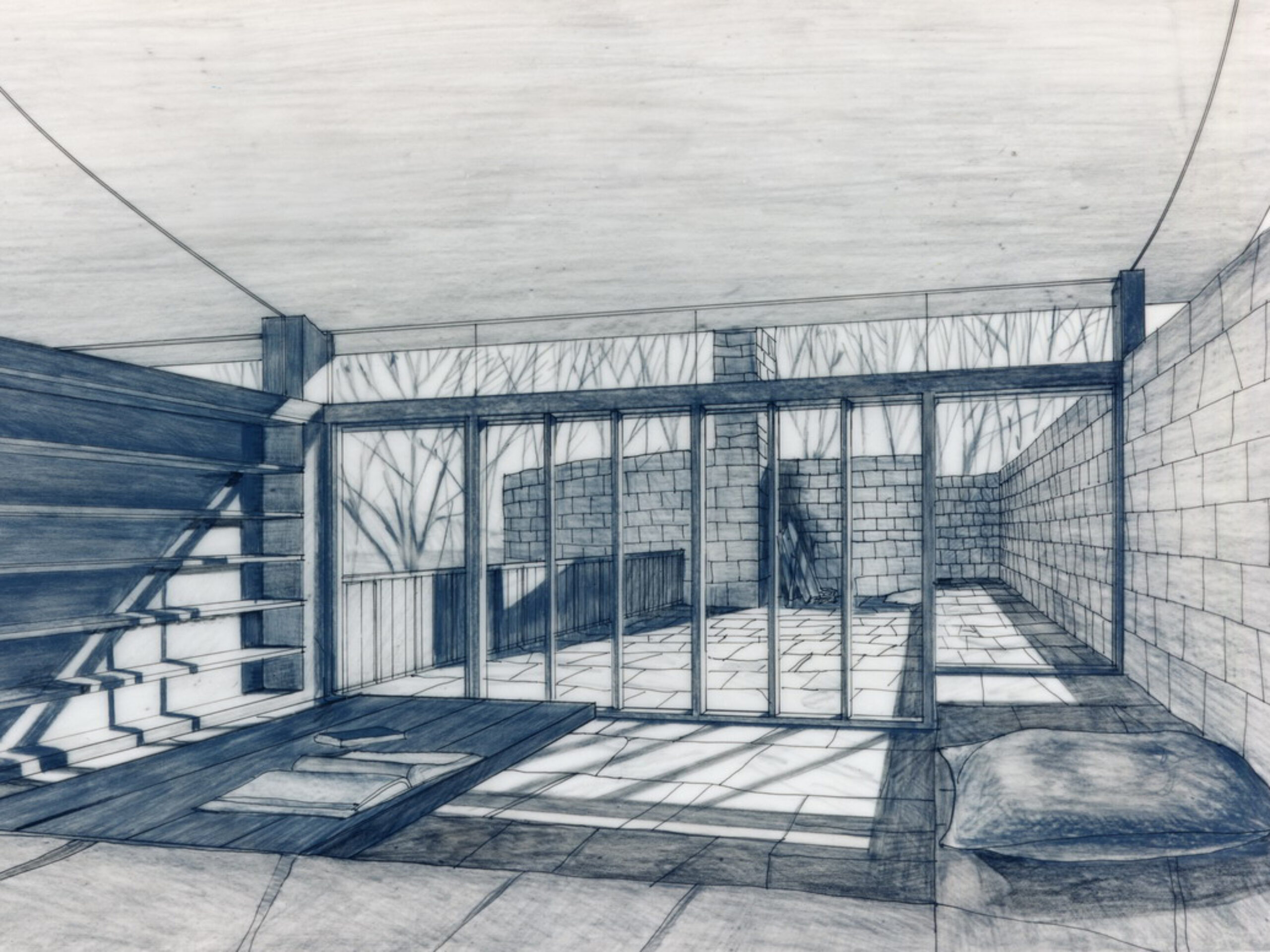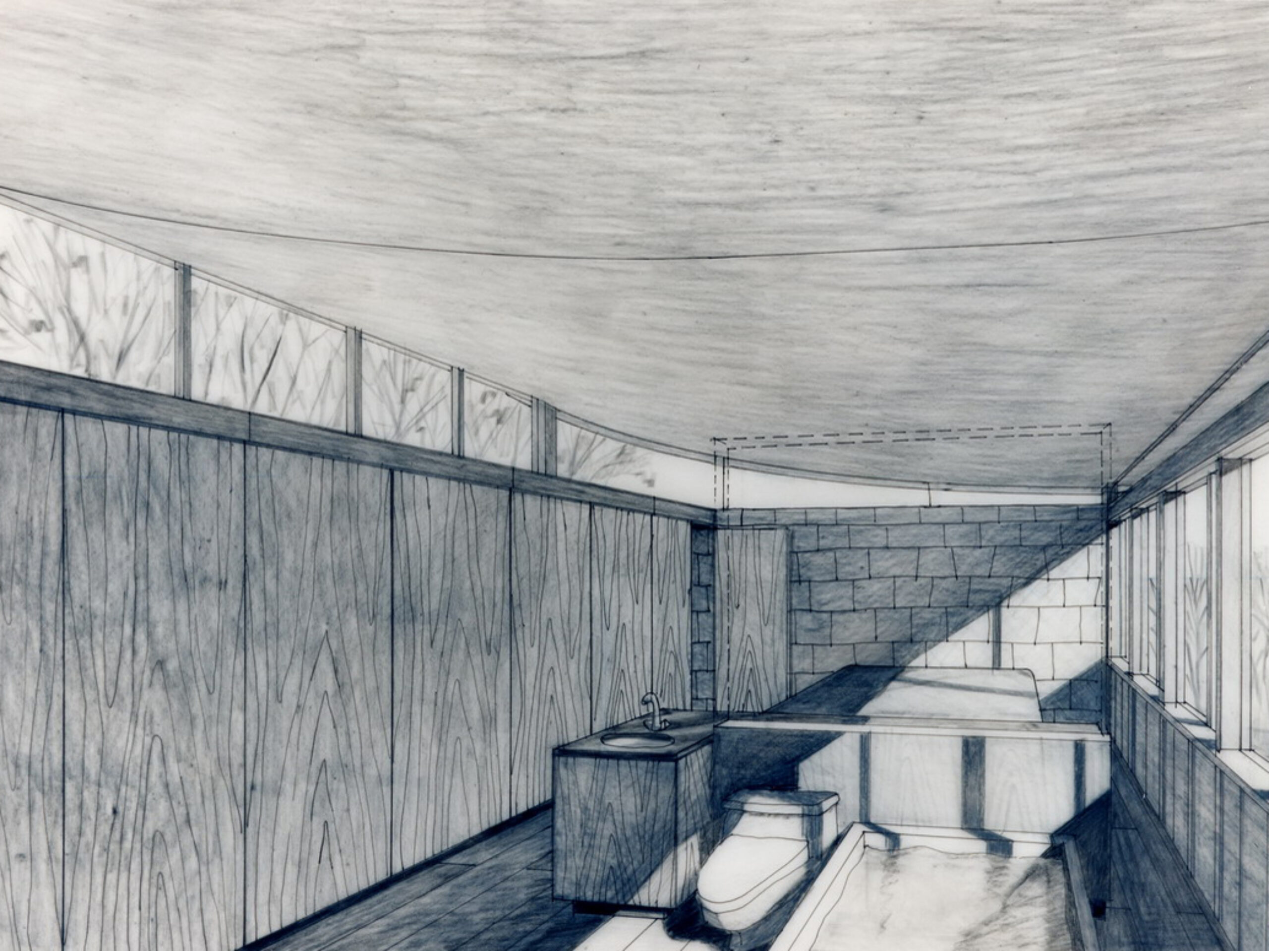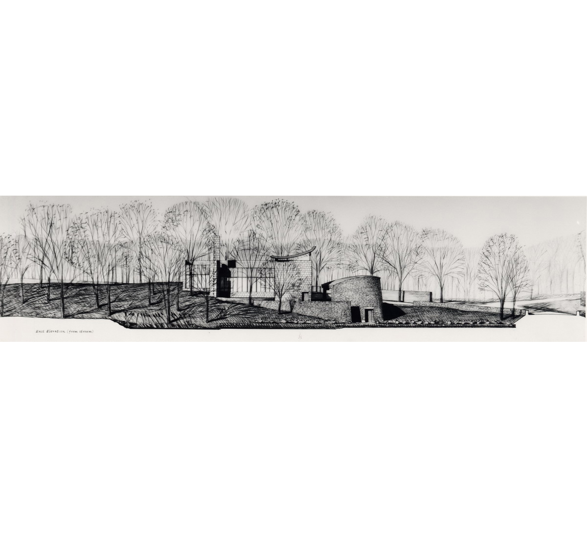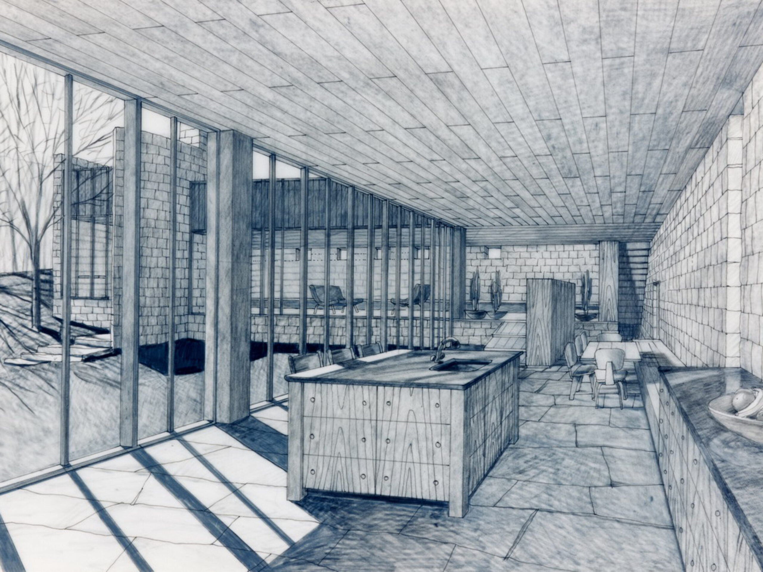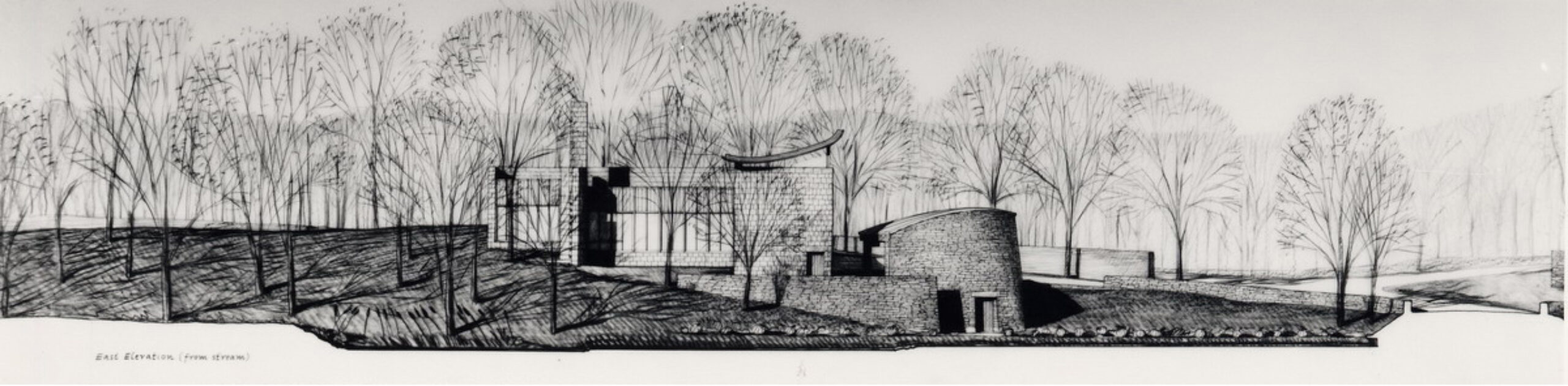 A Japanese developer invited eight architectural firms to design a speculative residence for a rare rolling tract of land southwest of Chicago, which was surrounded by the typical suburban overbuilt Tudors. Each firm agreed to limit the size of each house to four thousand square feet. A stone wall was to be built and shared by each site, to create a common link from site to site.
