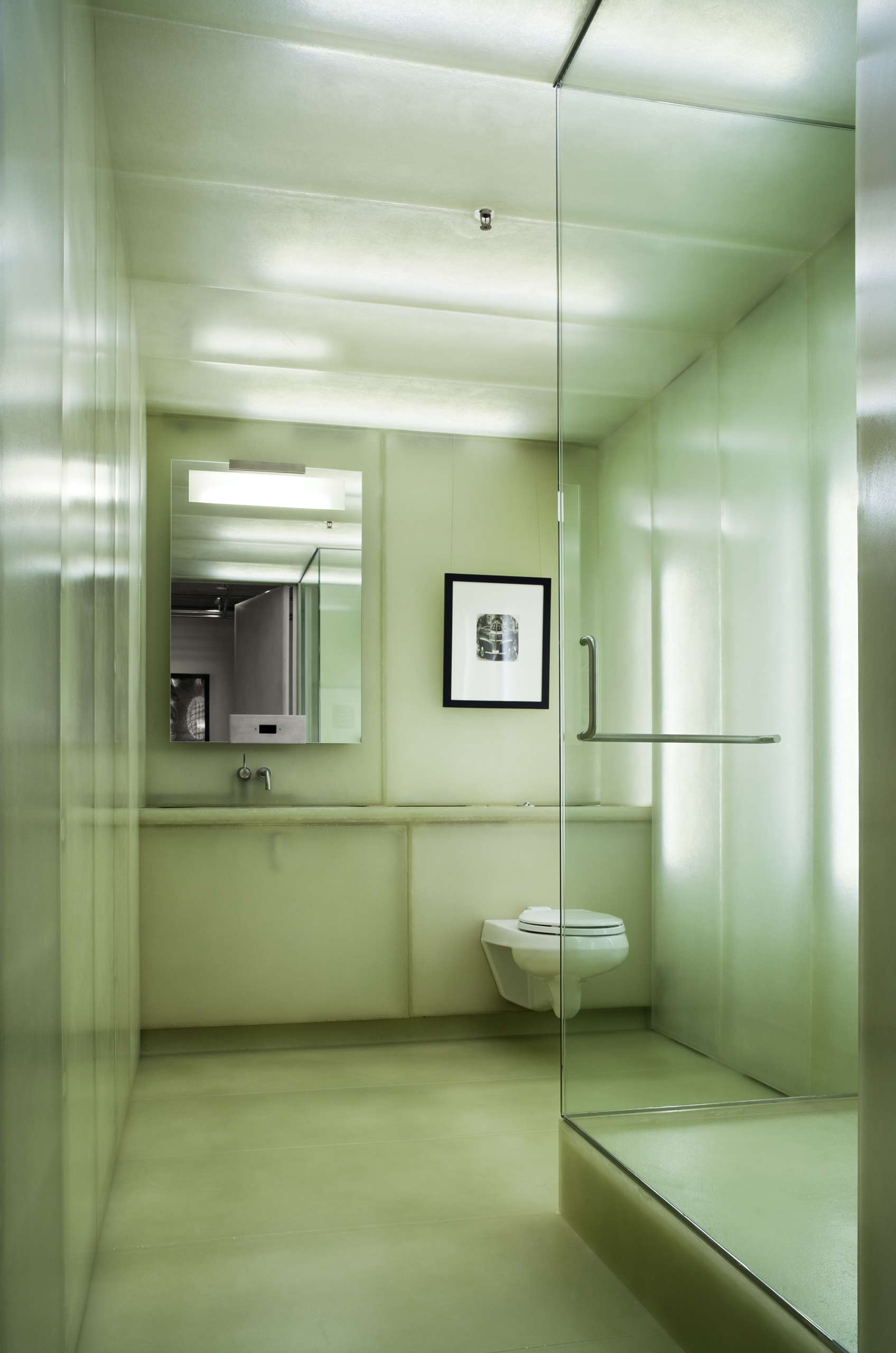 The service core houses the kitchen, bathroom and convertible bedroom. In contrast to the spare finishes of the gallery space, the service core is finished with rich and visually tactile materials so that even the service spaces provide a sensory experience; polished red lacquered millwork at the kitchen, sapele wood lines the bedroom, translucent fiberglass lines the glowing bathroom.