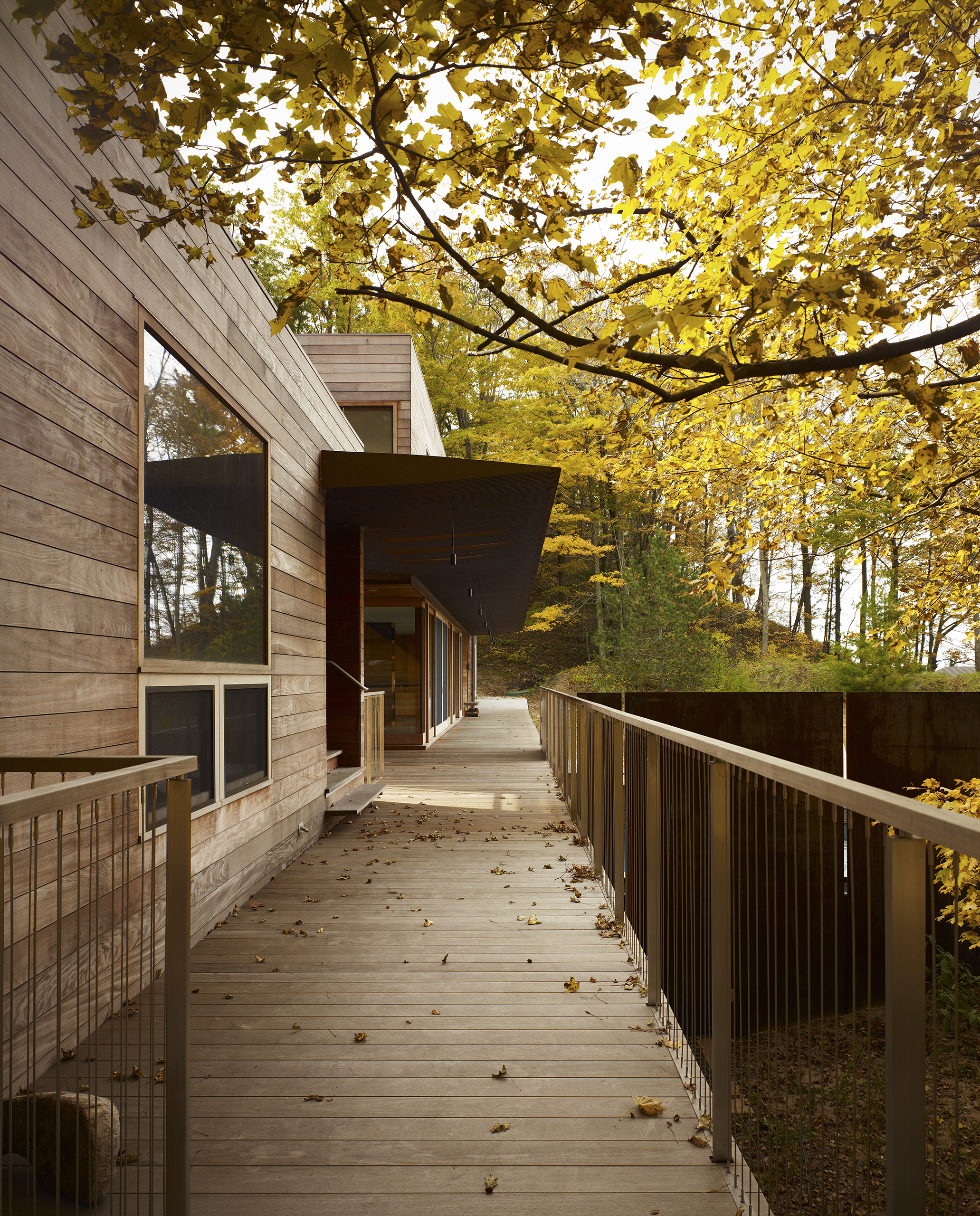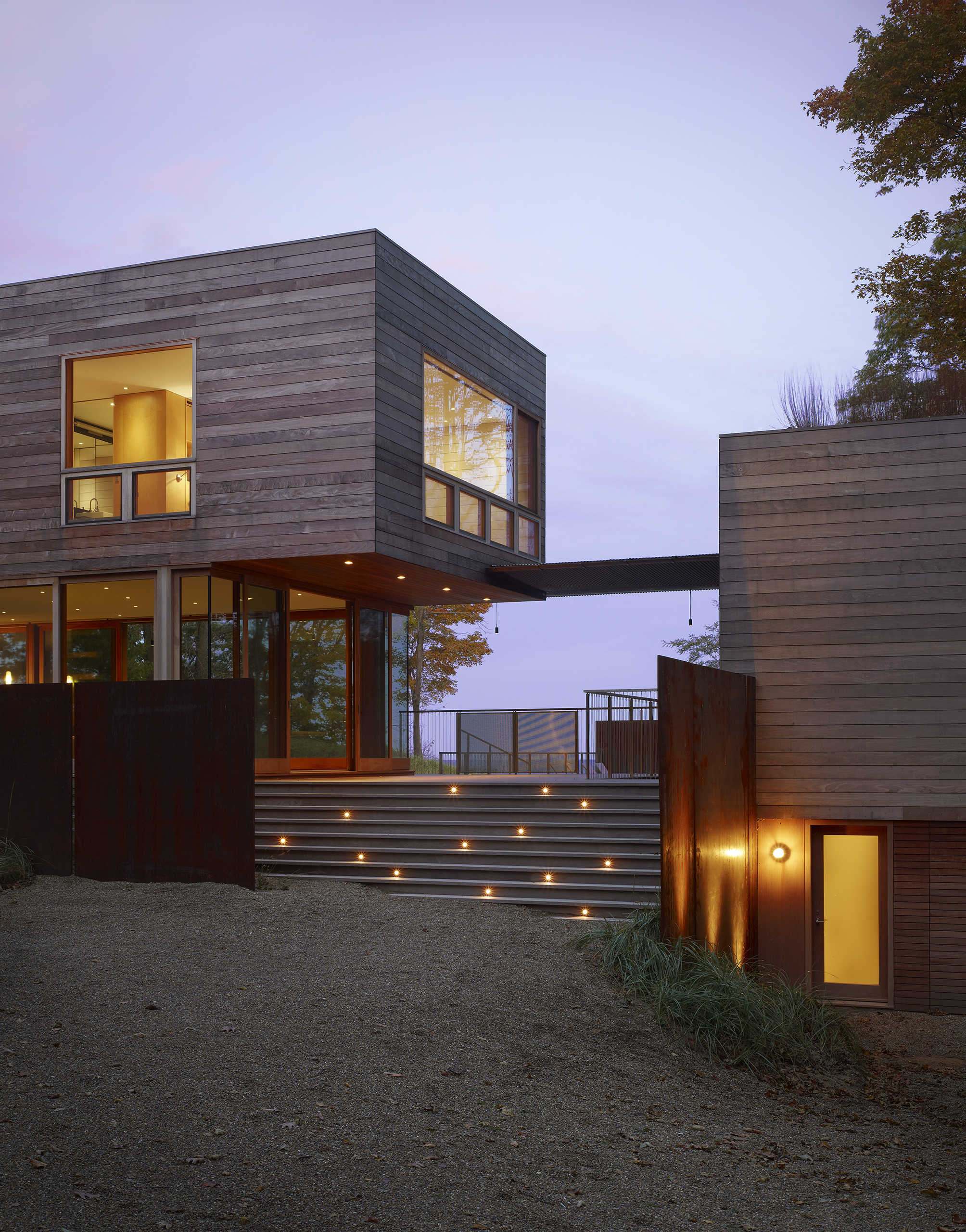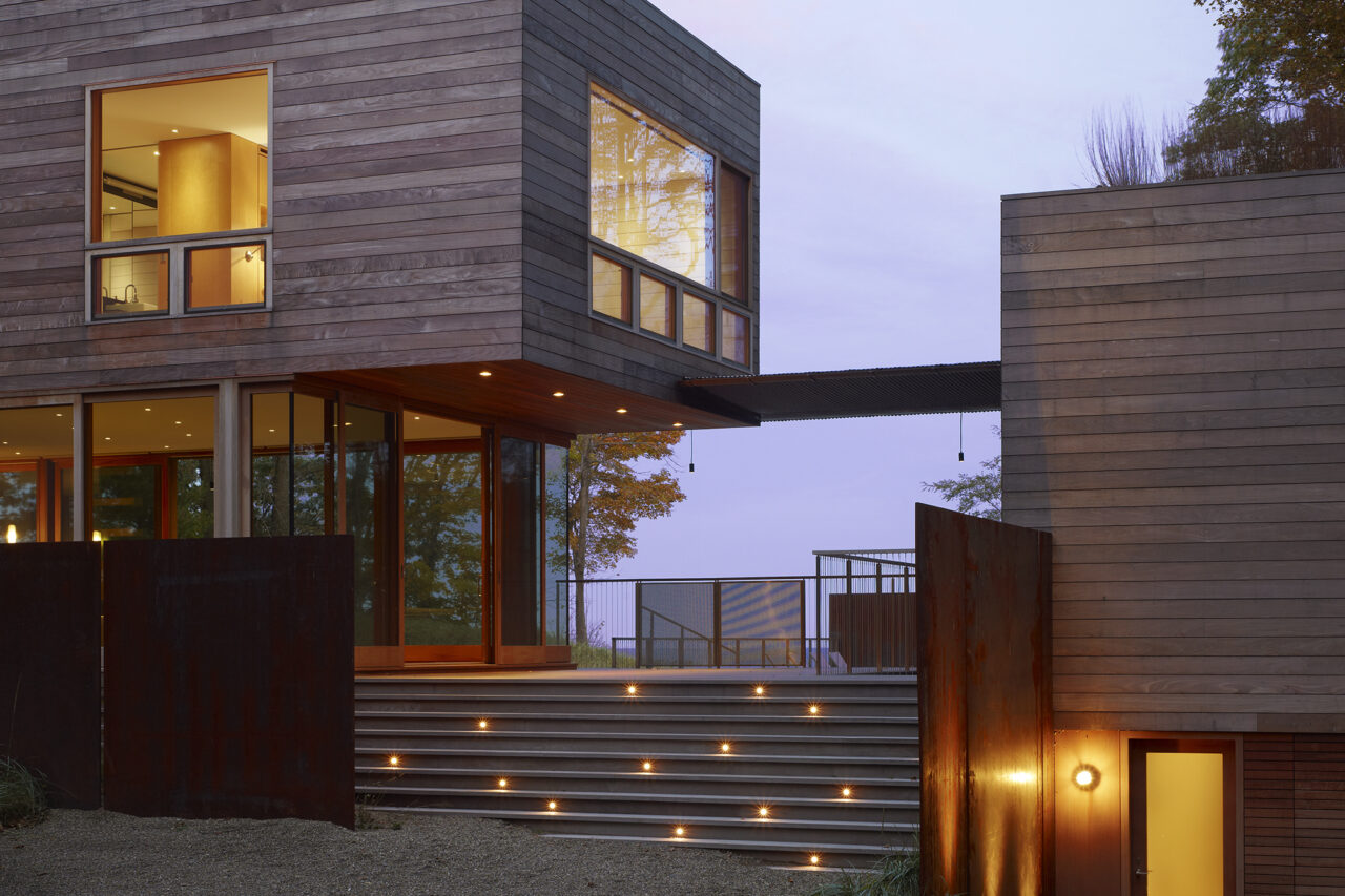The family’s desire was for a building which would immerse them in the landscape with expansive views of the lake, prairie grass and wooded landscape while inside and out. The exterior materials consisting of ipe, copper, weathering and stainless steel were selected for their longevity and low maintenance characteristics as well as their beauty.