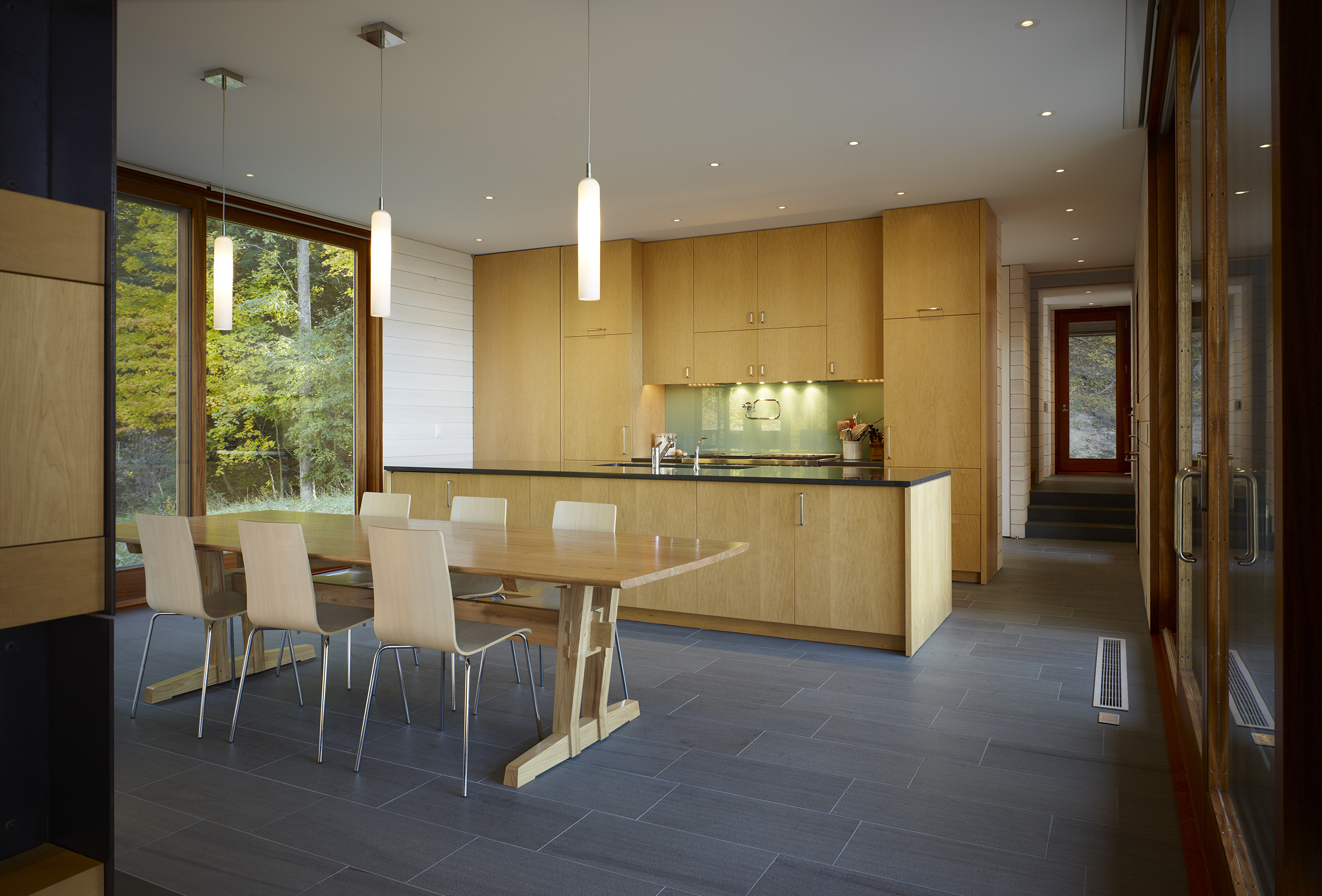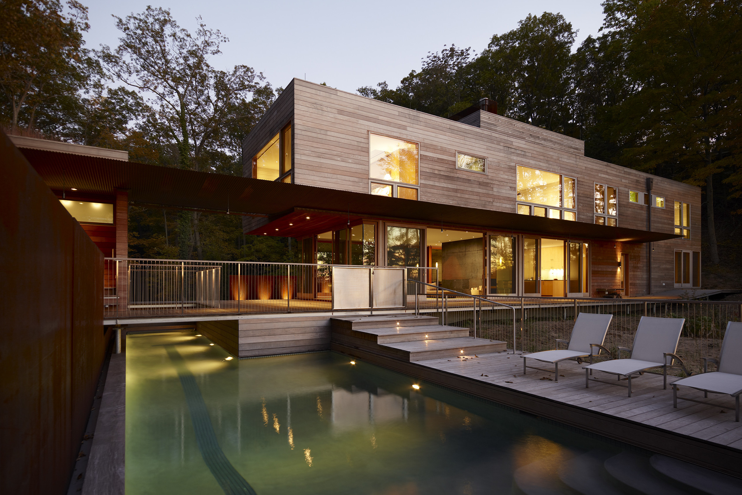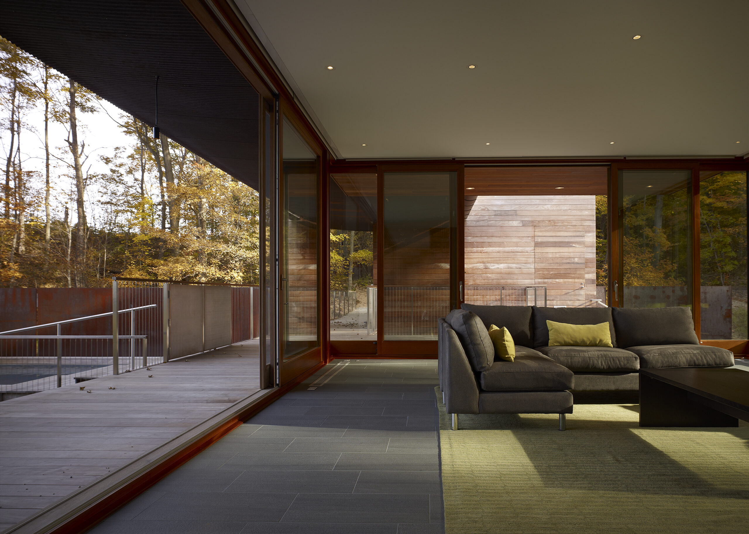 The family’s desire was for a building which would immerse them in the landscape with expansive views of the lake, prairie grass and wooded landscape while inside and out. The exterior materials consisting of ipe, copper, weathering and stainless steel were selected for their longevity and low maintenance characteristics as well as their beauty.