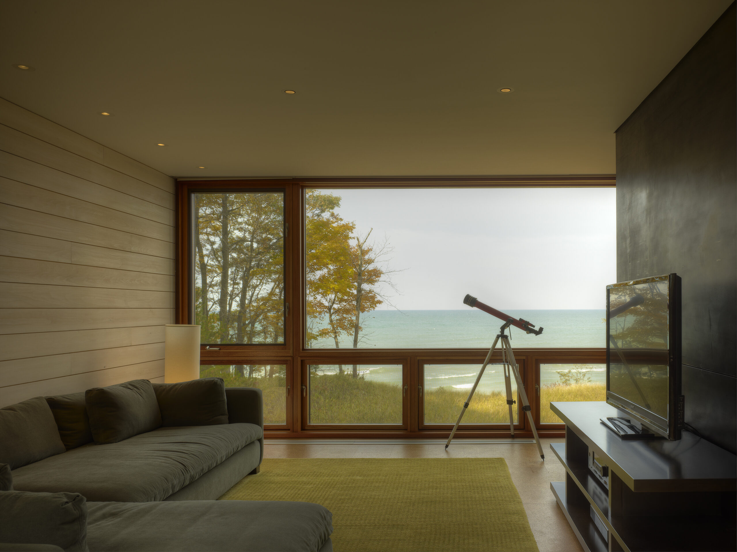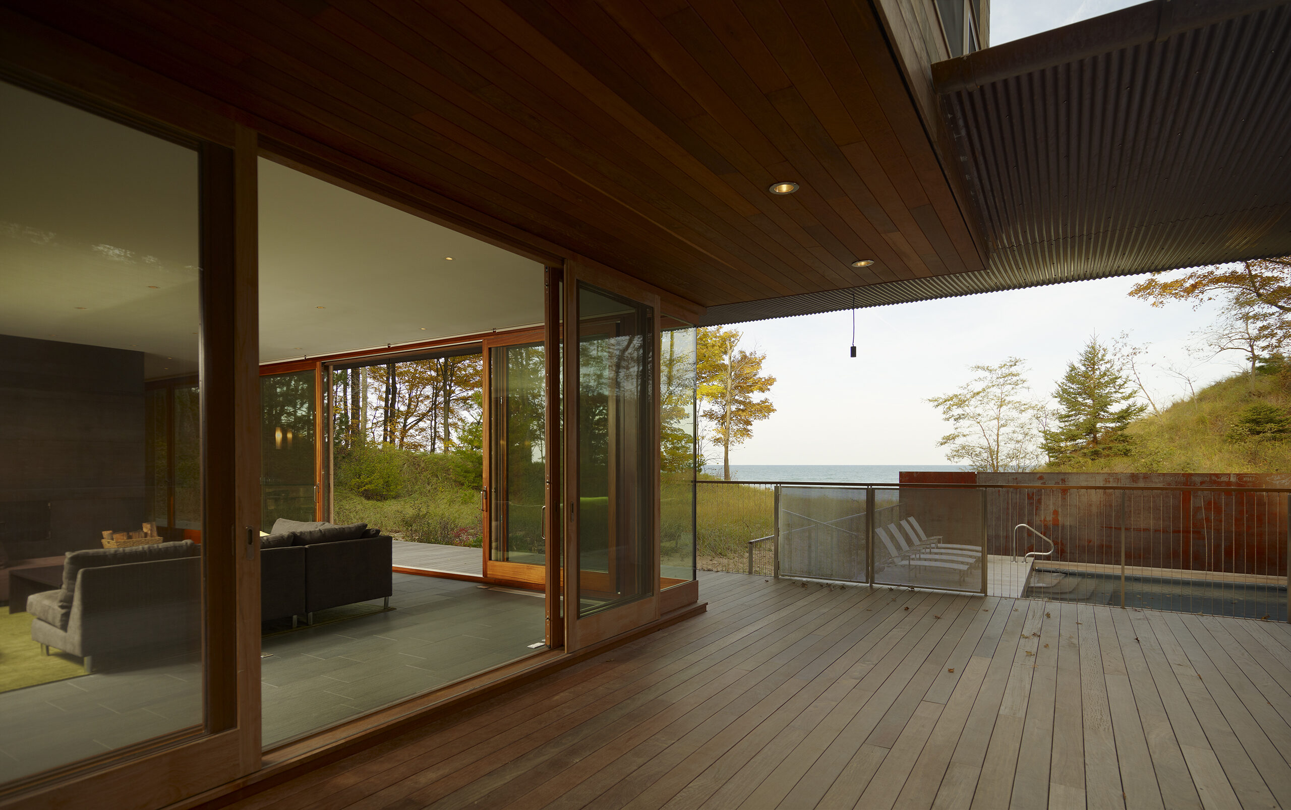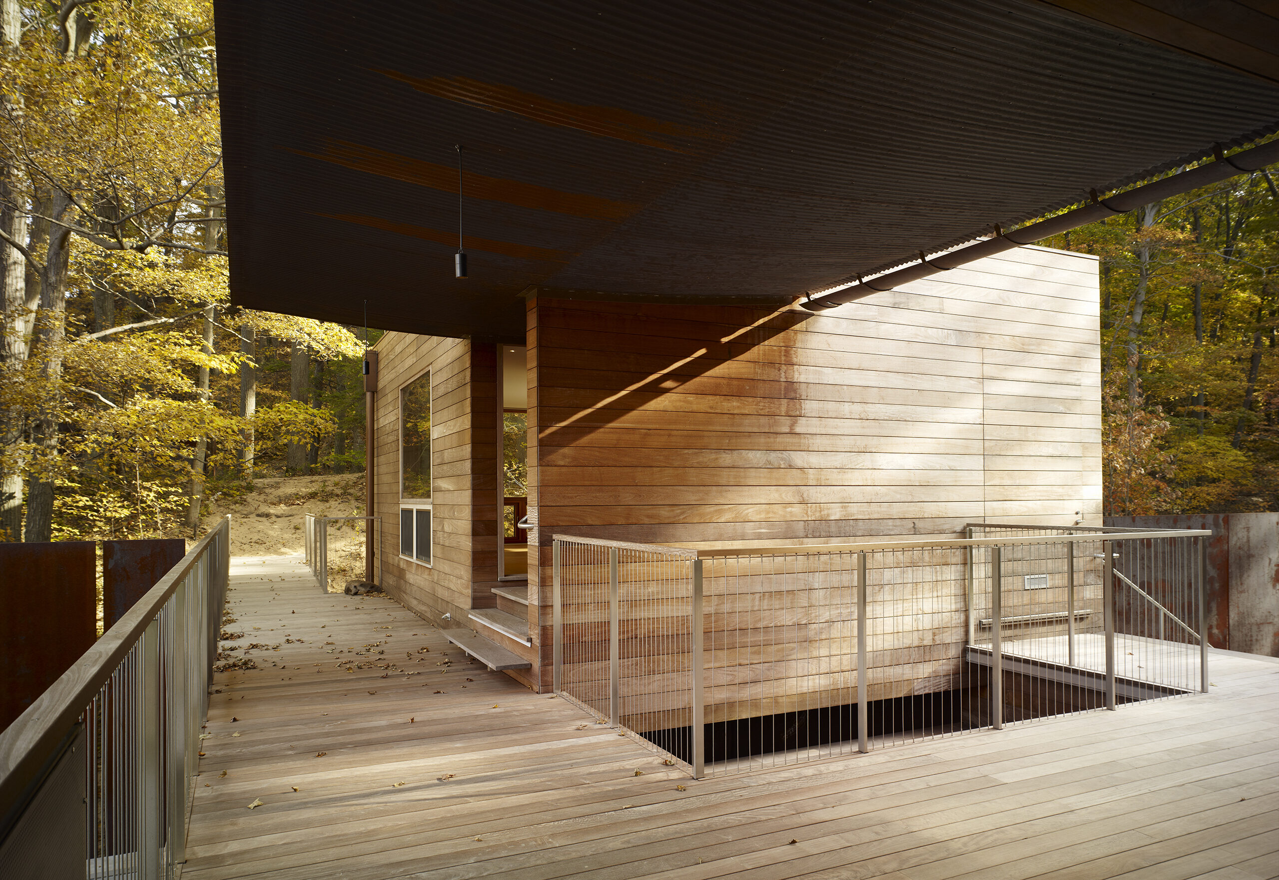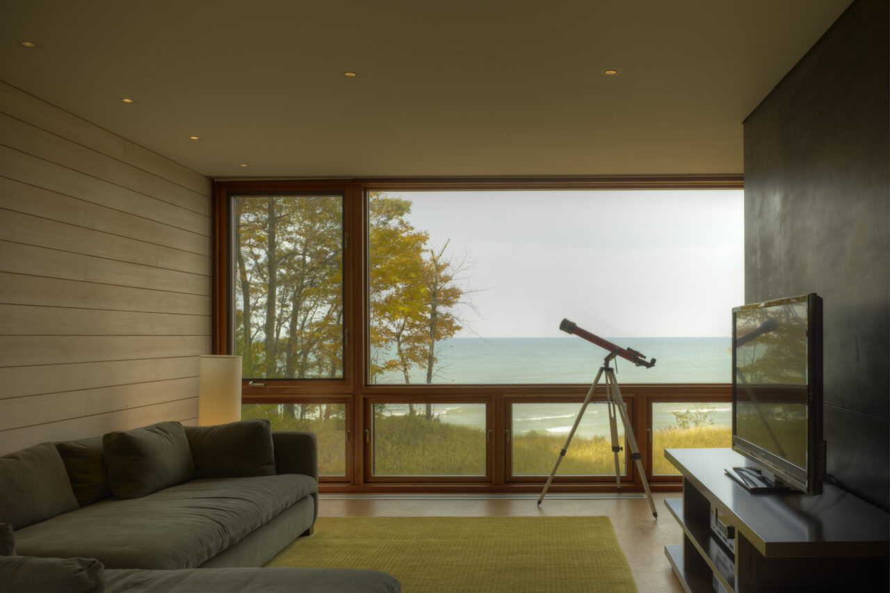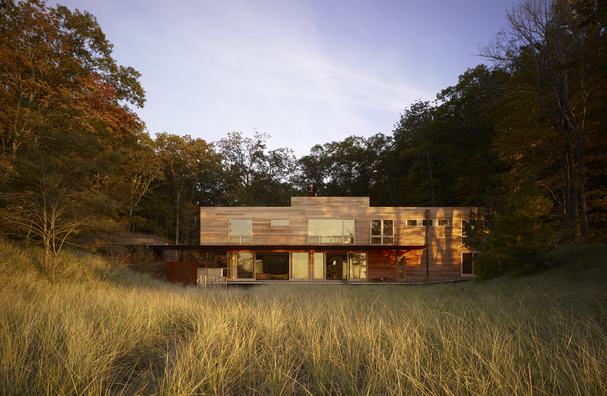 Designed as a year-round retreat for a Chicago family of six, the residence bridges a valley between two dunes on the shores of Lake Michigan in Michigan. Siting of the structure was determined in large part by constraints set forth by the Michigan Department of Environmental Quality with its intent of protecting the dunes and construction within them.