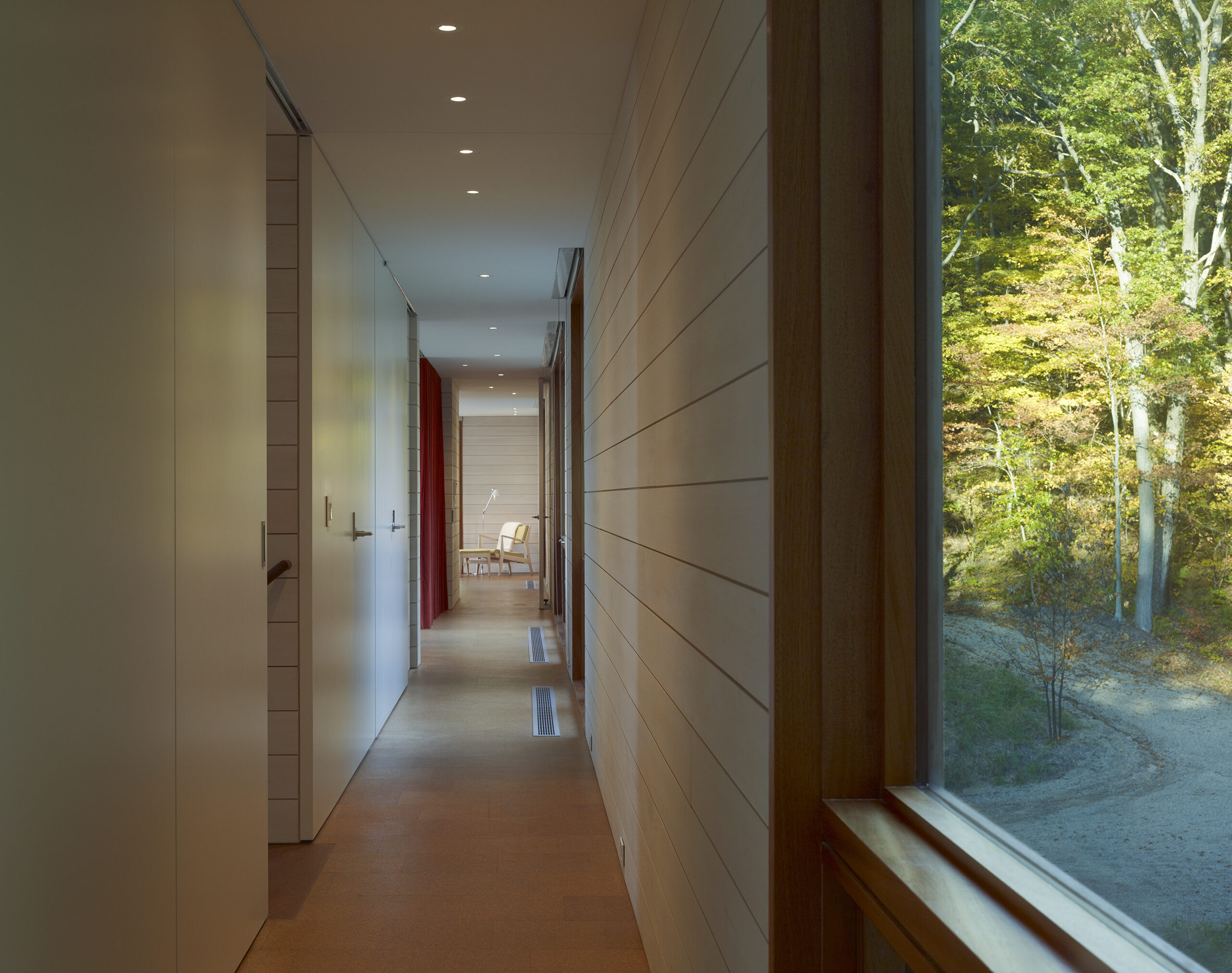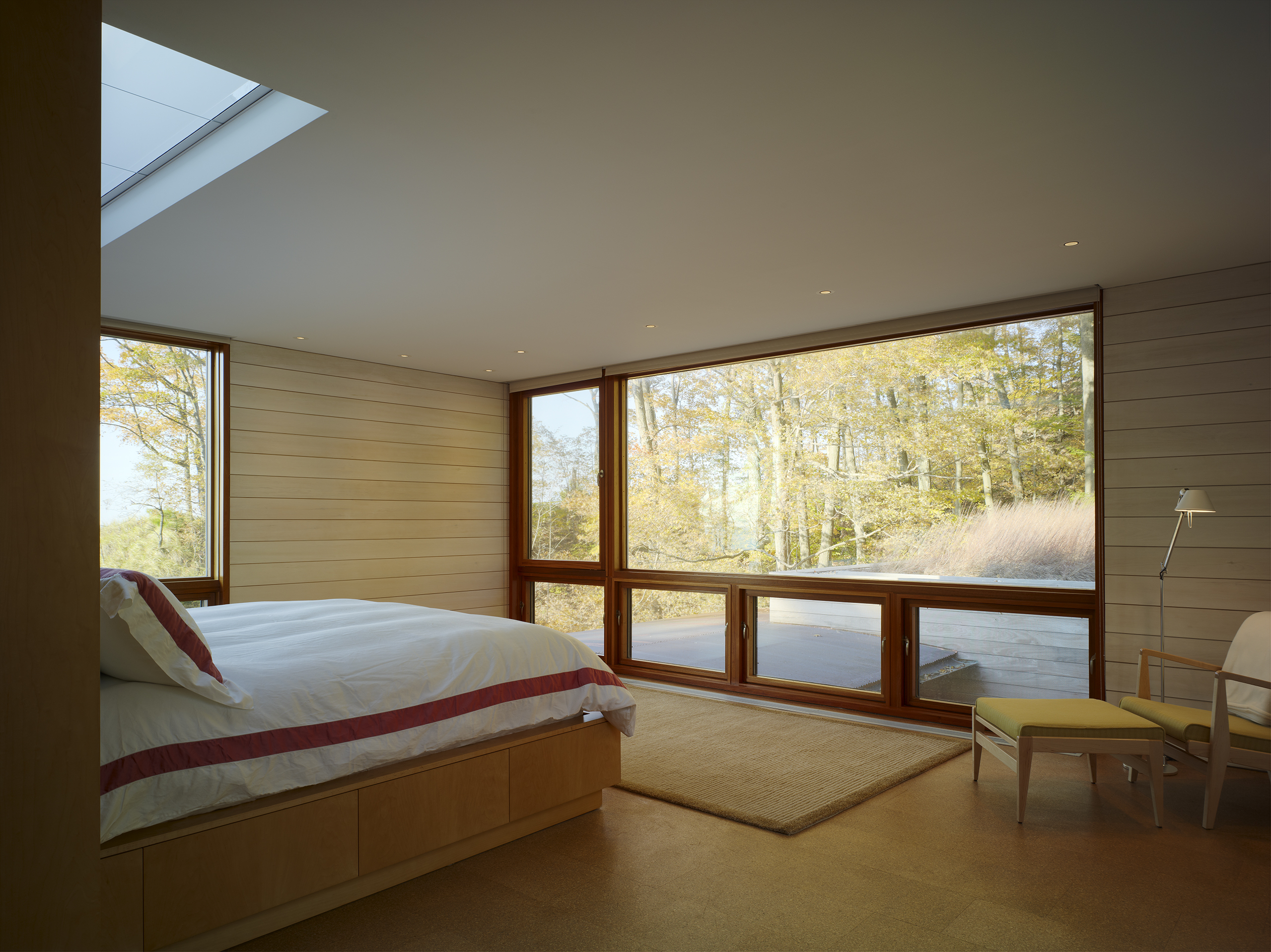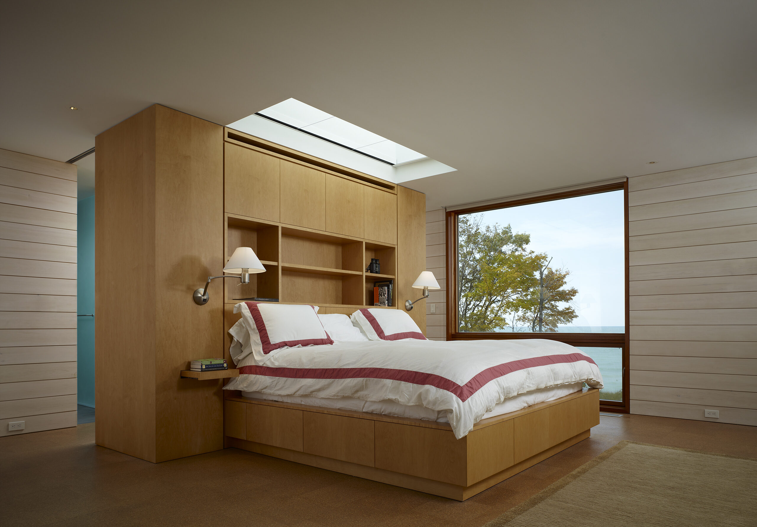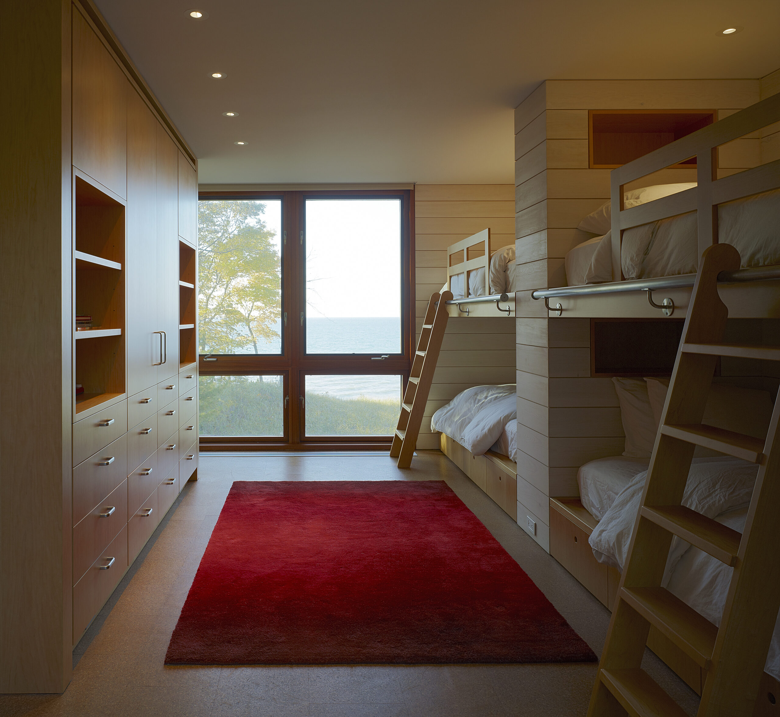 Designed as a year-round retreat for a Chicago family of six, the residence bridges a valley between two dunes on the shores of Lake Michigan in Michigan. Siting of the structure was determined in large part by constraints set forth by the Michigan Department of Environmental Quality with its intent of protecting the dunes and construction within them.