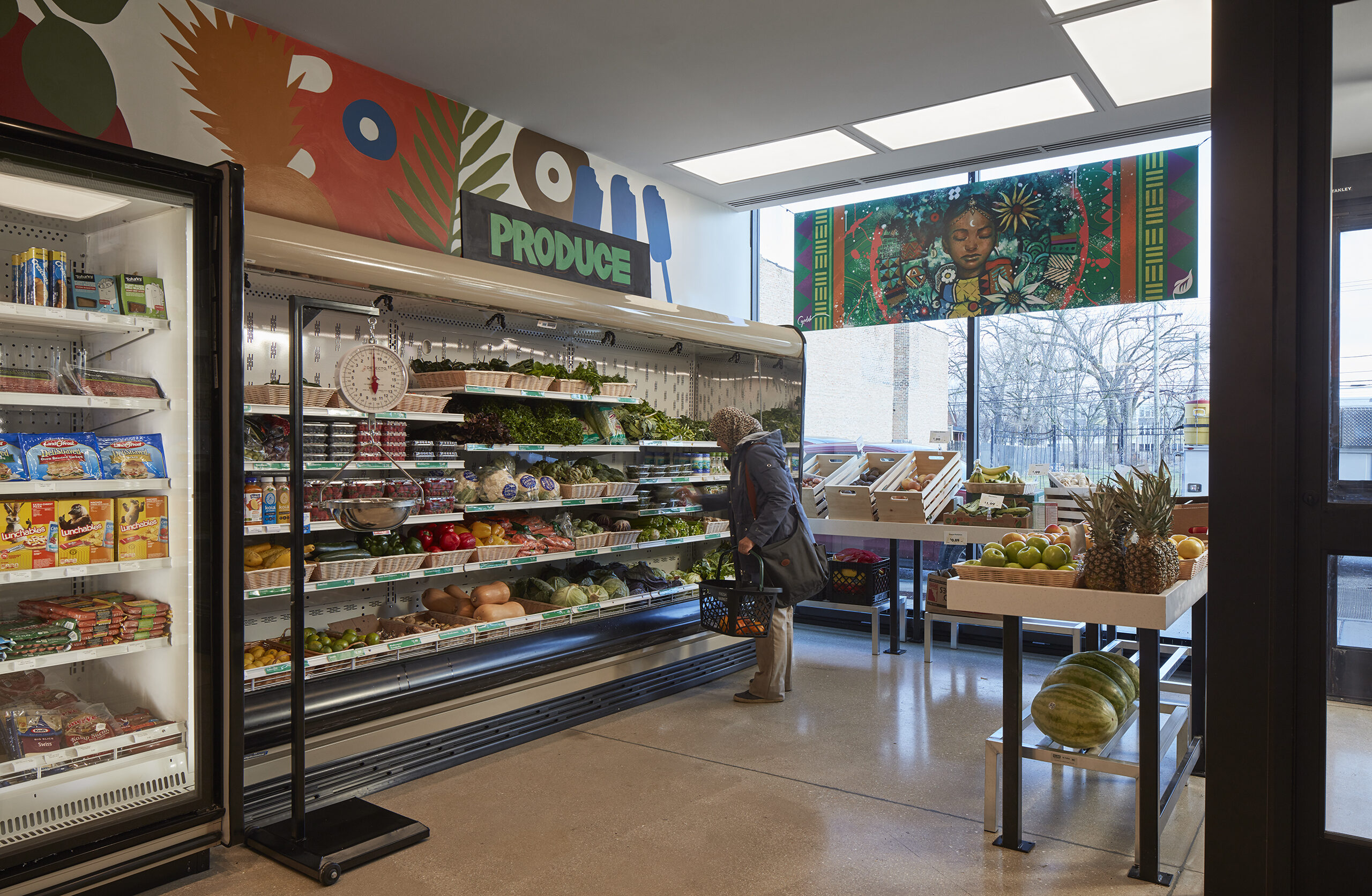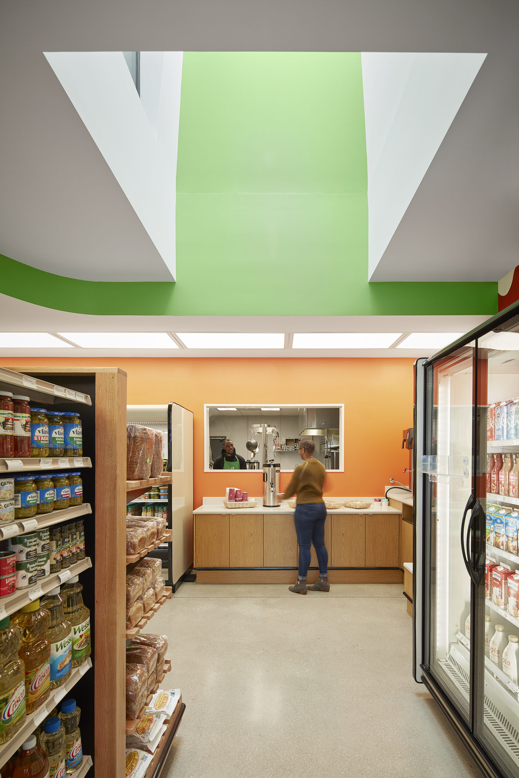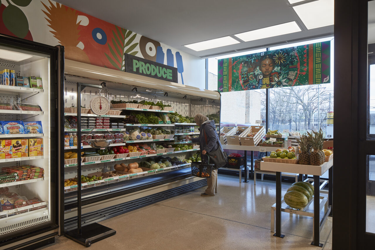 Unlike traditional corner stores with high shelving and extensive security cameras, taller items are placed along the walls, promoting open sightlines and face-to-face interaction. Inside, West African fabrics were used to develop a color palette, signaling this isn’t a generic high-end grocery; it is by and for Englewood.