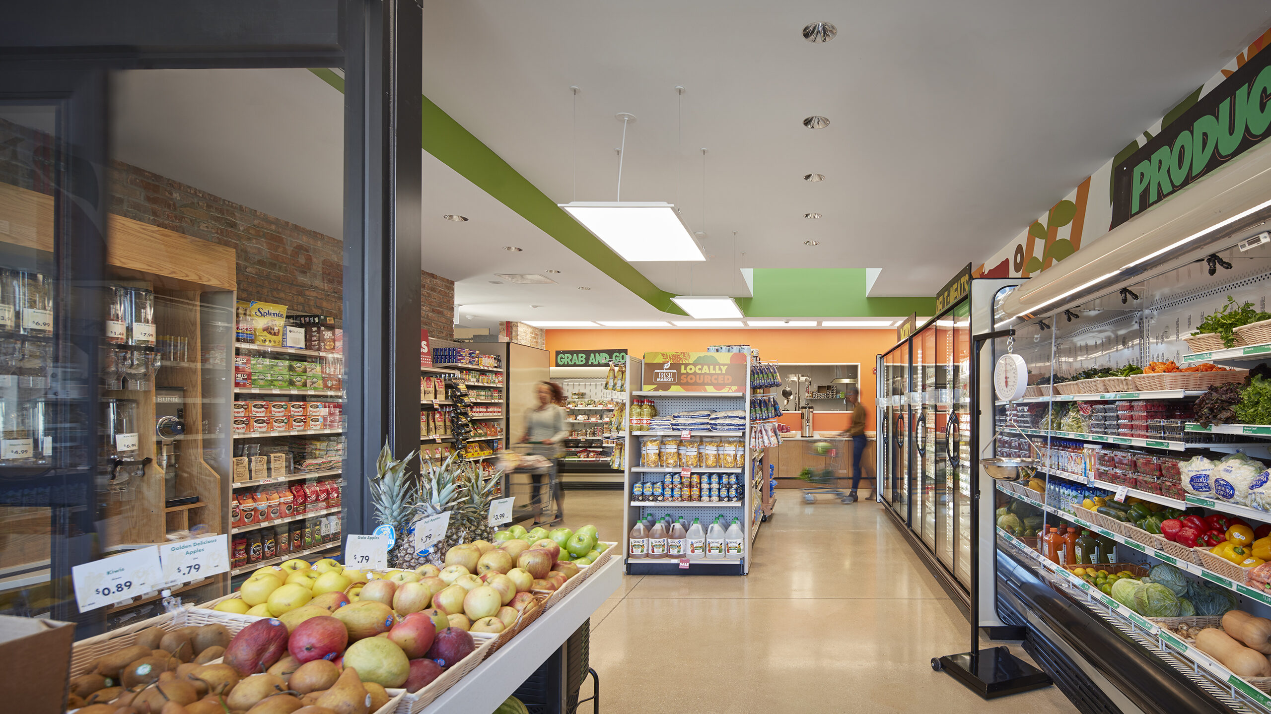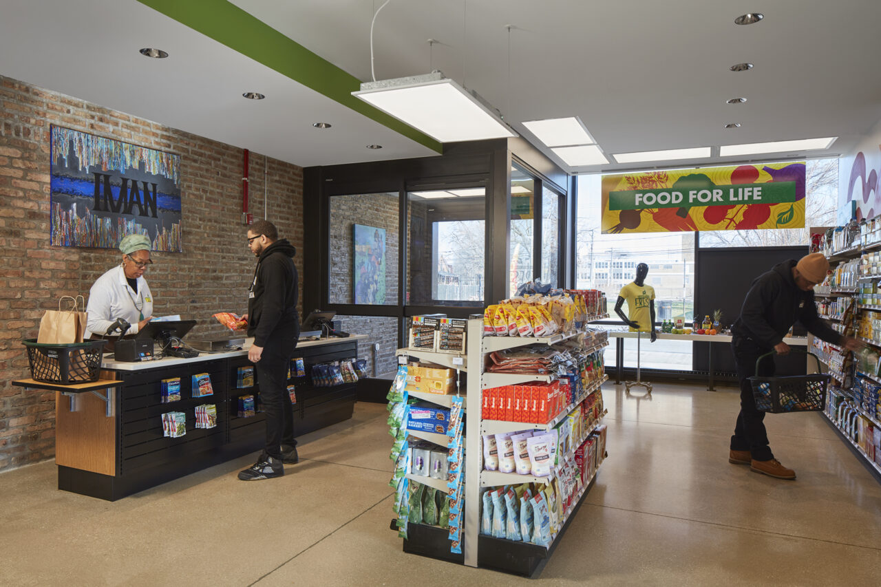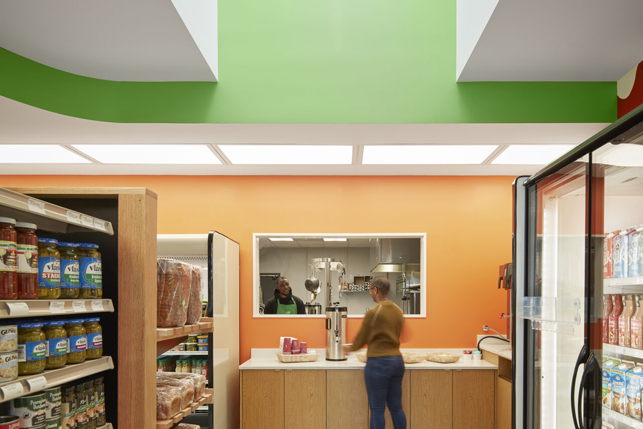 Unlike traditional corner stores with high shelving and extensive security cameras, taller items are placed along the walls, promoting open sightlines and face-to-face interaction. Inside, West African fabrics were used to develop a color palette, signaling this isn’t a generic high-end grocery; it is by and for Englewood.